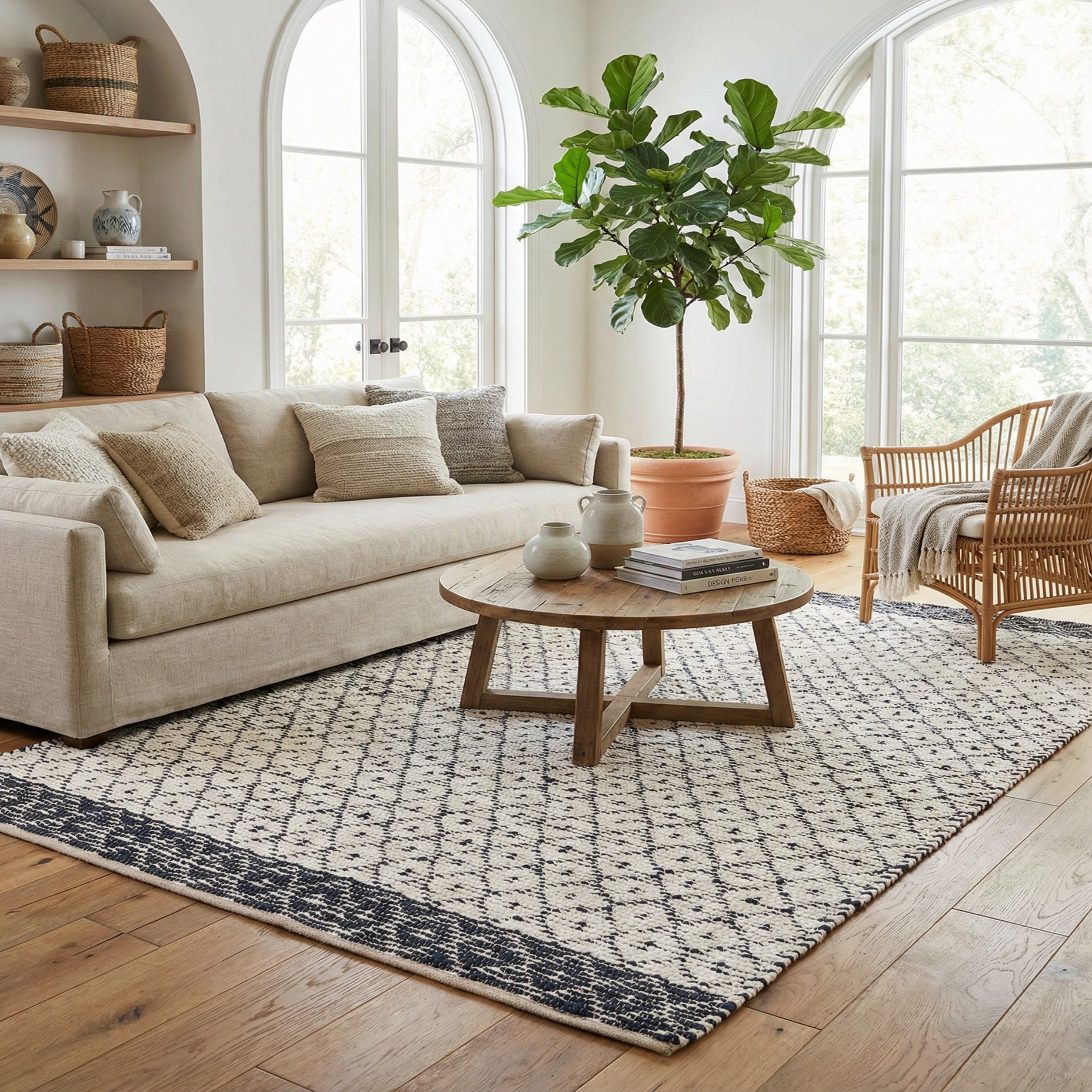 This rug works well in relaxed, lived-in interiors: pair it with light wood furniture and rattan accents for a coastal or farmhouse vibe, layer it under a natural-wood dining table to add pattern without heavy color, or use it in a living room to ground a neutral sofa and navy throw pillows. It also fits clean, modern spaces where a graphic, low-profile rug brings warmth without overwhelming the scheme.