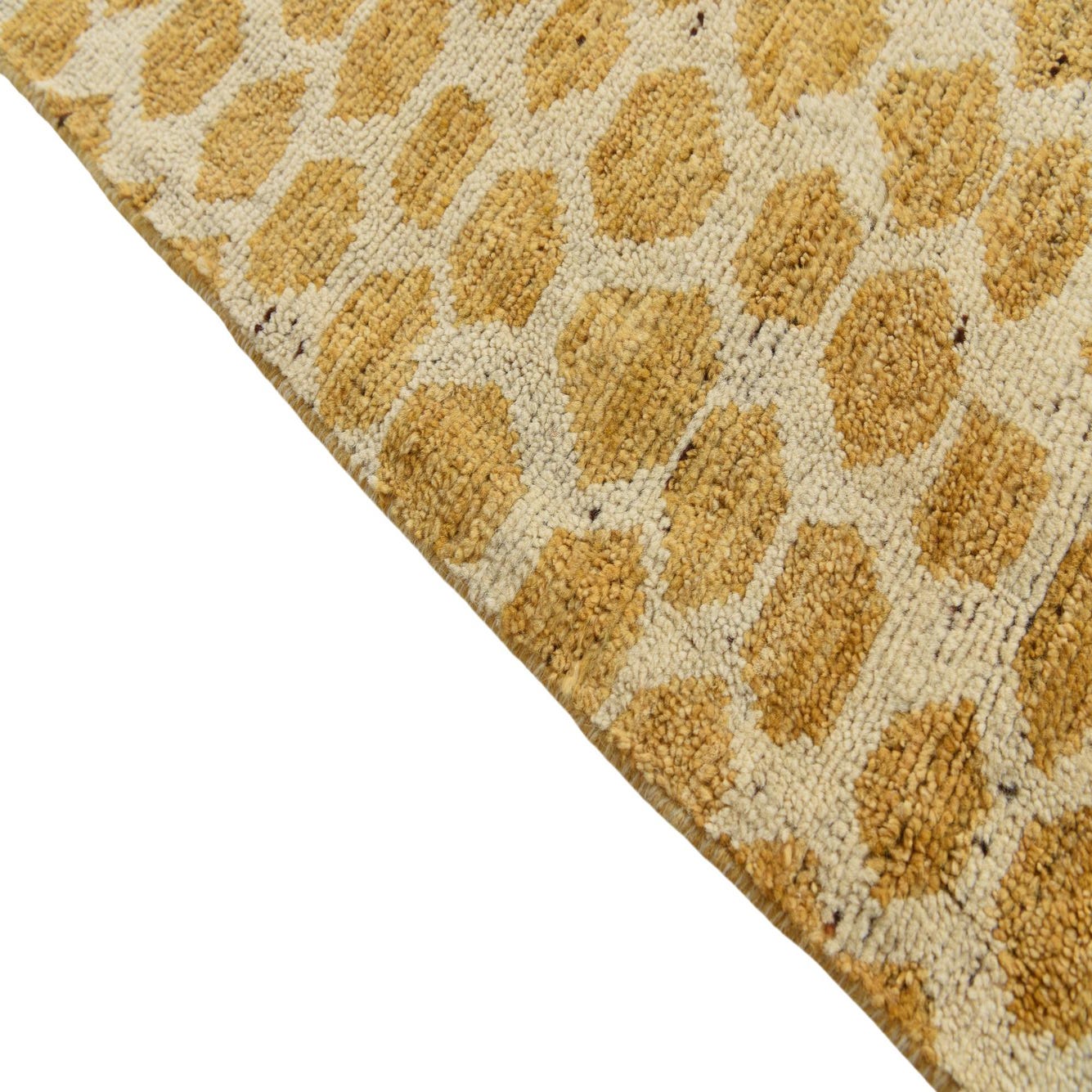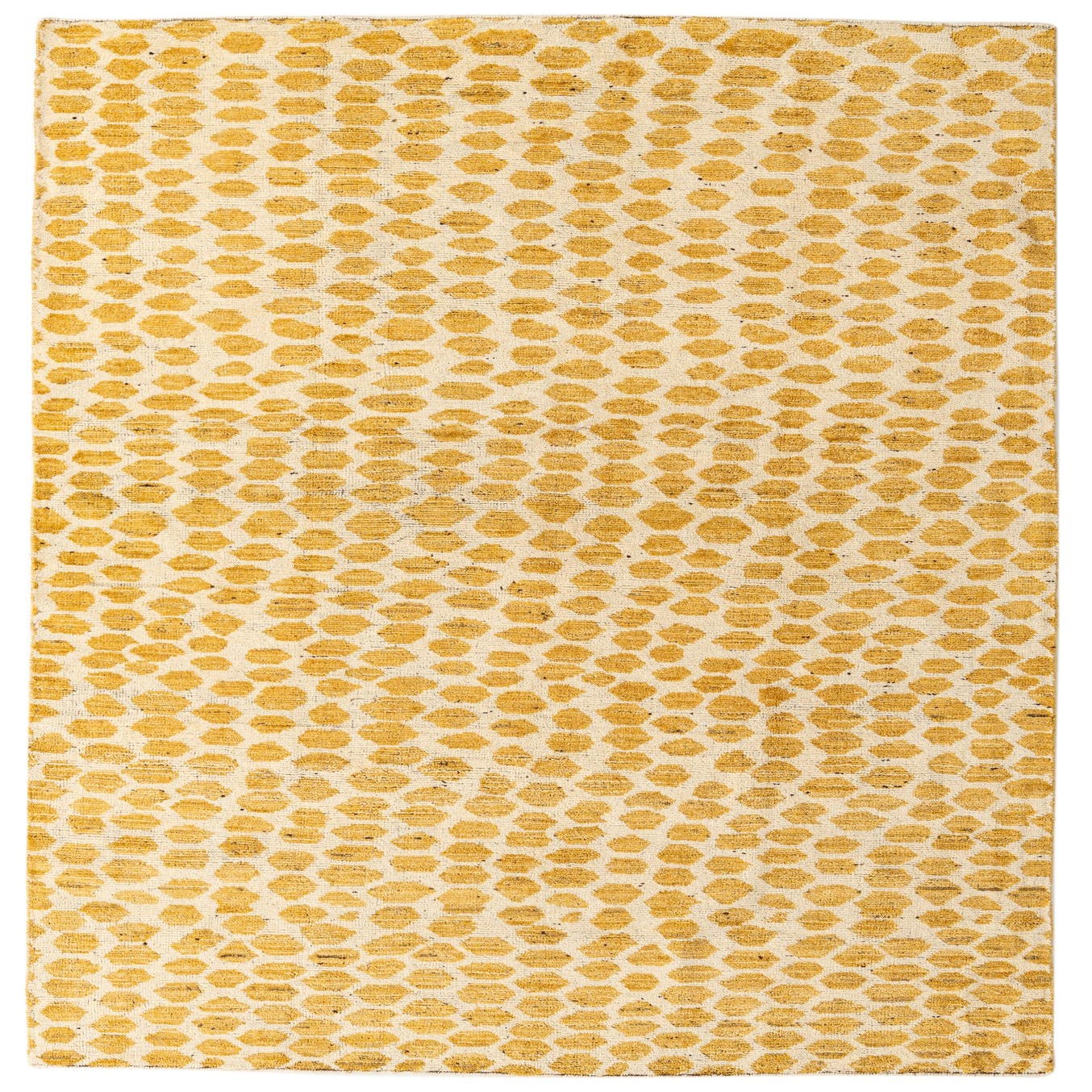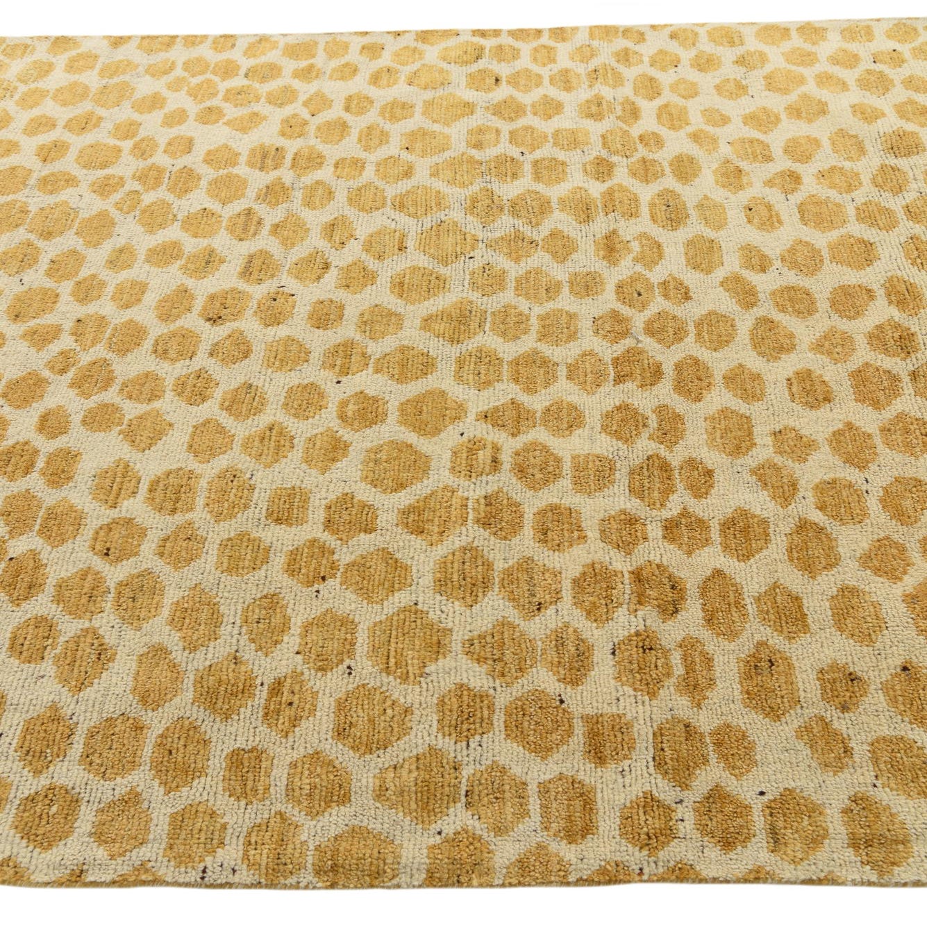 A 6x9 rectangular ivory and cream wool rug with a modern abstract pattern of textured gold dots.