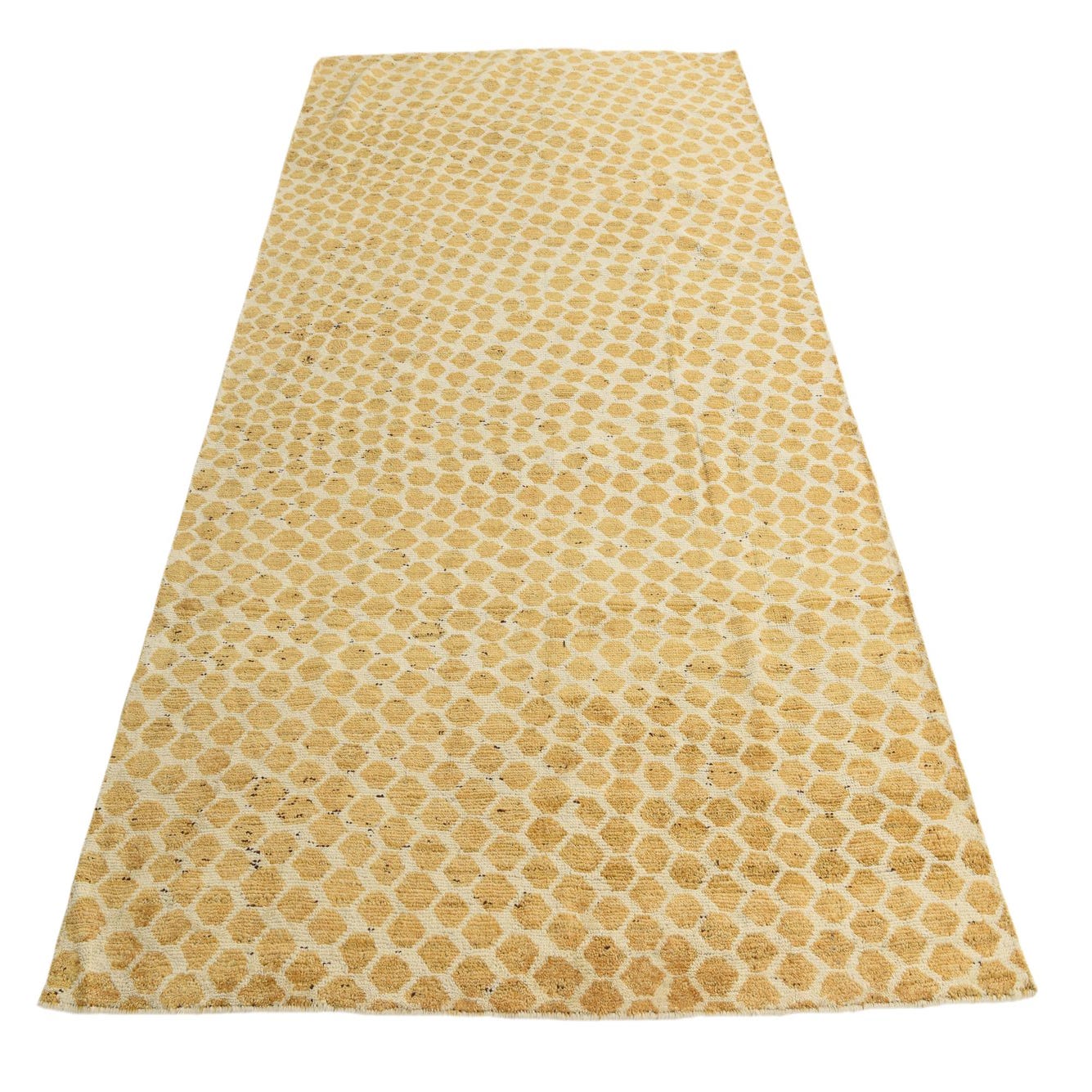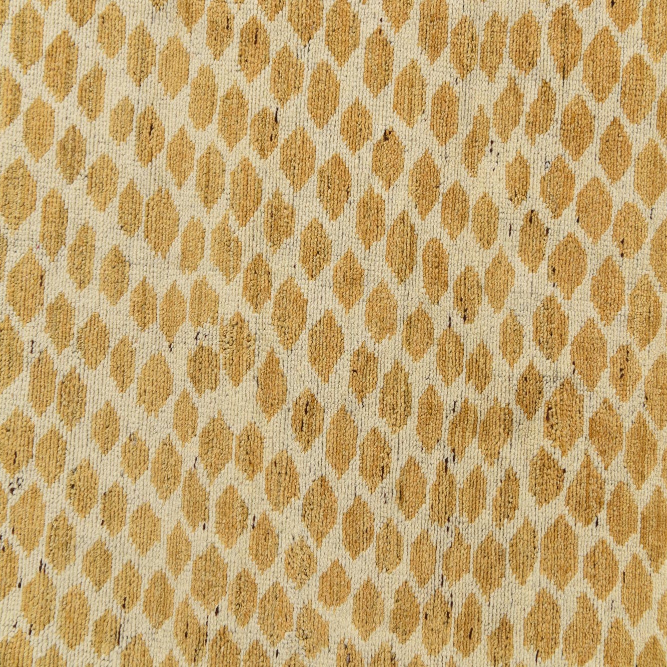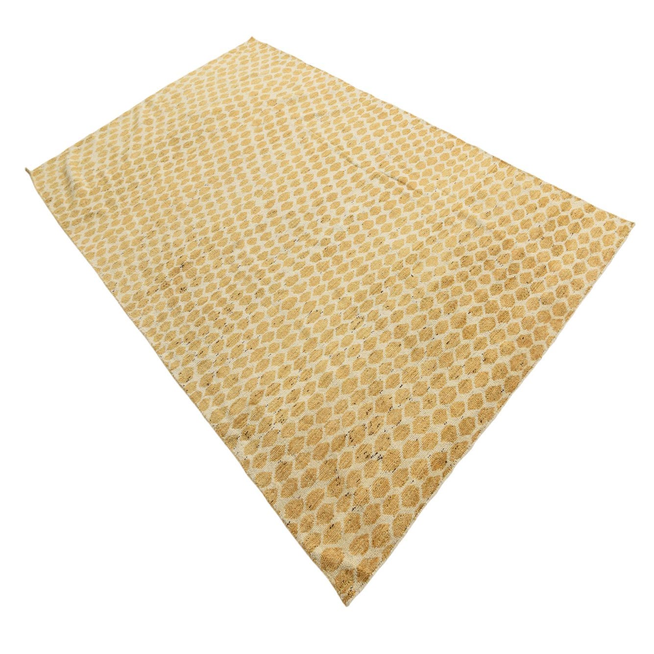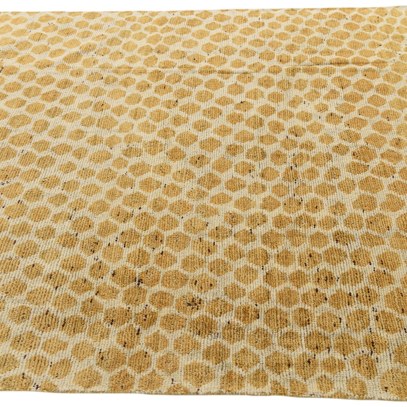 The Darya rug is a hand-knotted 6x9 piece, meticulously crafted from 100% wool for durability and a soft underfoot. Its pattern features organic shapes that create a honeycomb-like lattice, with the distinct colors of ivory and yellow delivering a warm visual appeal. The ivory background ensures versatility, allowing the yellow tones to stand as the focal point of the design.