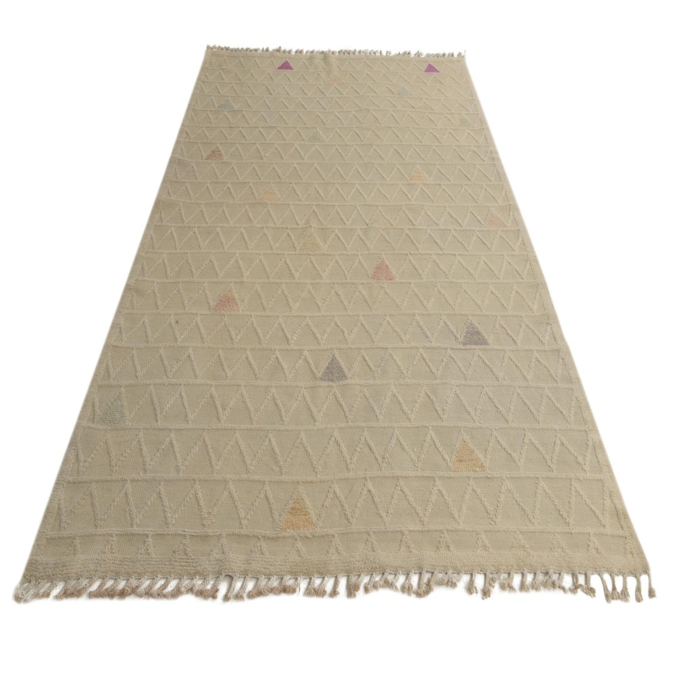 A 6x9 rectangular ivory wool rug with a modern abstract pattern of textured zigzags and scattered colorful triangles.