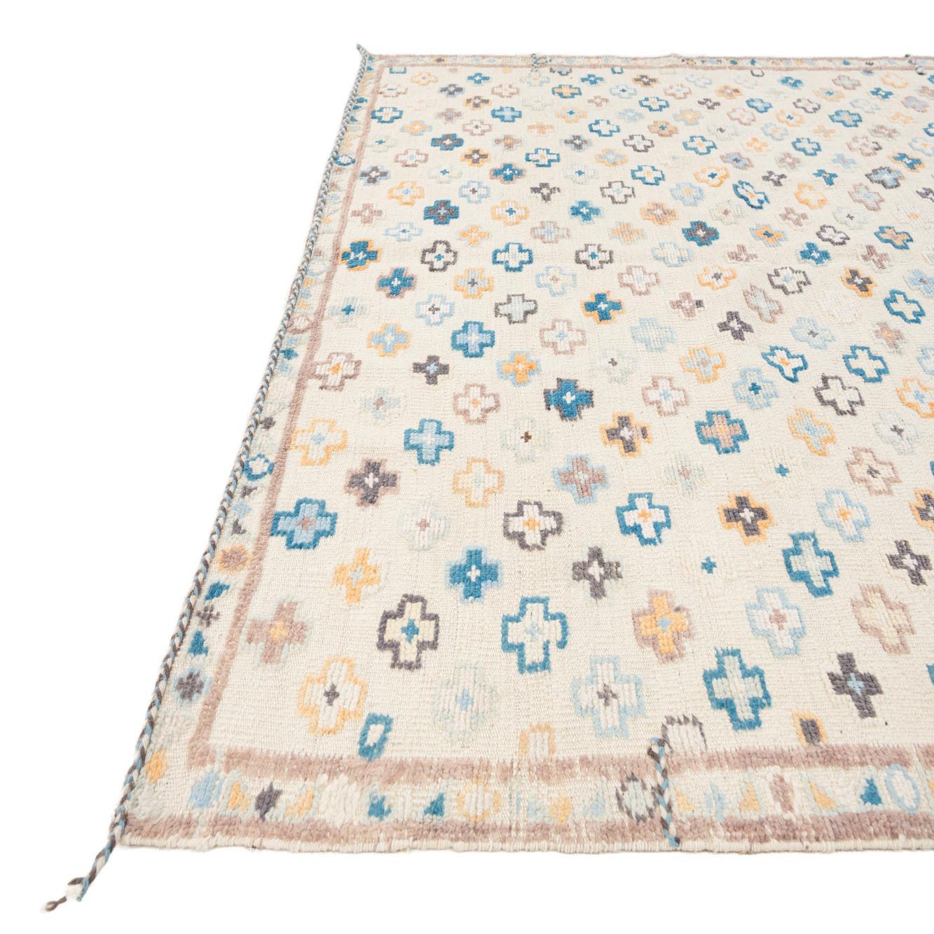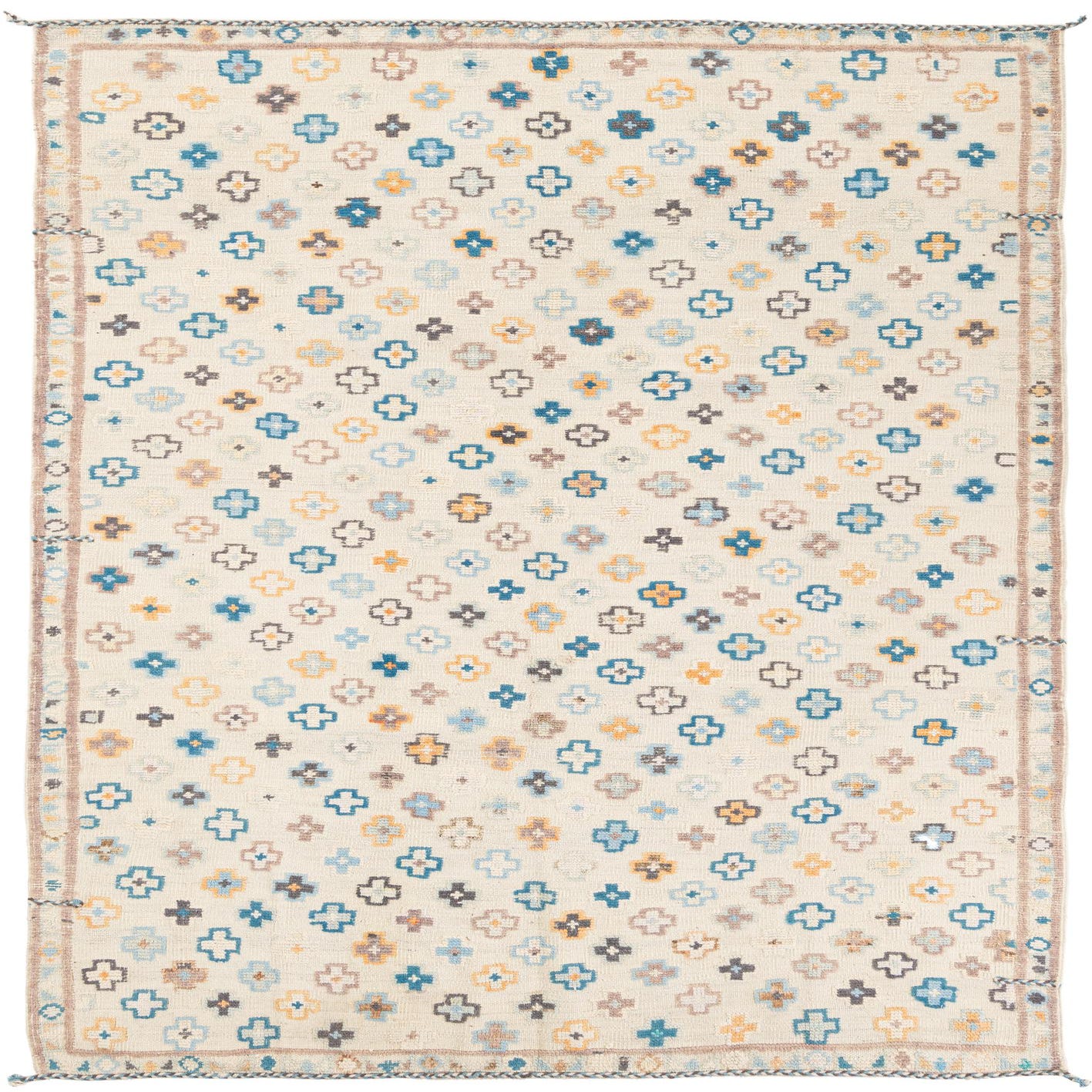 A 6x9 rectangular ivory modern wool rug with a repeating pattern of small blue, yellow, and brown geometric shapes.