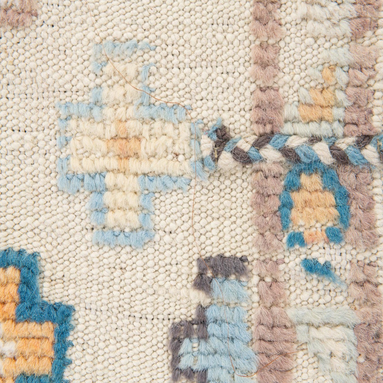 Primary color is Ivory. Colors in this rug include: Ivory, Black, Blue, Brown, Light Blue, Orange.