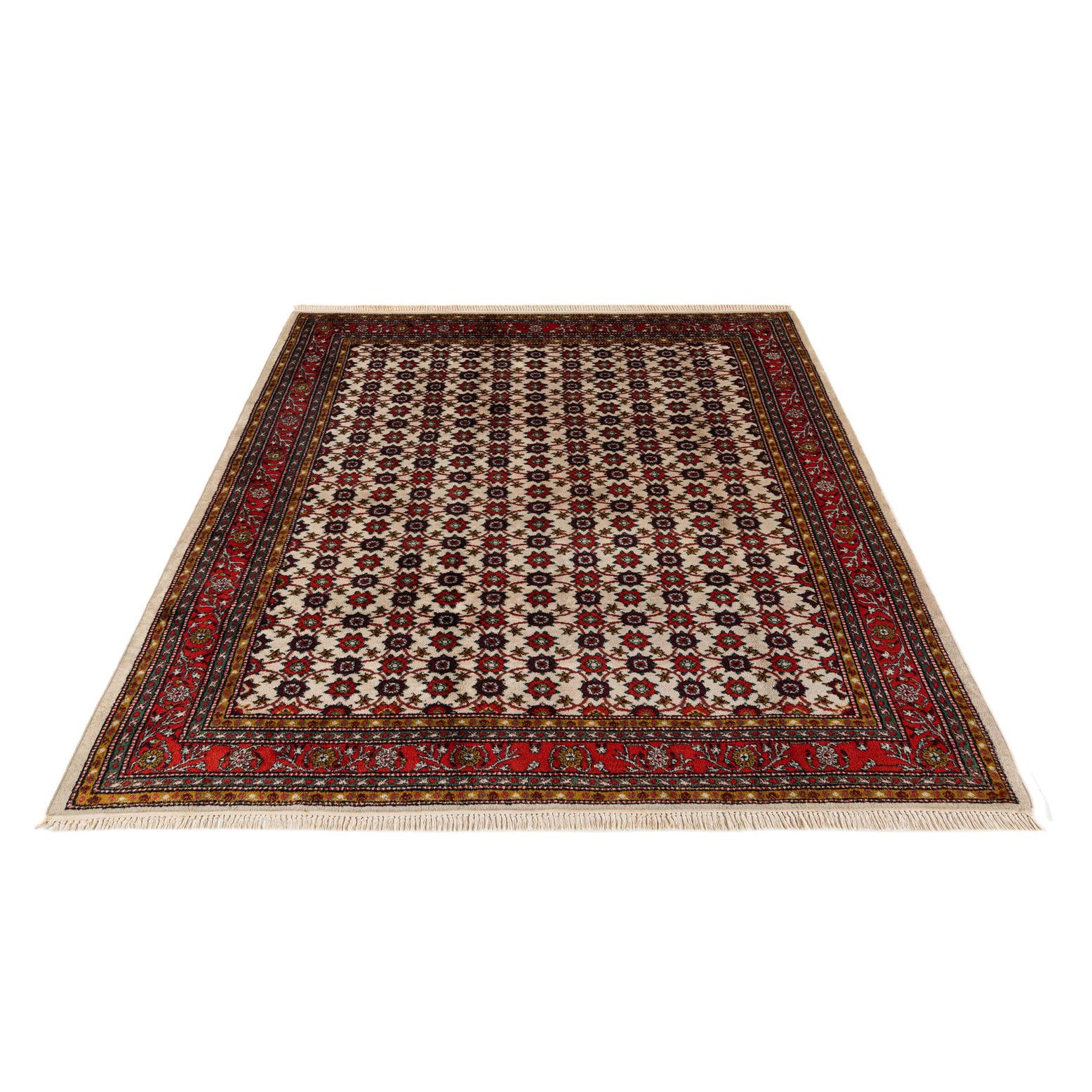 A 6x9 rectangular Hamedan wool rug featuring a traditional tribal pattern in ivory, cream, and red with a detailed border.