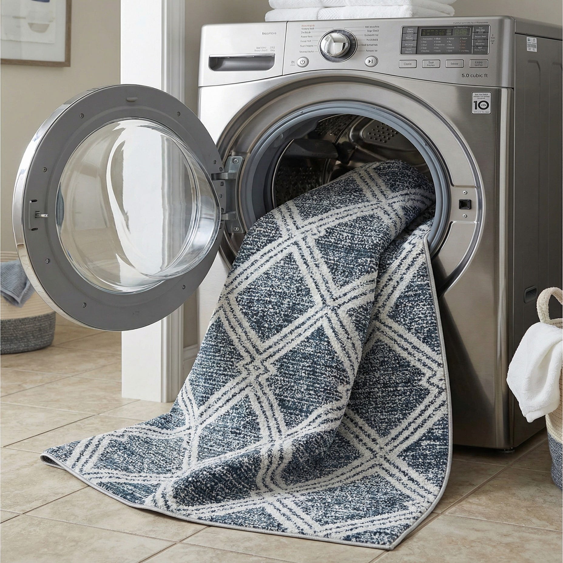 An ivory field sets a bright, neutral stage for a classic diamond trellis motif in deep navy blue. The navy areas have a softly distressed, speckled texture that gives the surface visual depth, while the ivory lines define the geometric pattern with crisp contrast. Machine-made from 100% polyester, the rug has a low, soft pile that feels smooth underfoot and lays flat for easy furniture placement.
