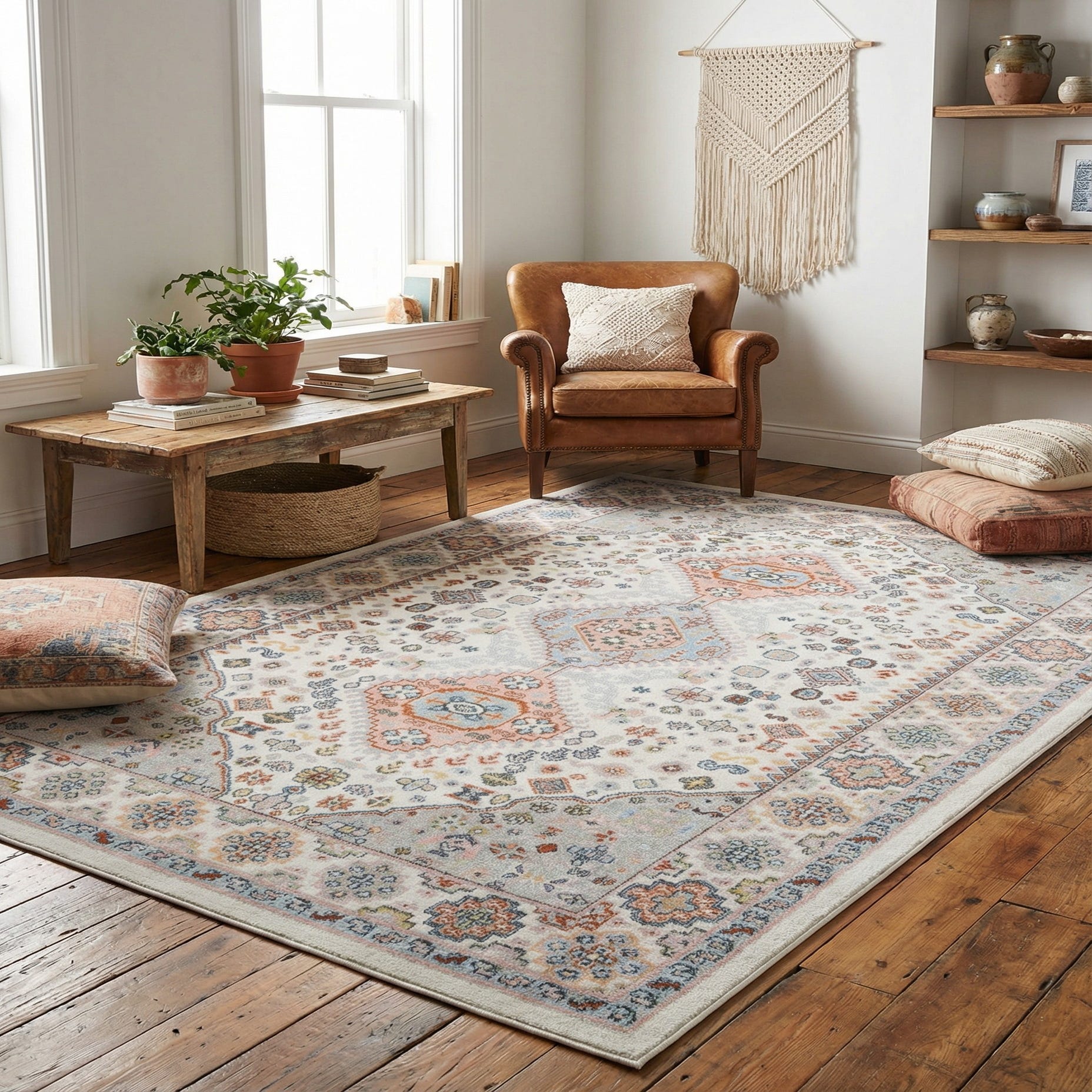 Primary color is Ivory. Colors in this rug include: Ivory, Gray, Green, Light Blue, Terracotta, Pink.