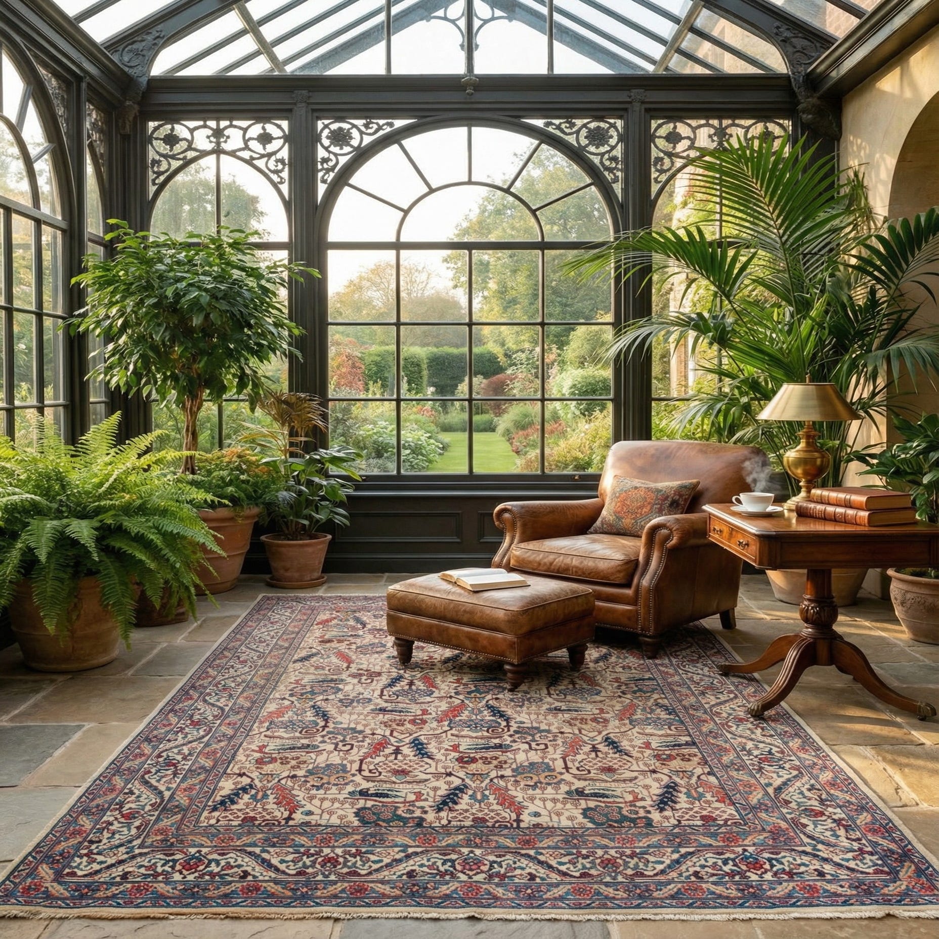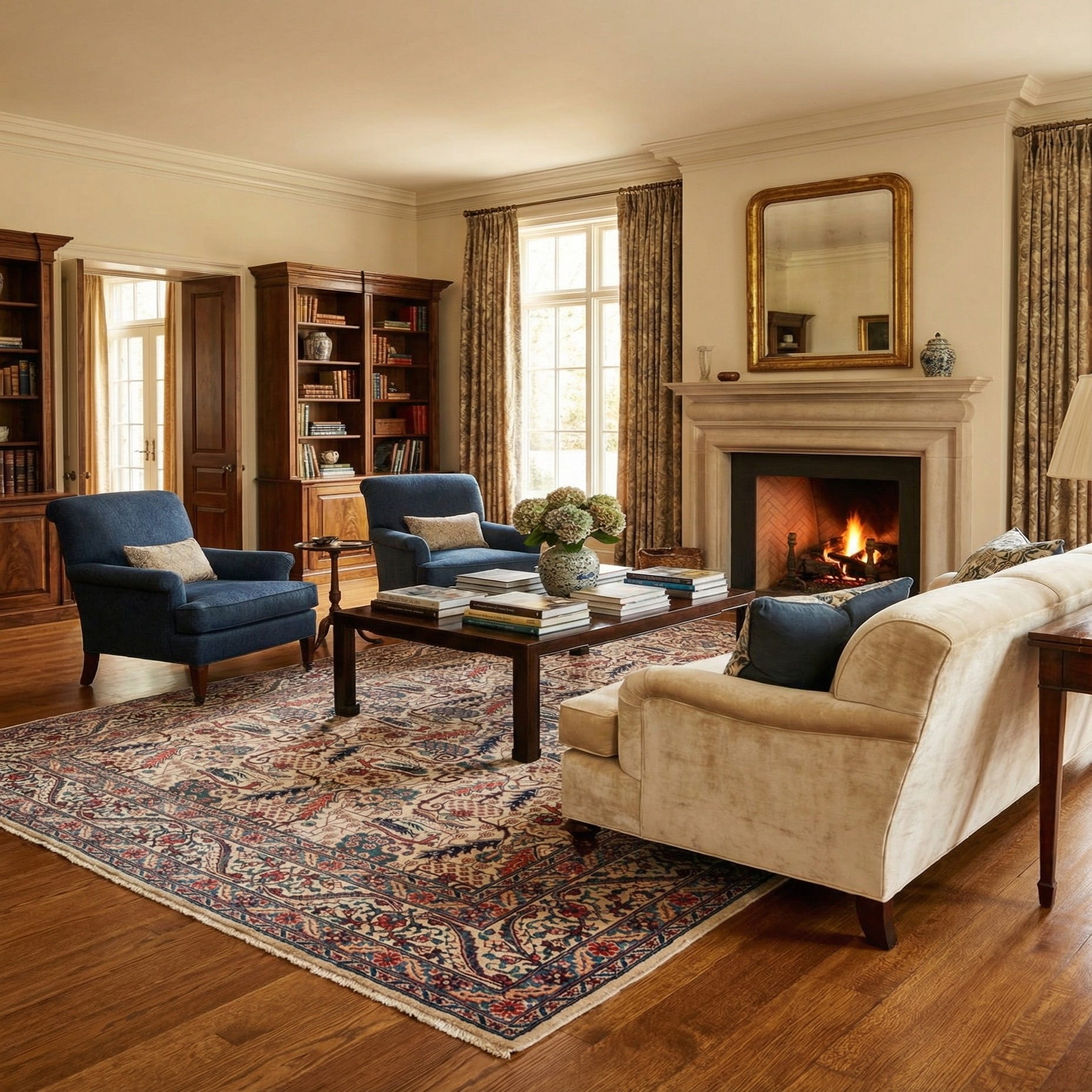 This rug pairs well with both classic and transitional interiors: place it beneath a seating group to ground a living room, layer it under a dining table for a formal dining arrangement, or use it to anchor a bedroom seating area. It complements warm wood tones, navy or red accents, and neutral upholstery, and fits equally well with antique finishes or clean-lined furniture for a balanced, layered look.