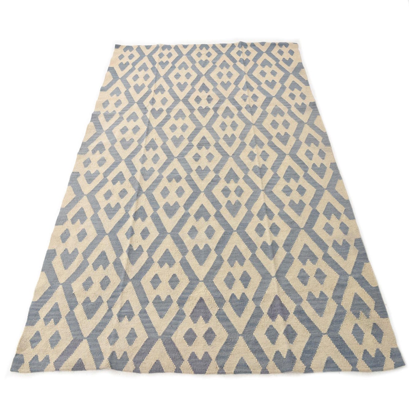 This Kilim Modern collection rug is a 6x9 handwoven piece crafted from 100% wool, showcasing a blend of durability and comfort. The design features a geometric pattern consisting of repeating diamond and arrow shapes, offering both symmetry and visual interest. The color palette incorporates shades of ivory as the dominant background, with light blue accents creating a gentle yet impactful contrast.