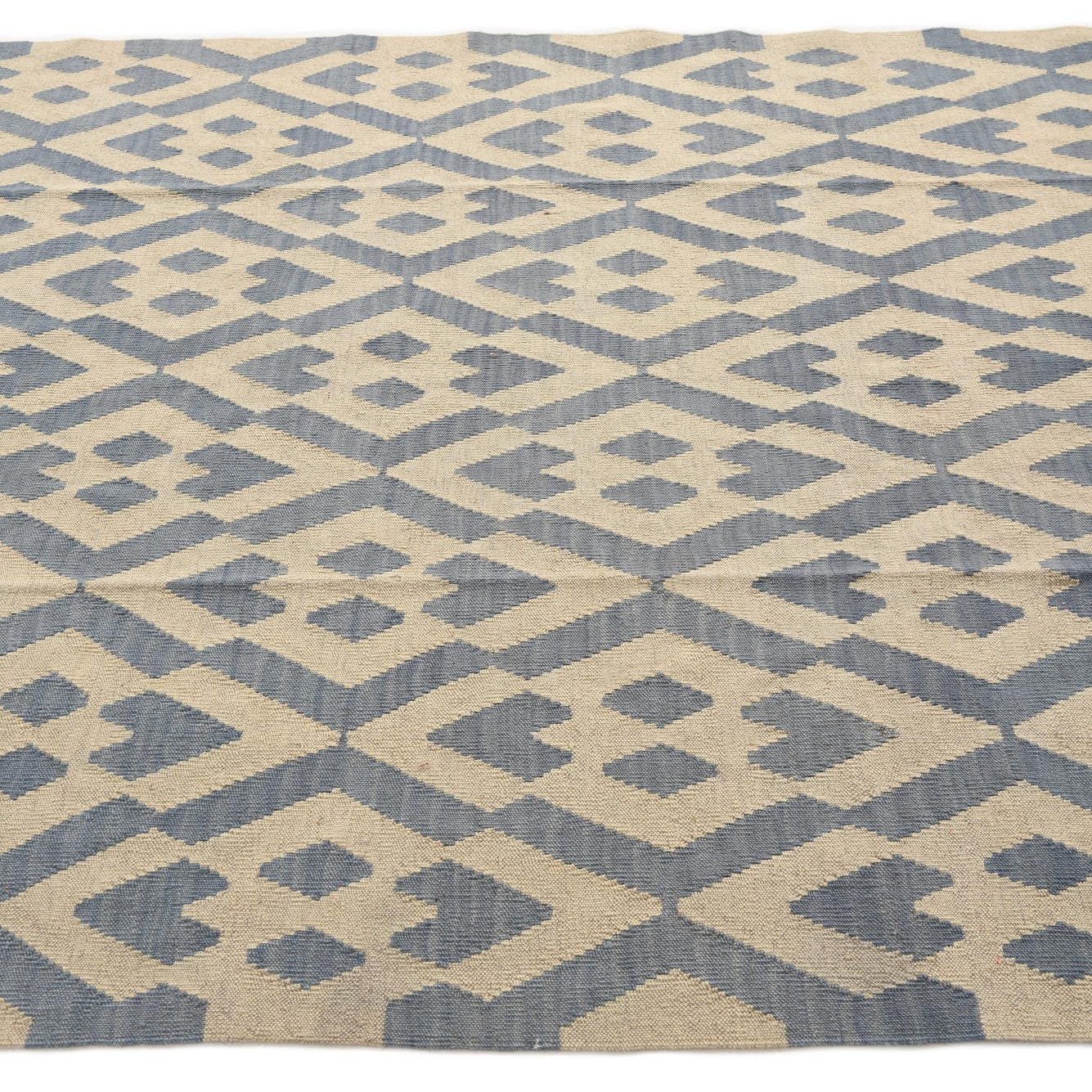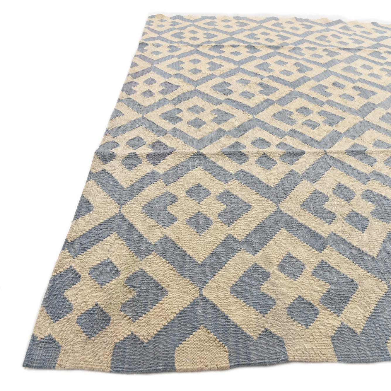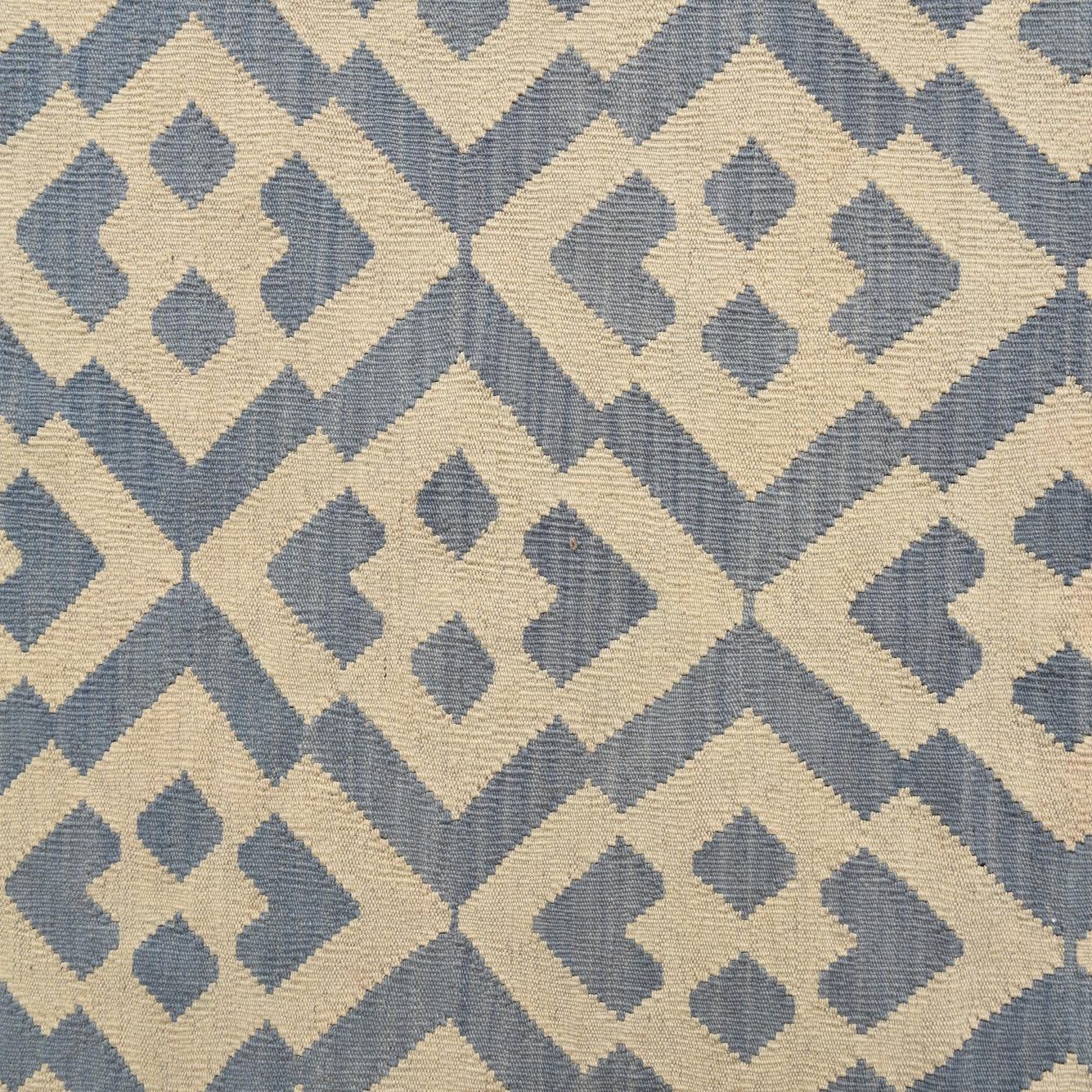 A 6x9 rectangular Kilim Modern rug with a tribal geometric pattern in shades of blue and ivory, suitable for a living room.