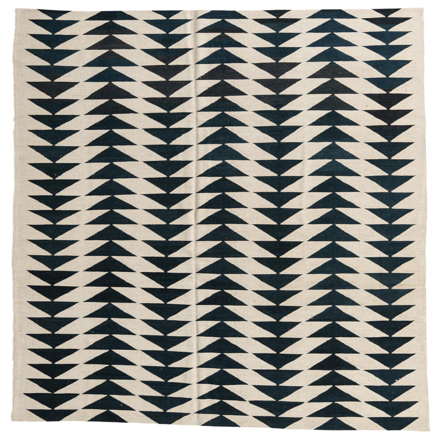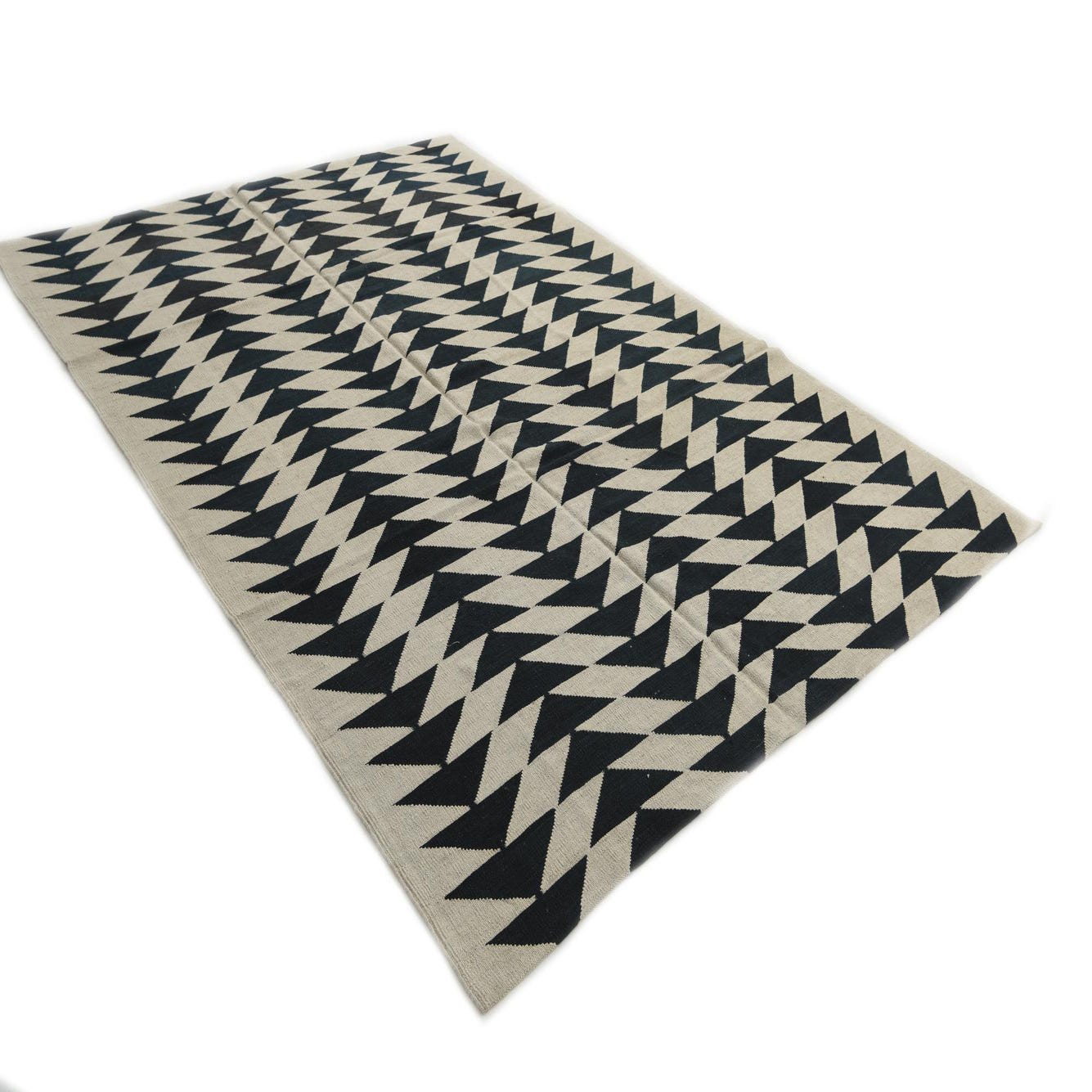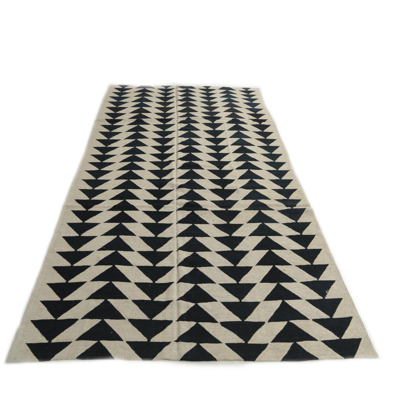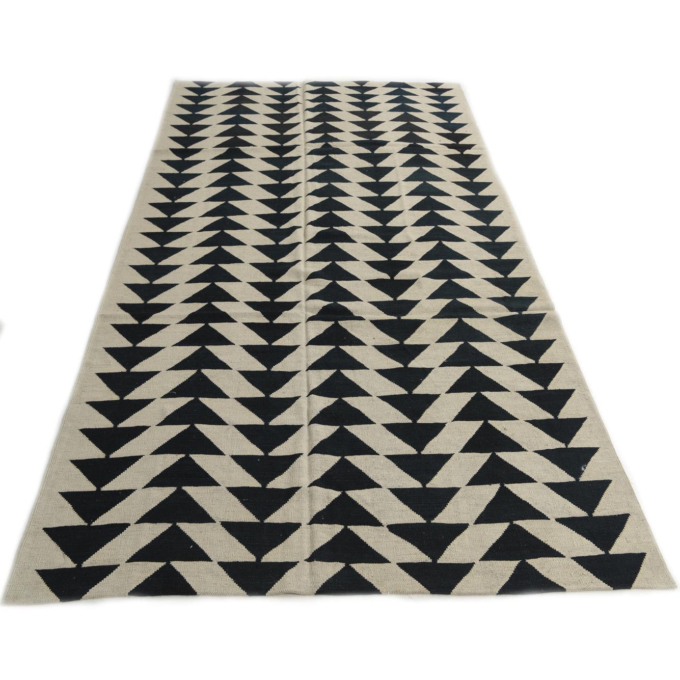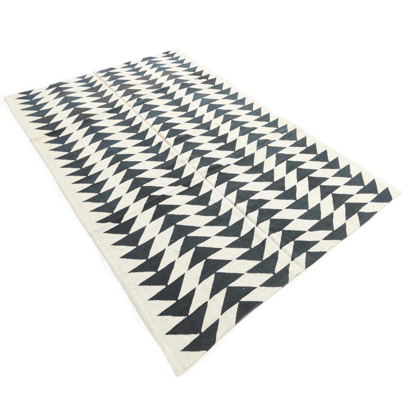A 6x9 rectangular ivory and dark blue flatweave rug with a repeating tribal geometric triangle pattern.