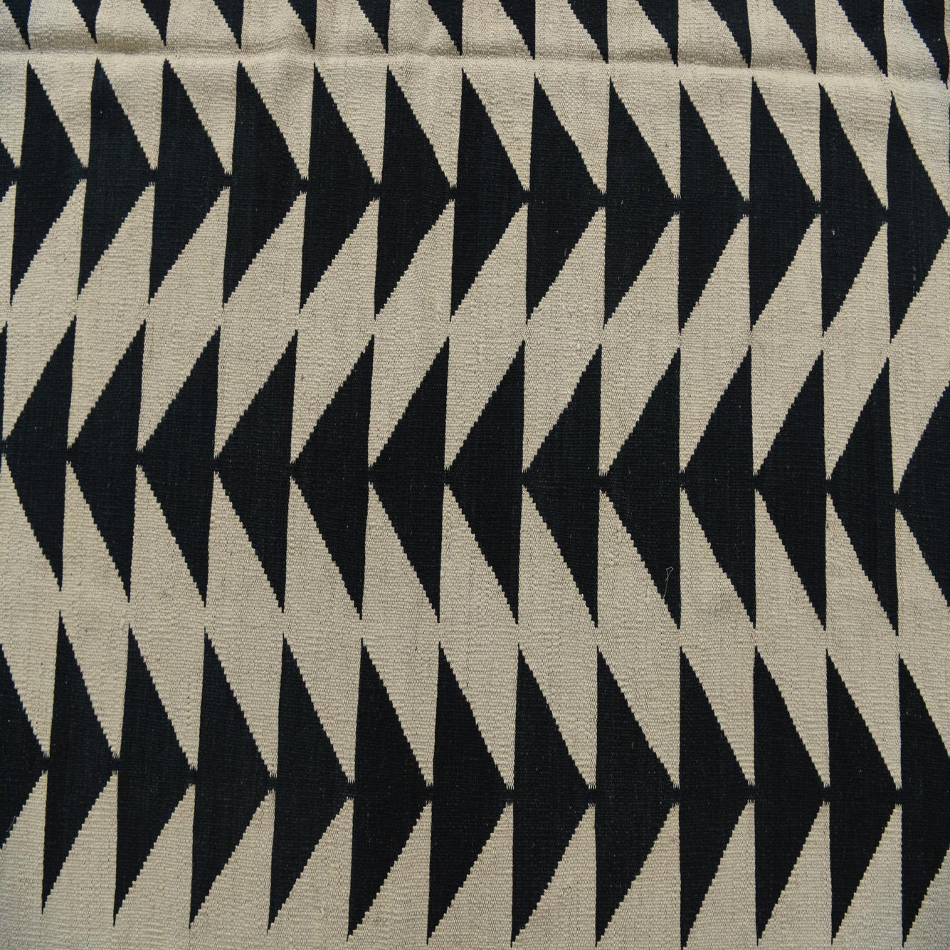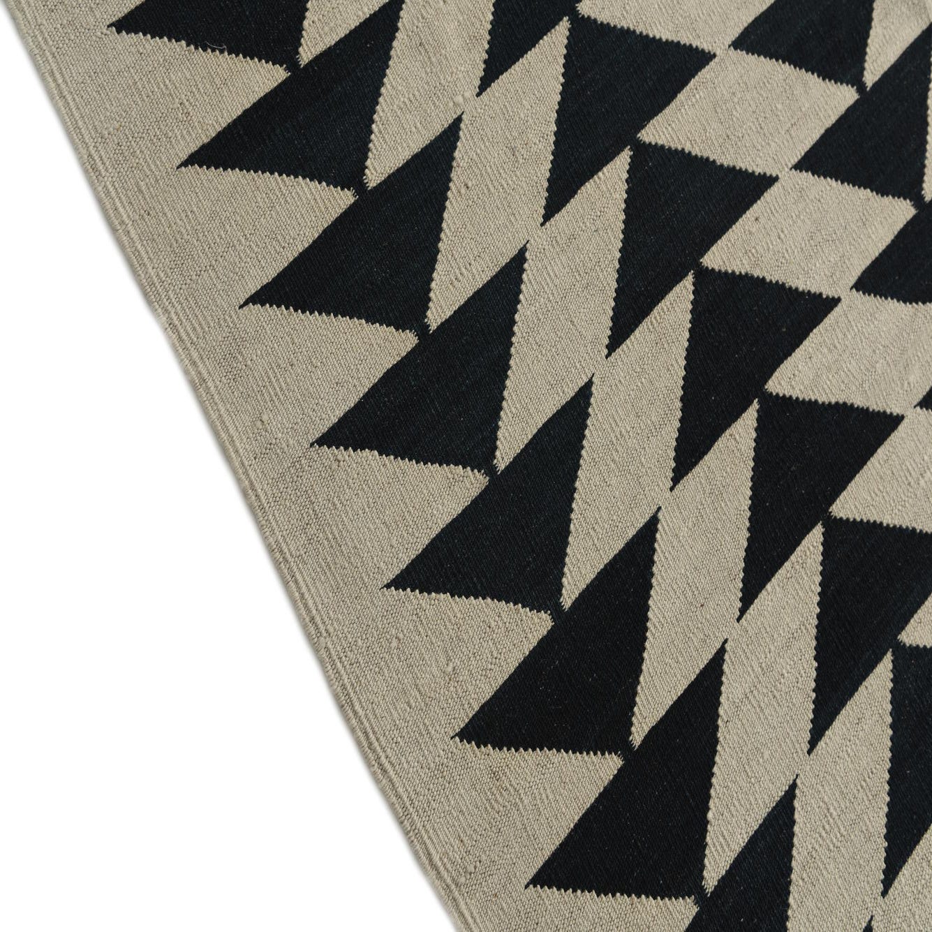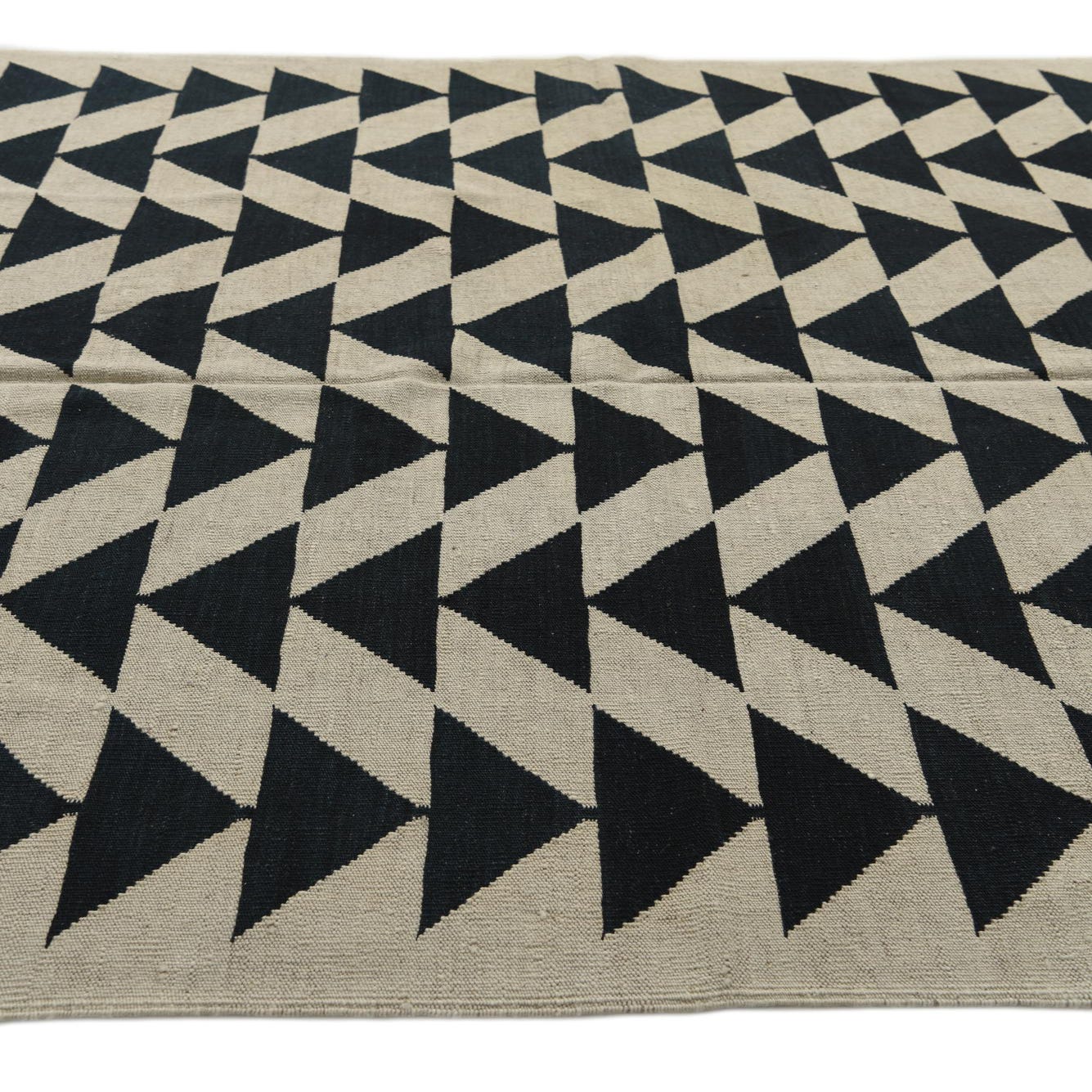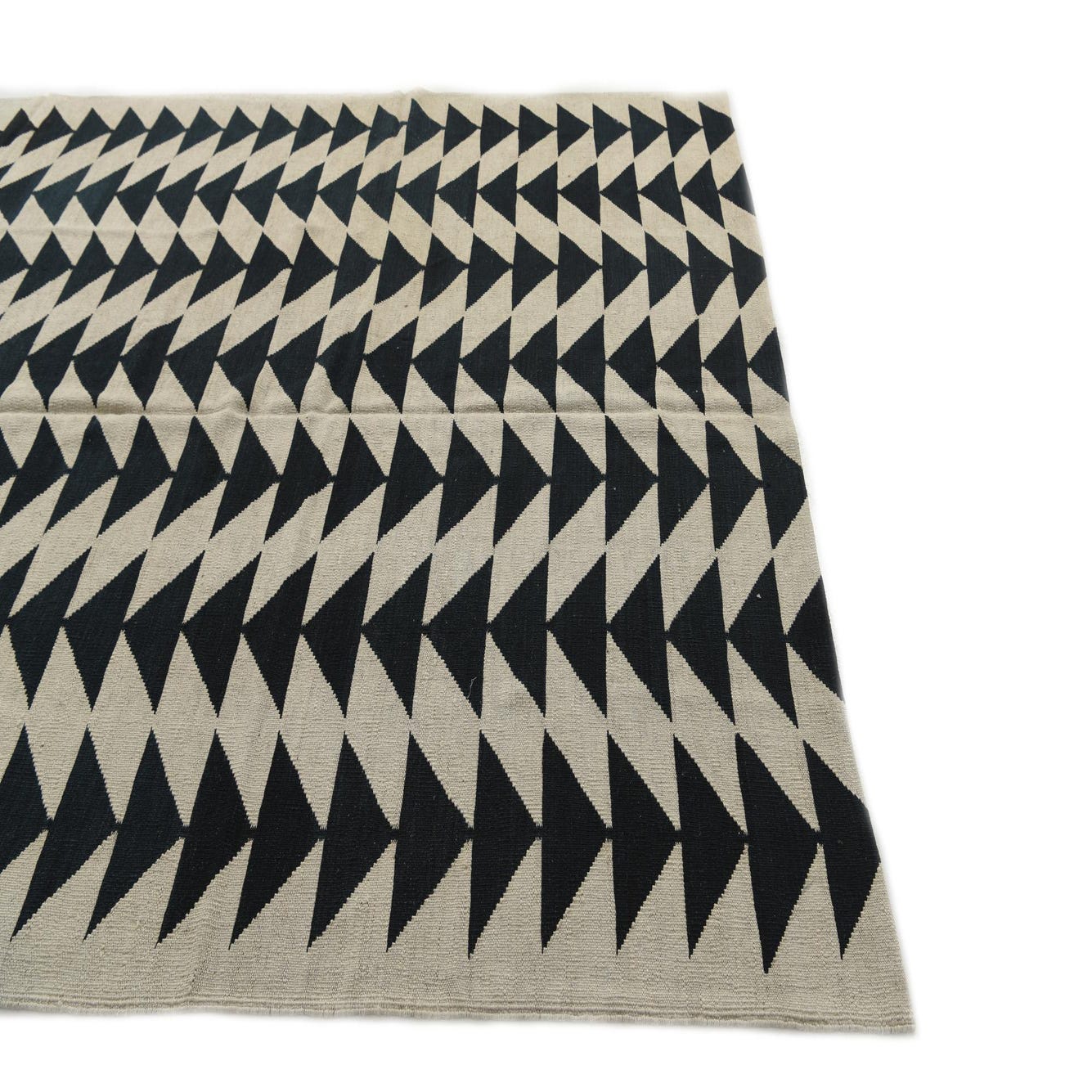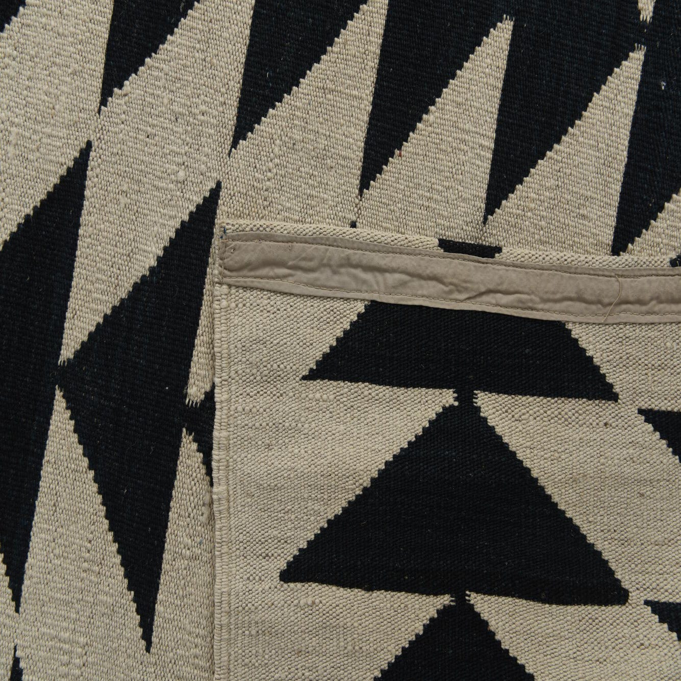 A 6x9 rectangular ivory and dark blue flatweave rug with a repeating tribal geometric triangle pattern.