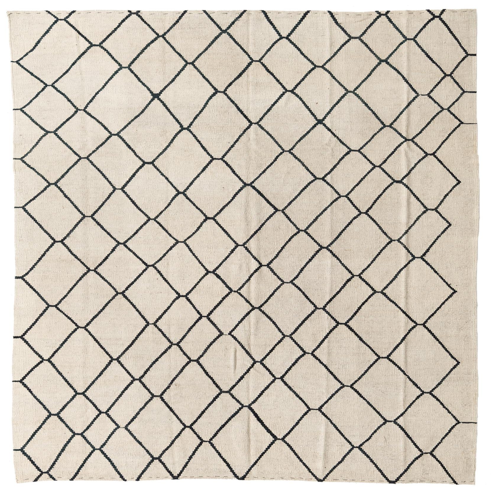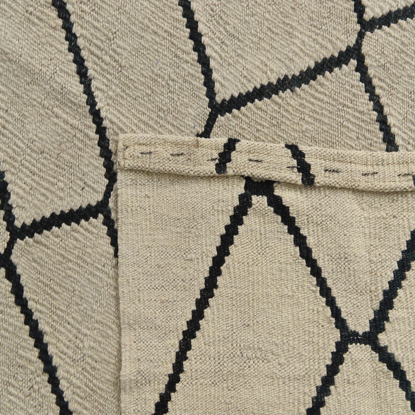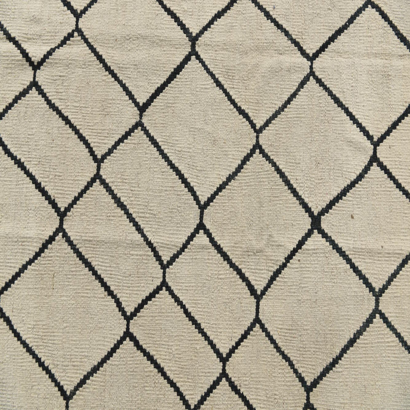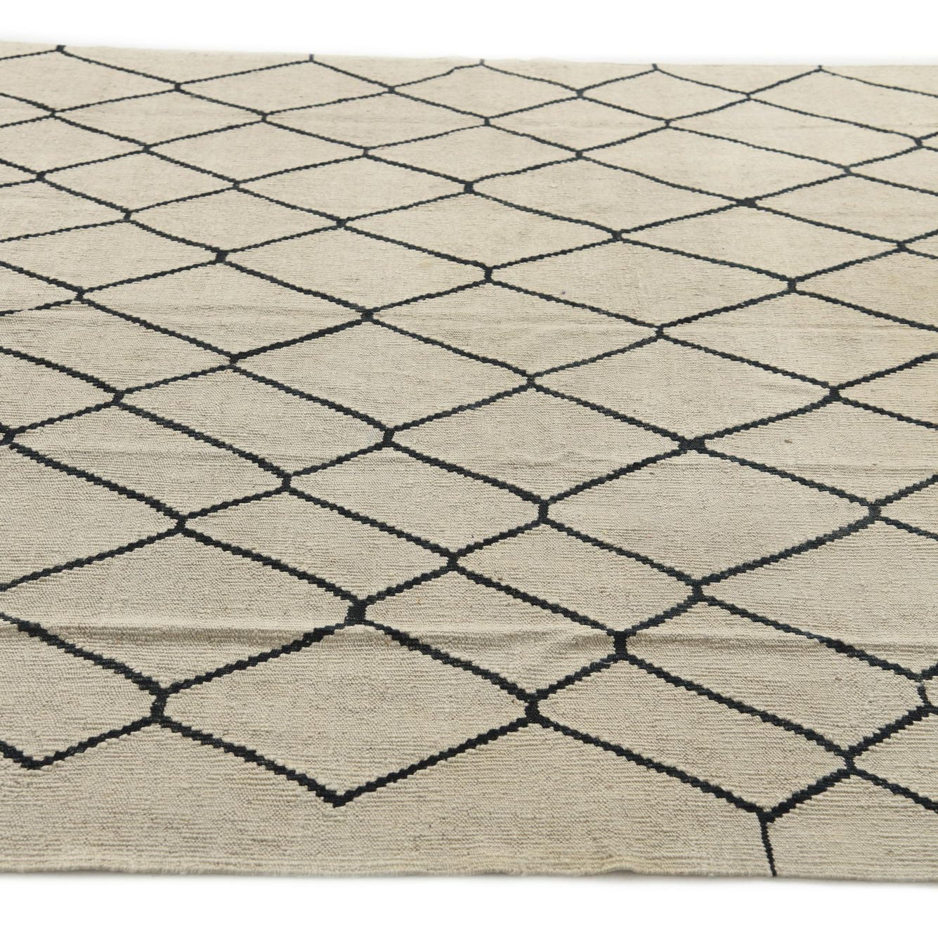 A 6x9 rectangular ivory flatweave wool rug with a black tribal diamond pattern, perfect for a modern living room.