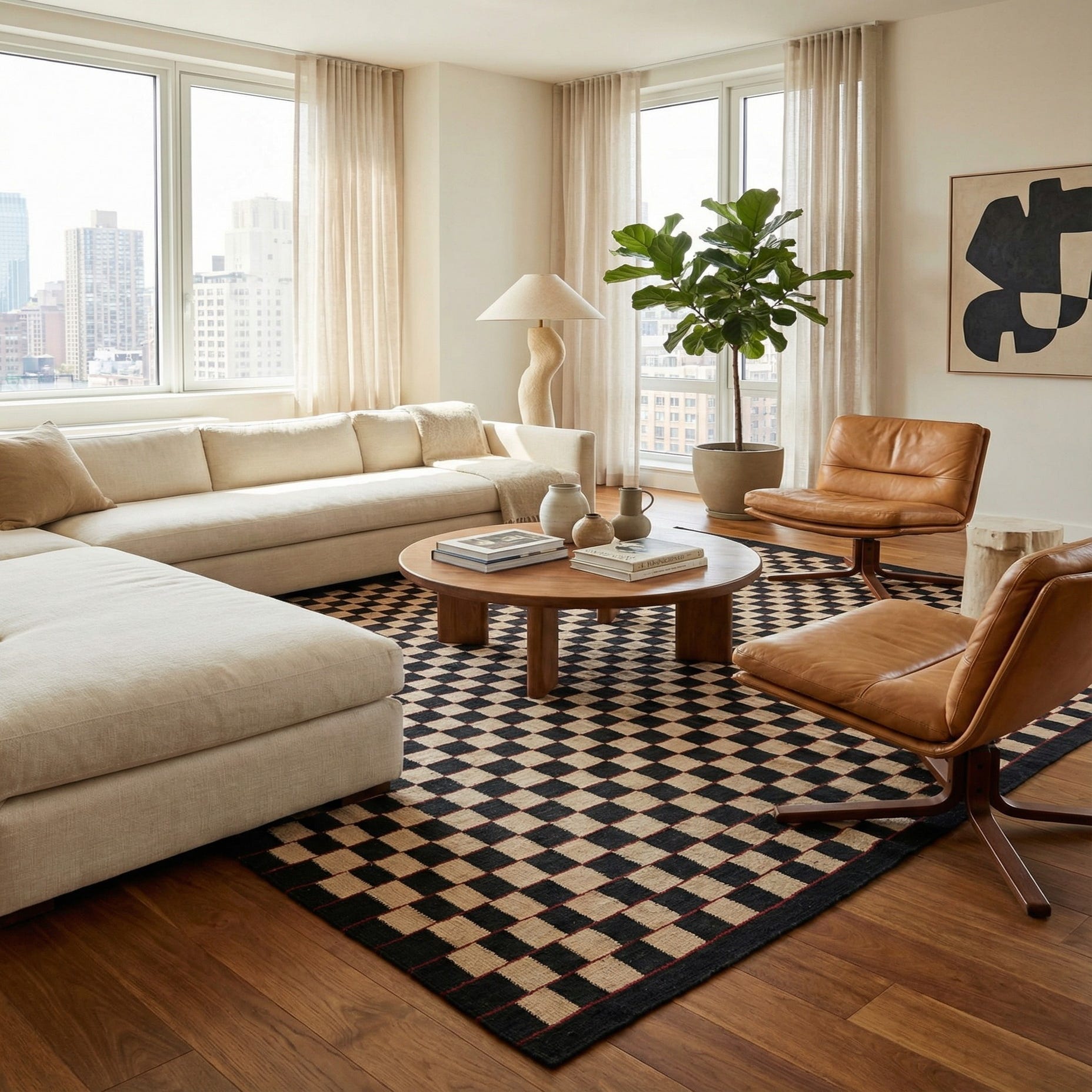 The rug's flatweave texture and crisp lines lend itself to modern and eclectic interior designs. Its color palette allows for versatile placement among various decor styles, from minimalistic monochrome settings that would allow the rug's pattern to stand out, to more vibrant, mixed motifs where it would contribute to an energetic aesthetic. In a living room, this rug could serve as an anchor for a seating arrangement, or in a dining area to define the space with its striking presence.