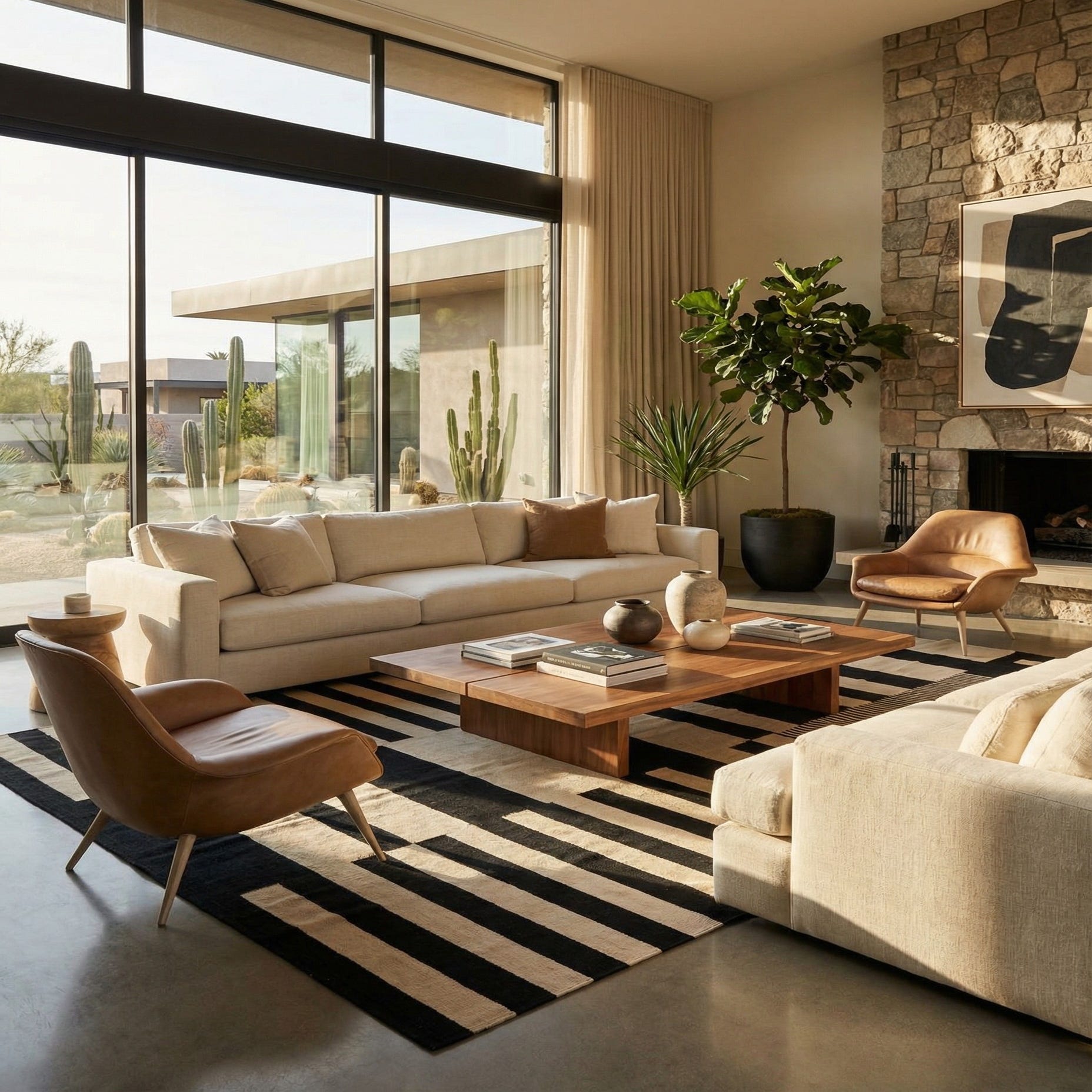 A 6x9 rectangular flatweave rug with a modern tribal pattern in black and ivory, featuring bold horizontal stripes and abstract blocks.