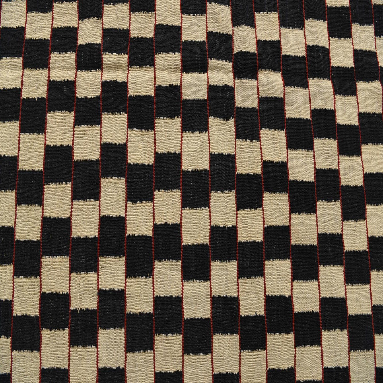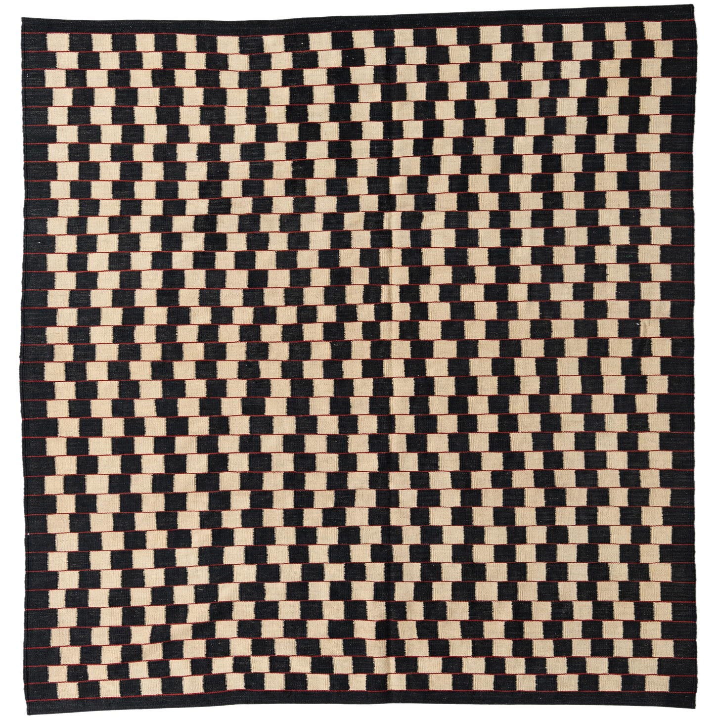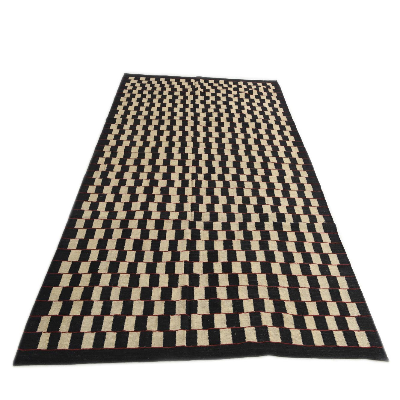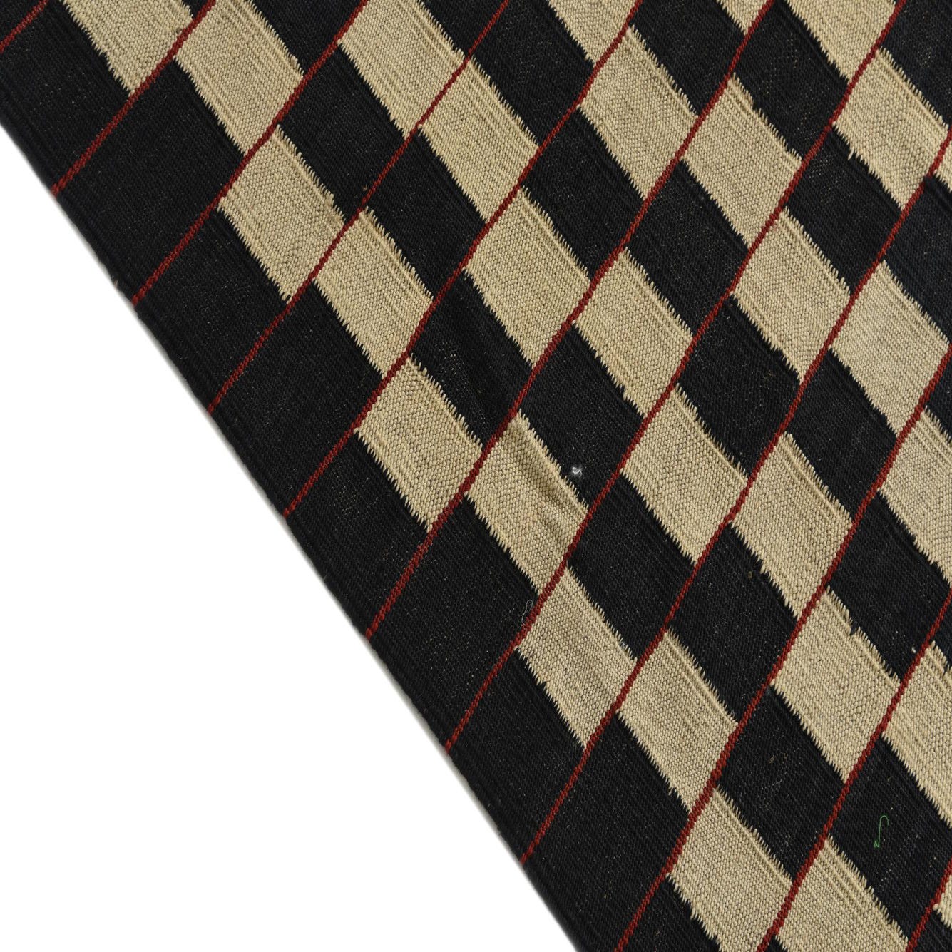 A 6x9 rectangular flatweave rug with a tribal checkerboard pattern in black and ivory, featuring thin red horizontal lines.