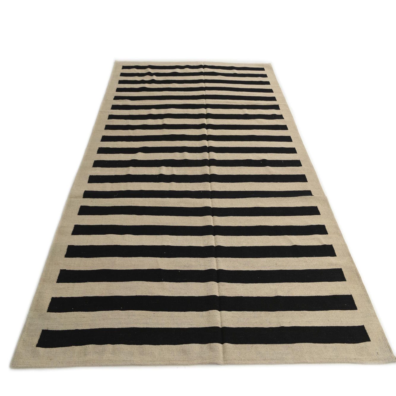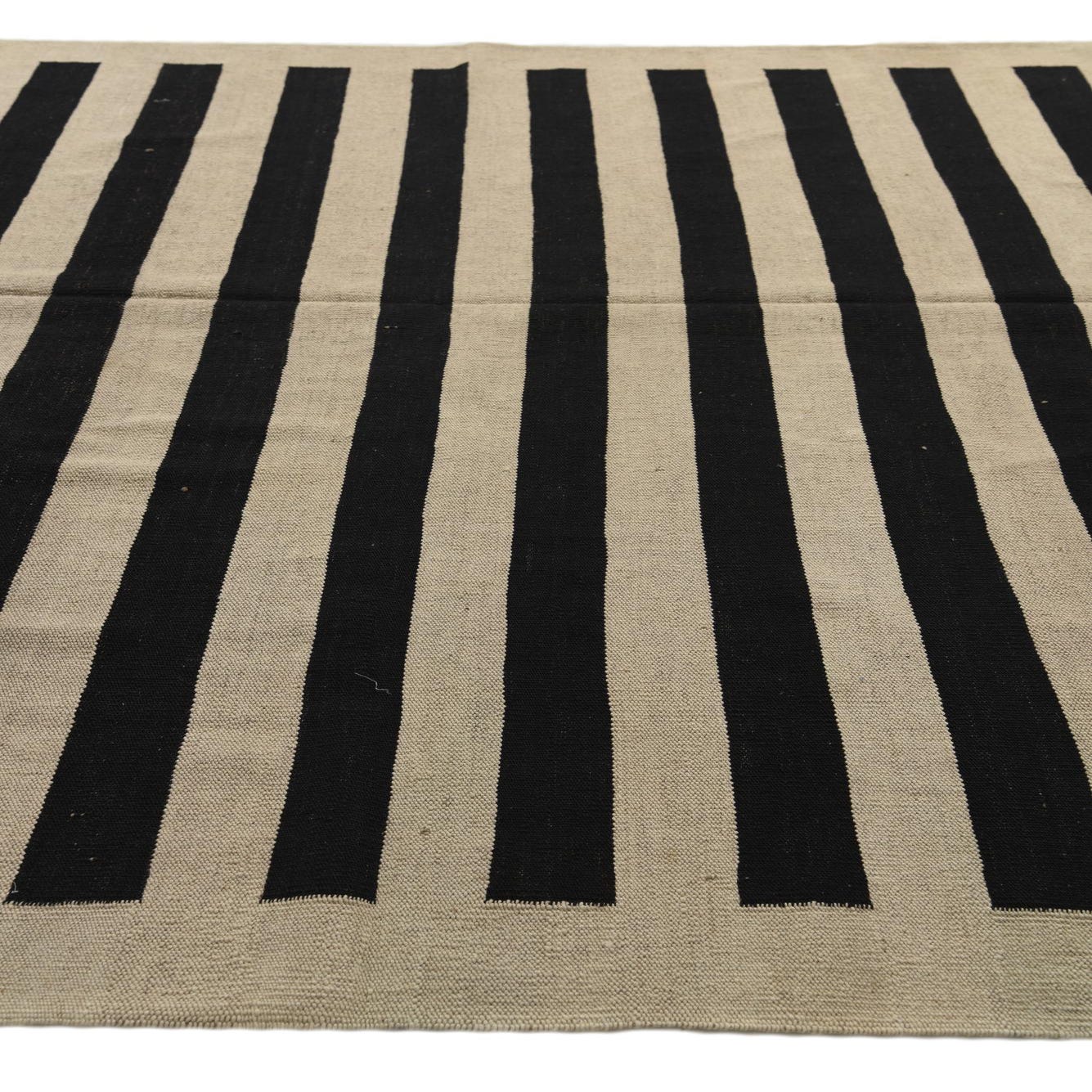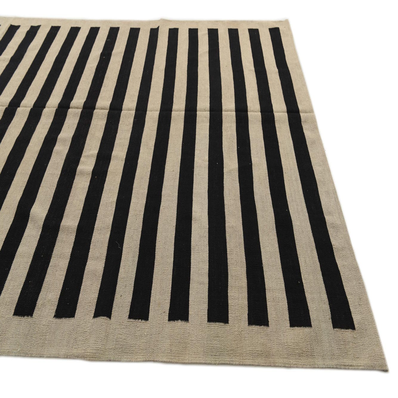 A 6x9 rectangular Rugs.com Kilim Modern flatweave rug with bold black and ivory stripes, ideal for a living room.
