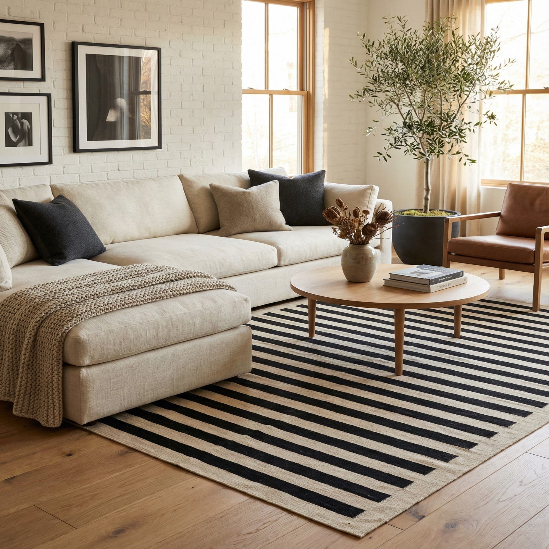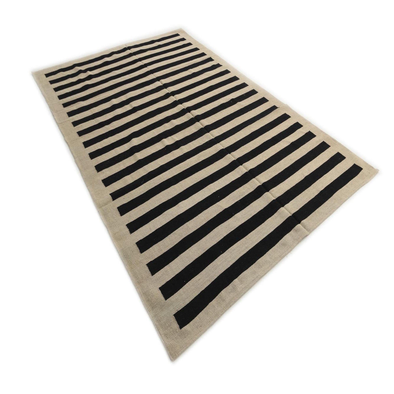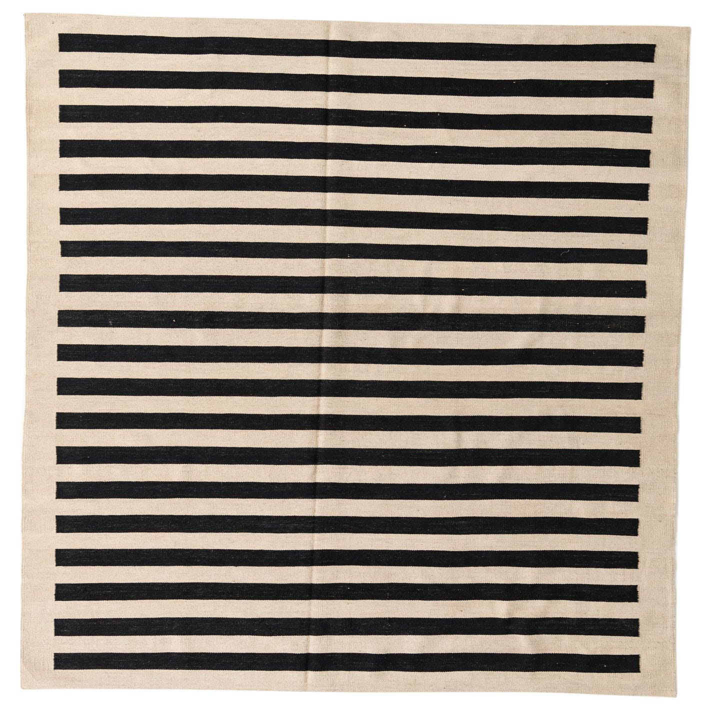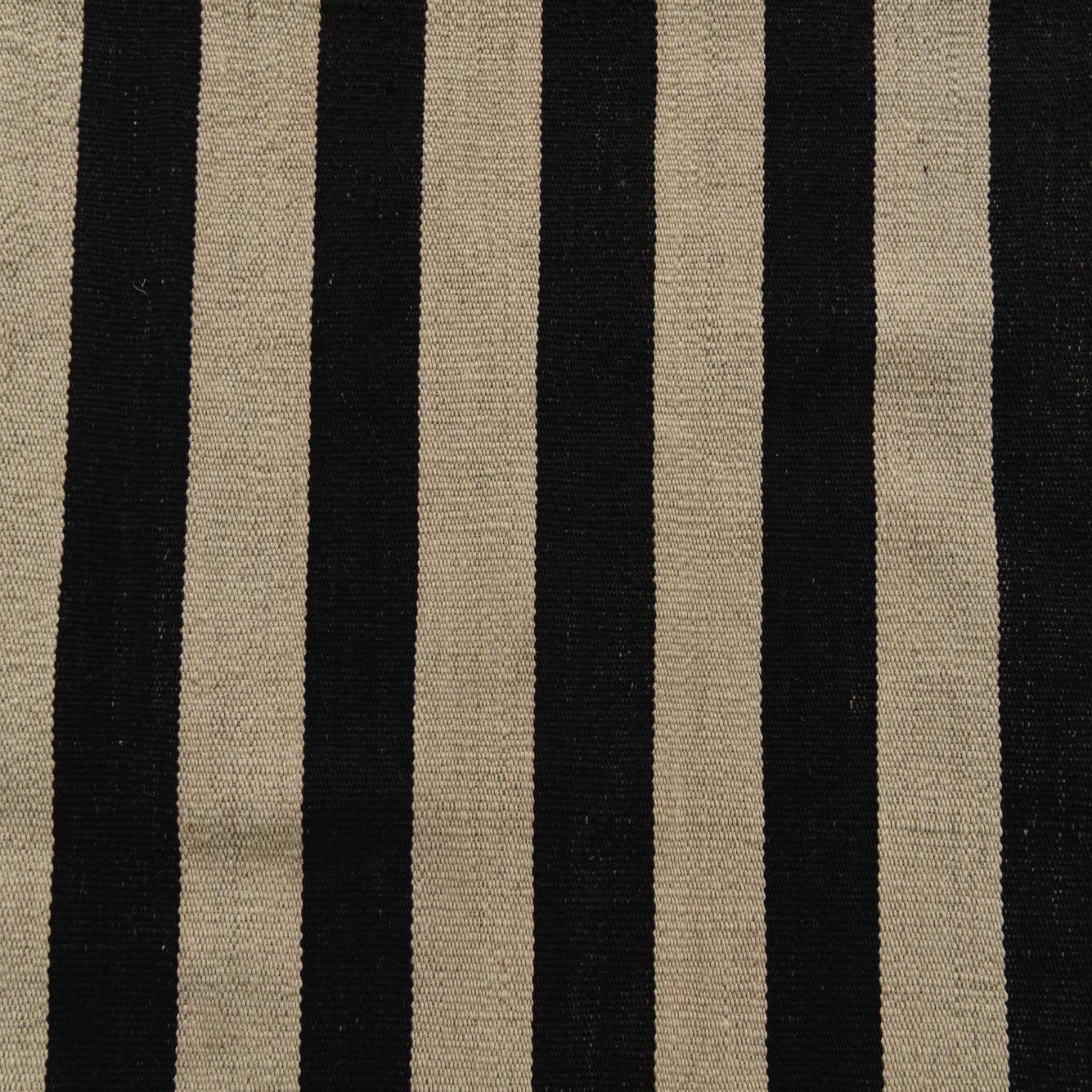 A 6x9 rectangular Rugs.com Kilim Modern flatweave rug with bold black and ivory stripes, ideal for a living room.