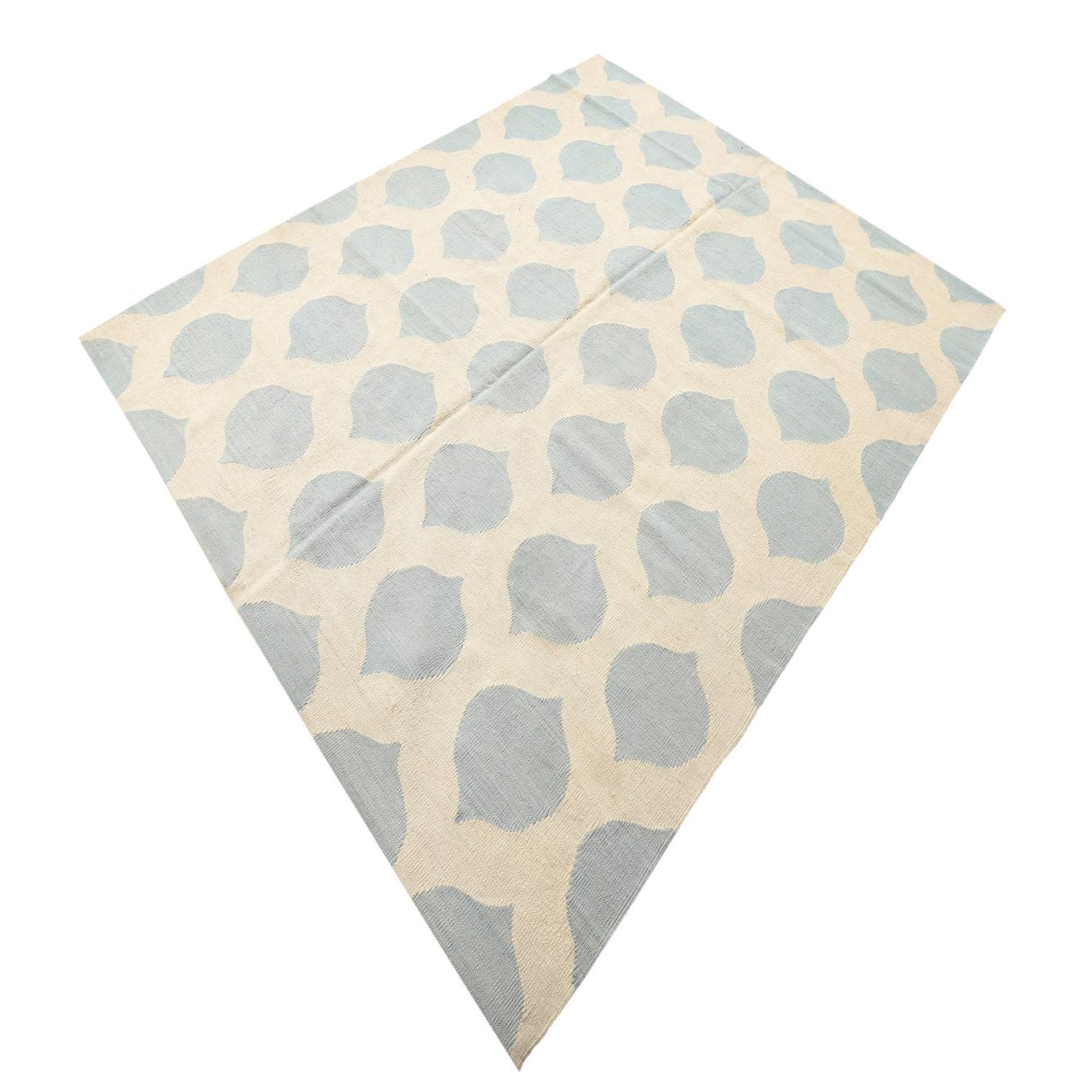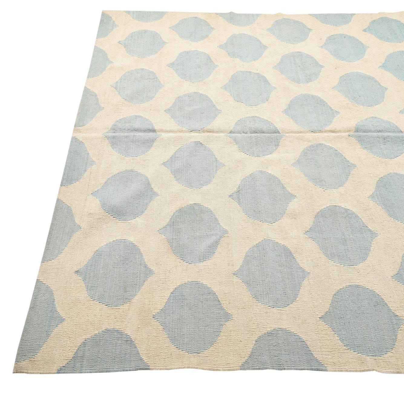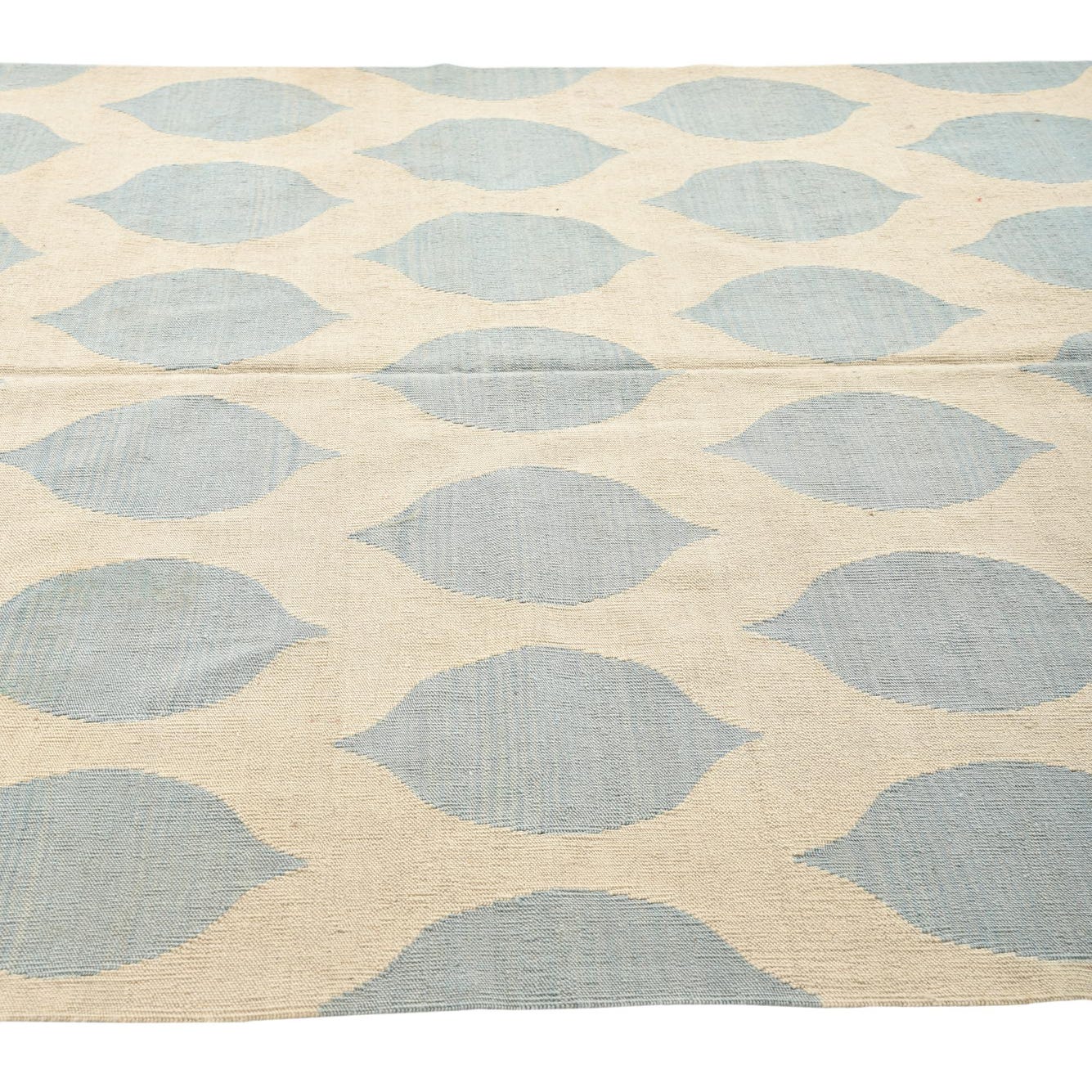 The Kilim Modern Collection presents a refined 6x9 hand-woven rug crafted from 100% wool, offering both comfort and durability. It features a visually engaging pattern of light blue geometric motifs set against an ivory backdrop, creating a serene and inviting aesthetic suitable for a variety of interior designs. The flatweave texture of this wool rug adds subtle tactile interest while ensuring a low profile.