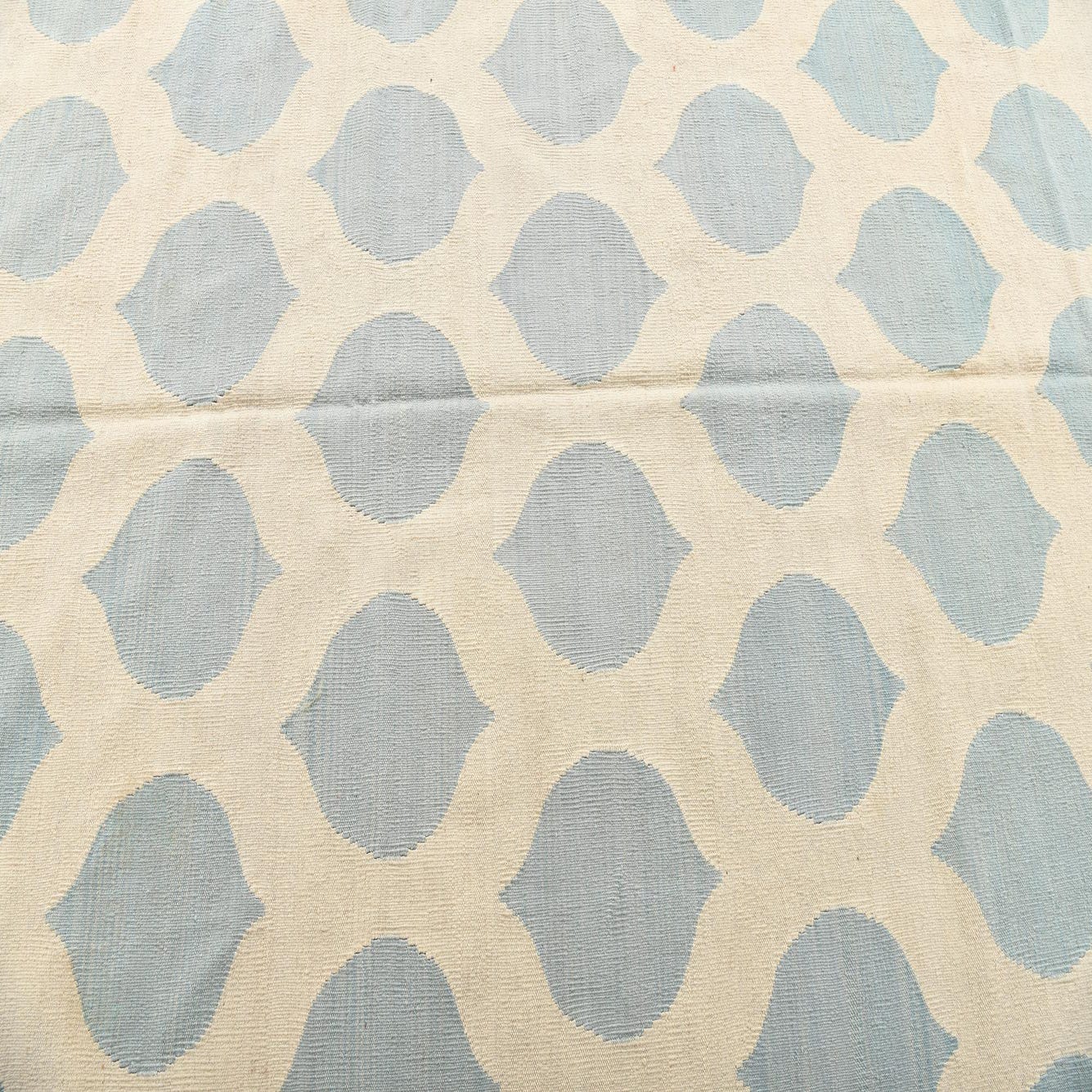 A 6x9 rectangular flatweave rug featuring a repeating modern tribal pattern in light blue and cream.