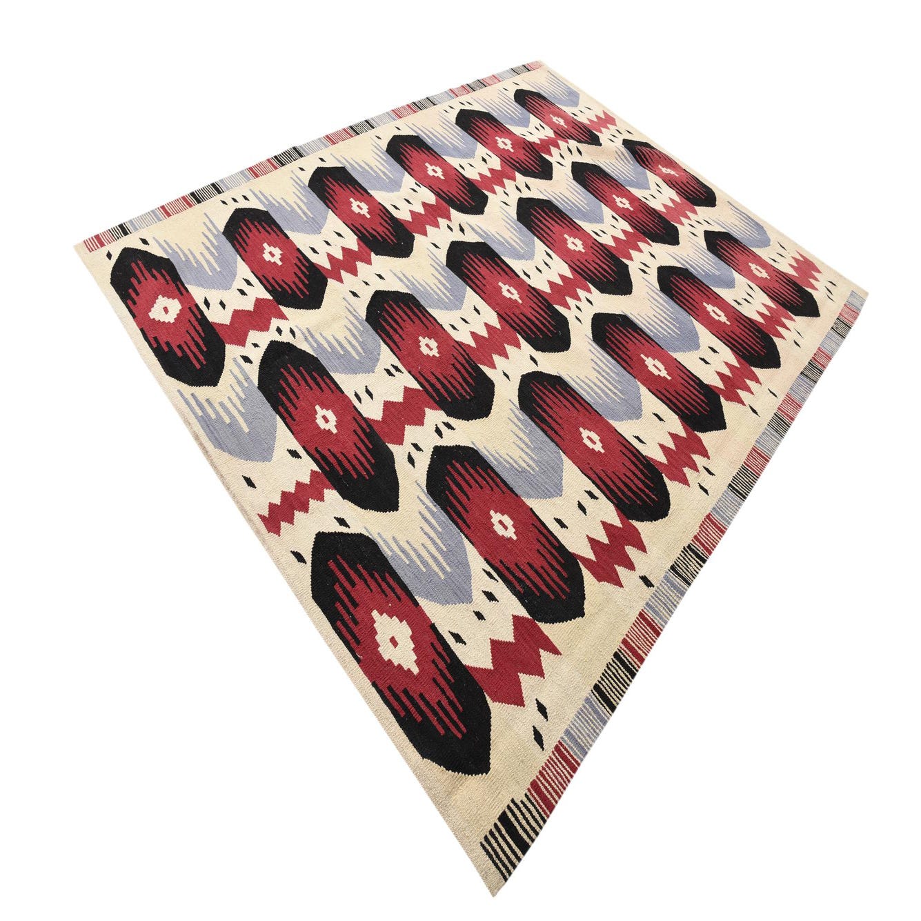 A 6x9 rectangular ivory flatweave rug with a bold tribal pattern in red, black, and light blue, perfect for a living room.