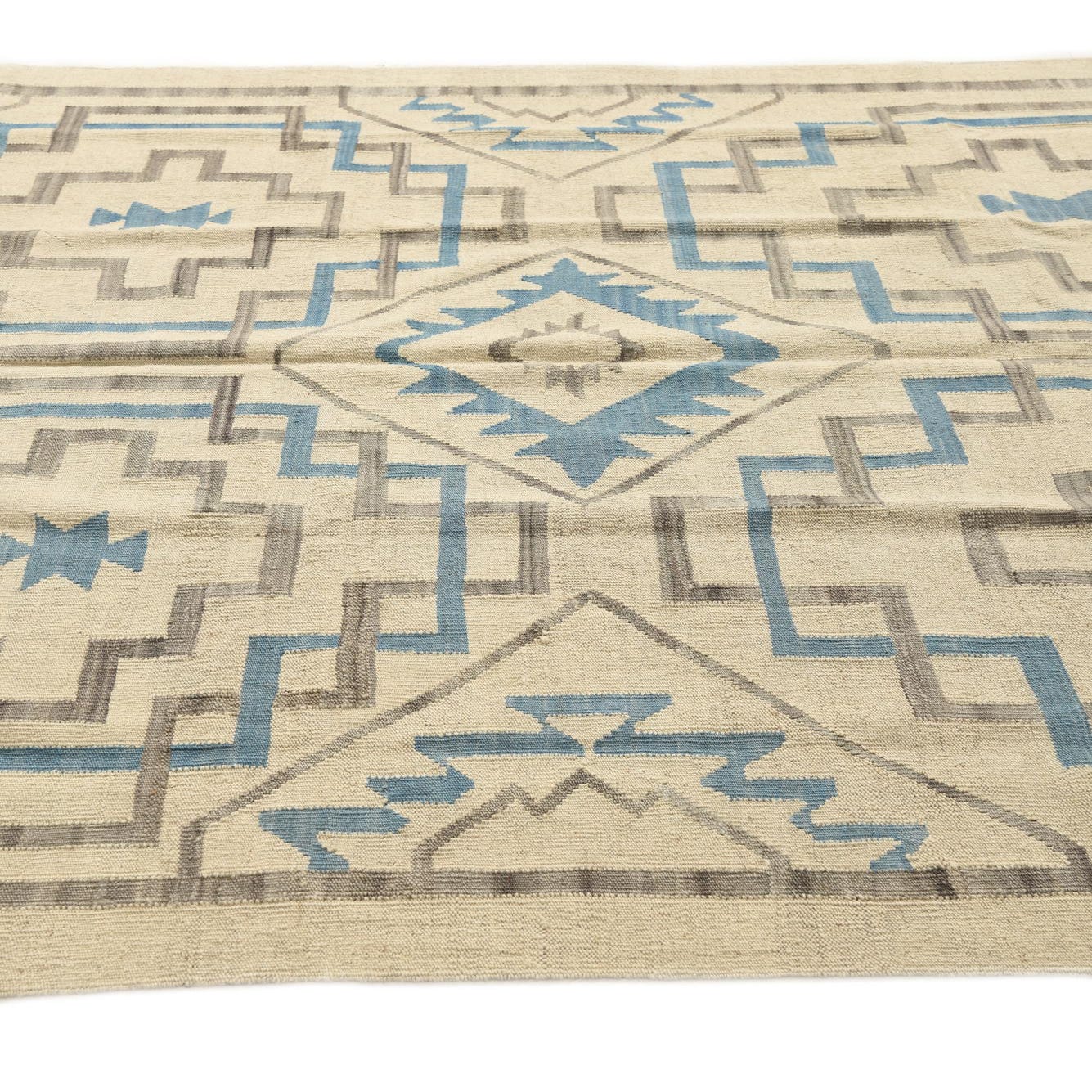 A 6x9 rectangular ivory wool rug with a modern tribal pattern in blue and gray, featuring geometric shapes and zigzags.