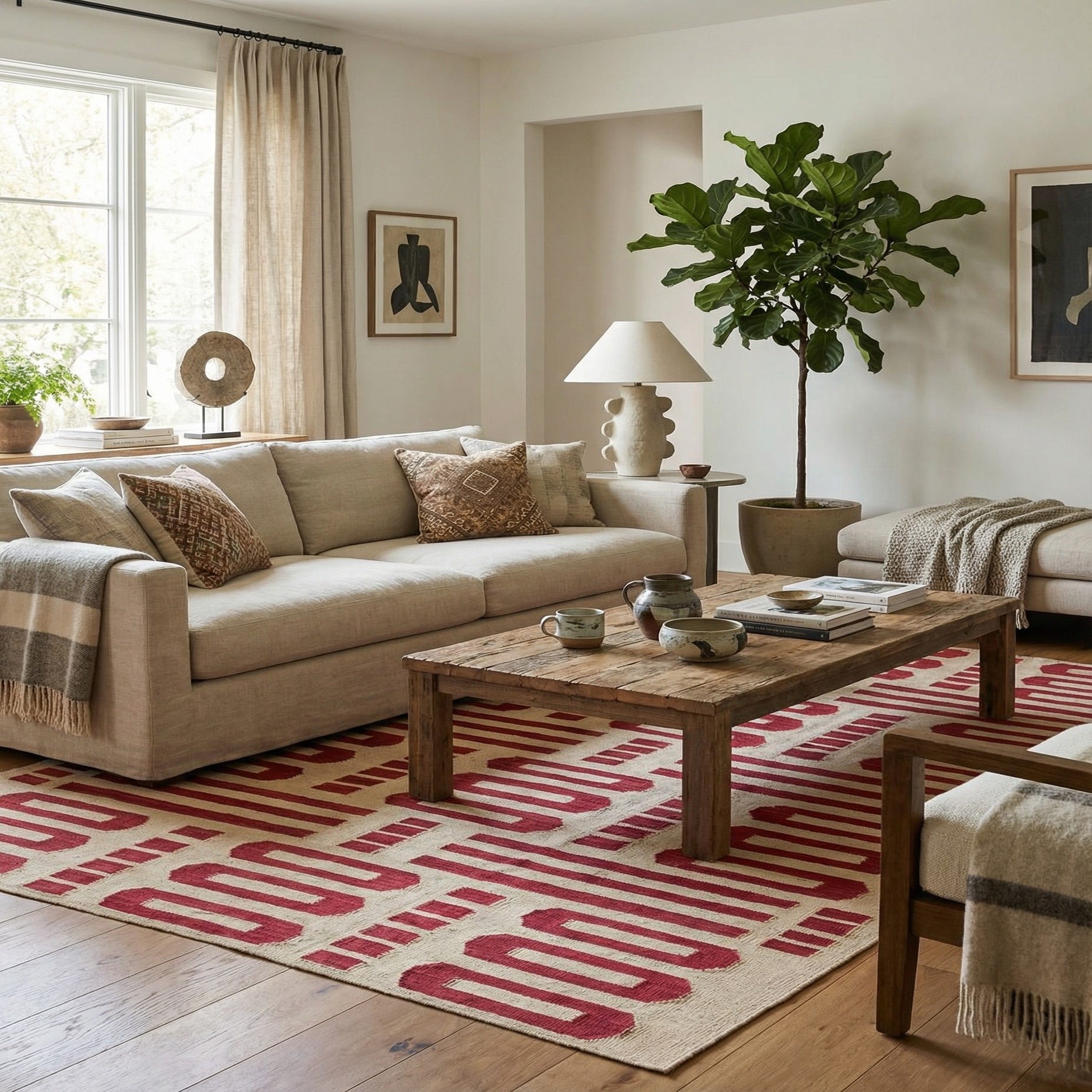 A 6x9 rectangular Kilim Modern rug with a geometric tribal pattern in ivory and deep red, suitable for a living room.