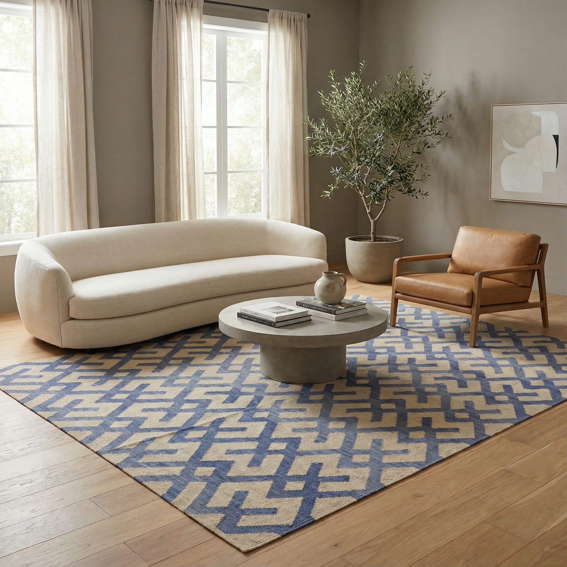 Crafted from 100% wool, the texture offers a natural feel underfoot with a flat weave that contributes to its durability and ease of placement within various interior settings. The rug's blue and ivory color scheme imbues it with a versatile quality, allowing it to complement a wide range of color palettes and decorative styles.