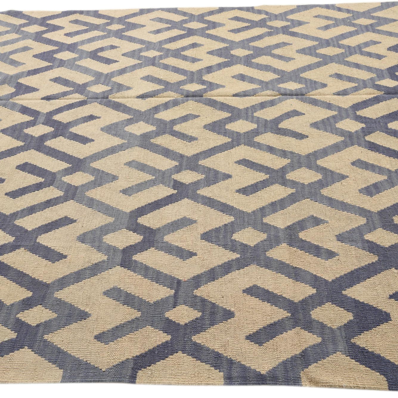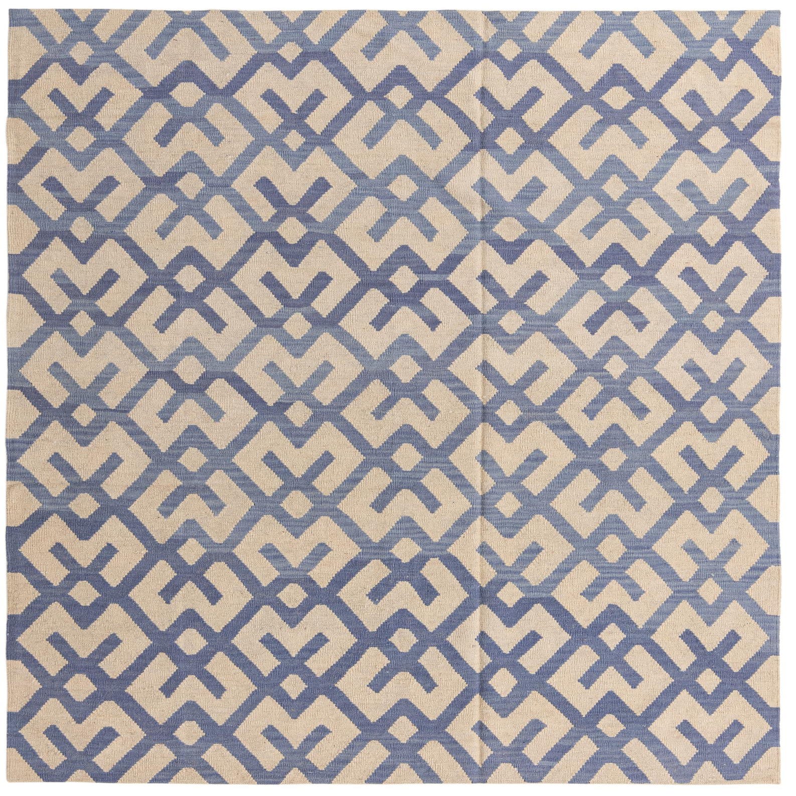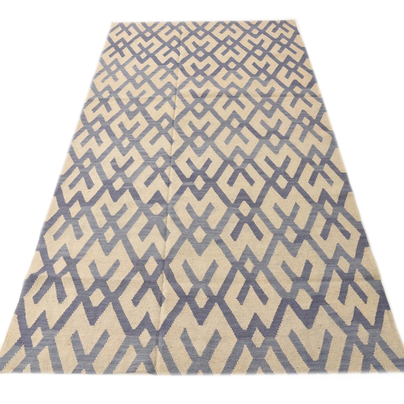 A 6x9 rectangular ivory and blue flatweave wool rug with a modern tribal geometric pattern.