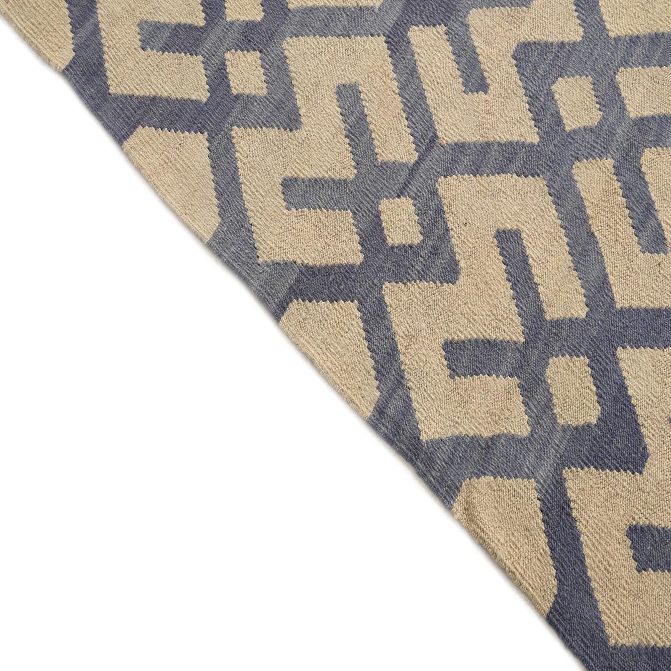 Part of the Kilim Modern collection, this hand-woven 6x9 rug presents a crisp and contemporary pattern that is at once both geometric and dynamic. The design showcases a series of interconnected angular motifs in blue, sharply contrasted against an ivory background, creating a bold visual statement.