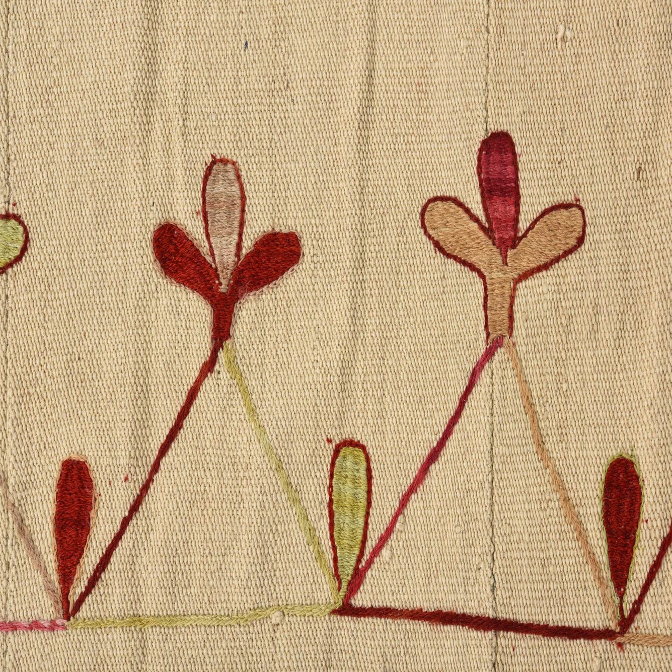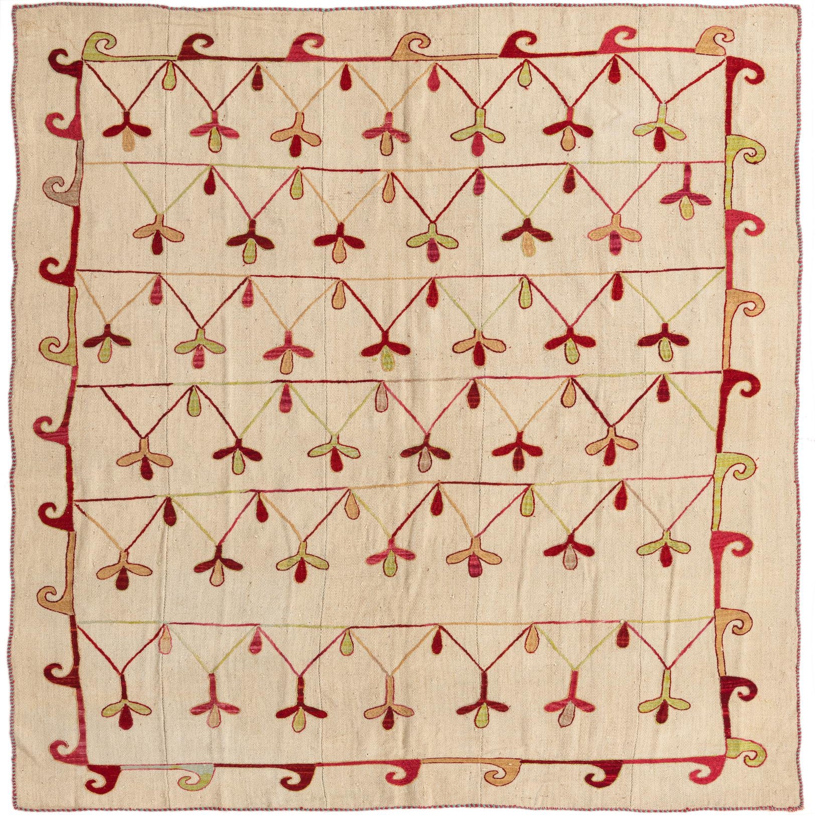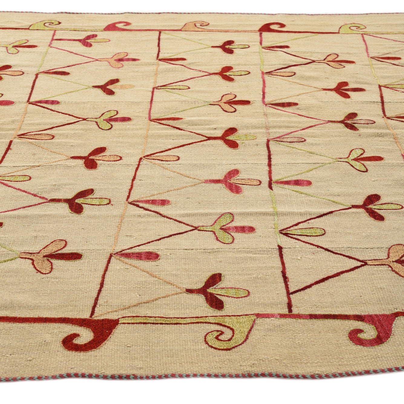 A 6x9 rectangular ivory flatweave rug with a tribal pattern of red, green, and gold abstract floral motifs.