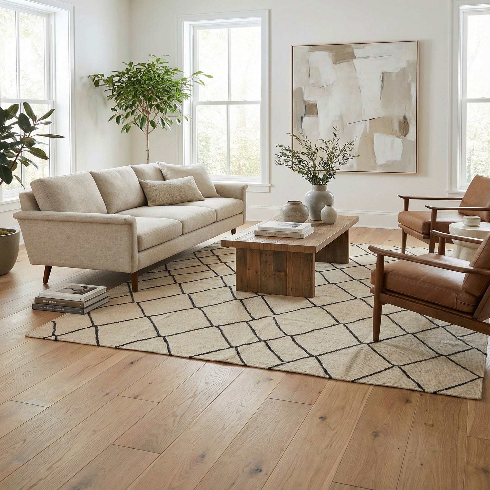 This rug works well as an anchor for modern and Scandinavian interiors, or to add contrast in a warm, natural scheme with wood and leather accents. Place it under a sofa and coffee table to define a seating area, beneath a simple dining table to keep the focus on form, or in an entryway to introduce graphic interest. Pair with black metal accents, soft neutrals, and layered textiles for a balanced, lived-in feel.