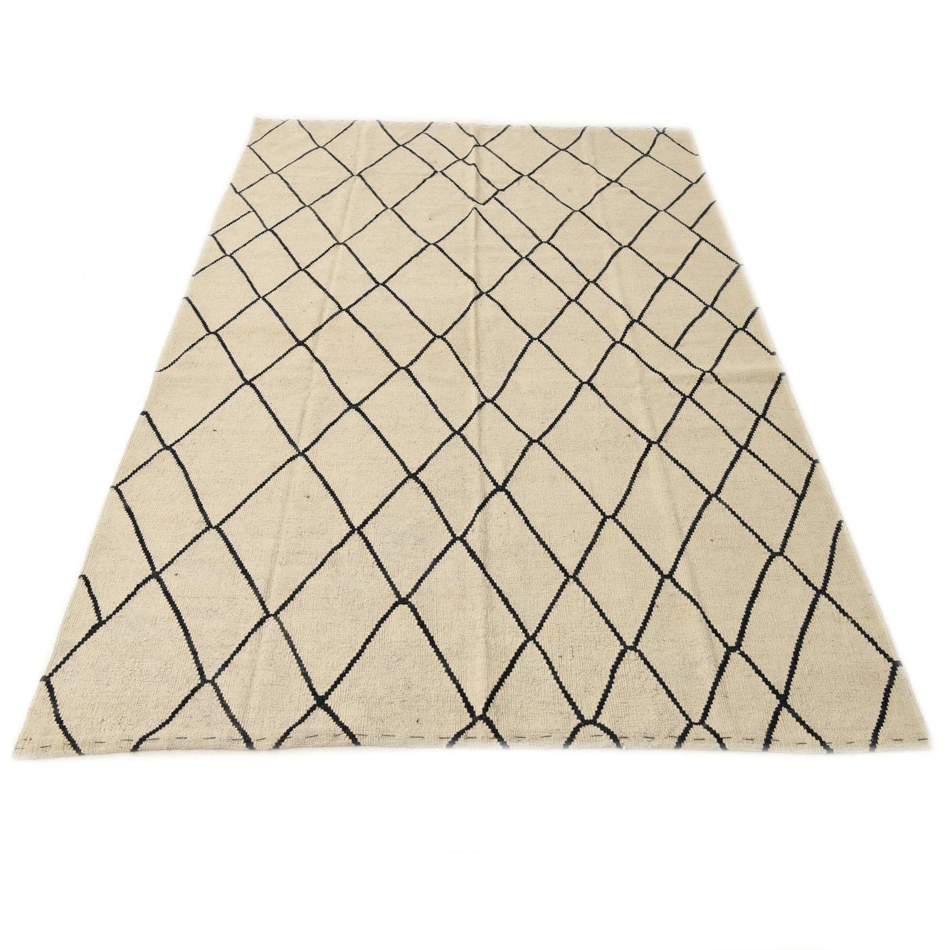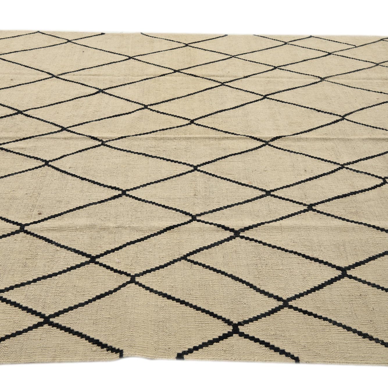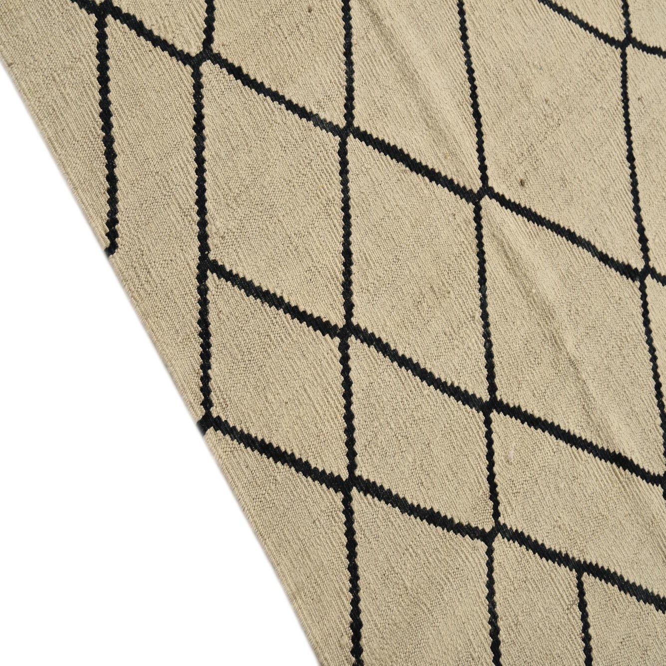 Hand-woven from 100% wool, this flatweave rug pairs an ivory field with a strong black lattice of irregular diamond lines for a relaxed, geometric look. The drawn, slightly uneven lines give the pattern a handcrafted character, while the wool construction produces a matte, tactile surface with subtle variations in texture and visible weave detail. The low, flat profile sits close to the floor and feels grounded beneath furniture without adding bulk.