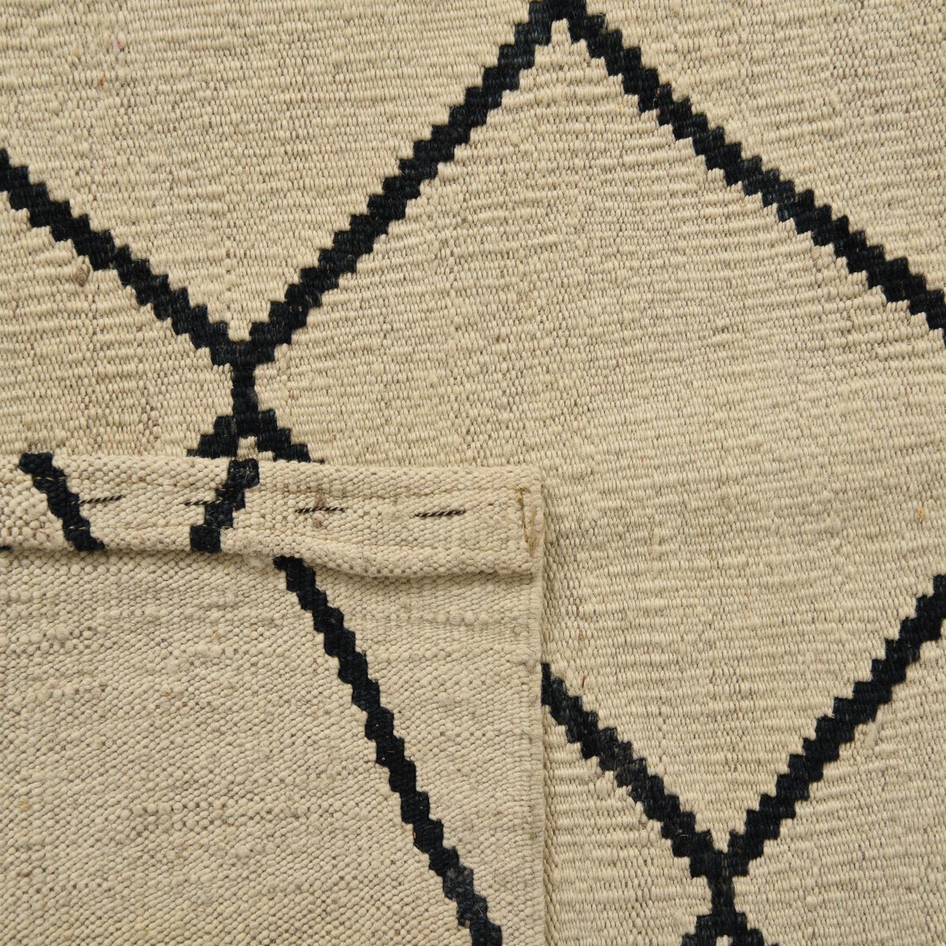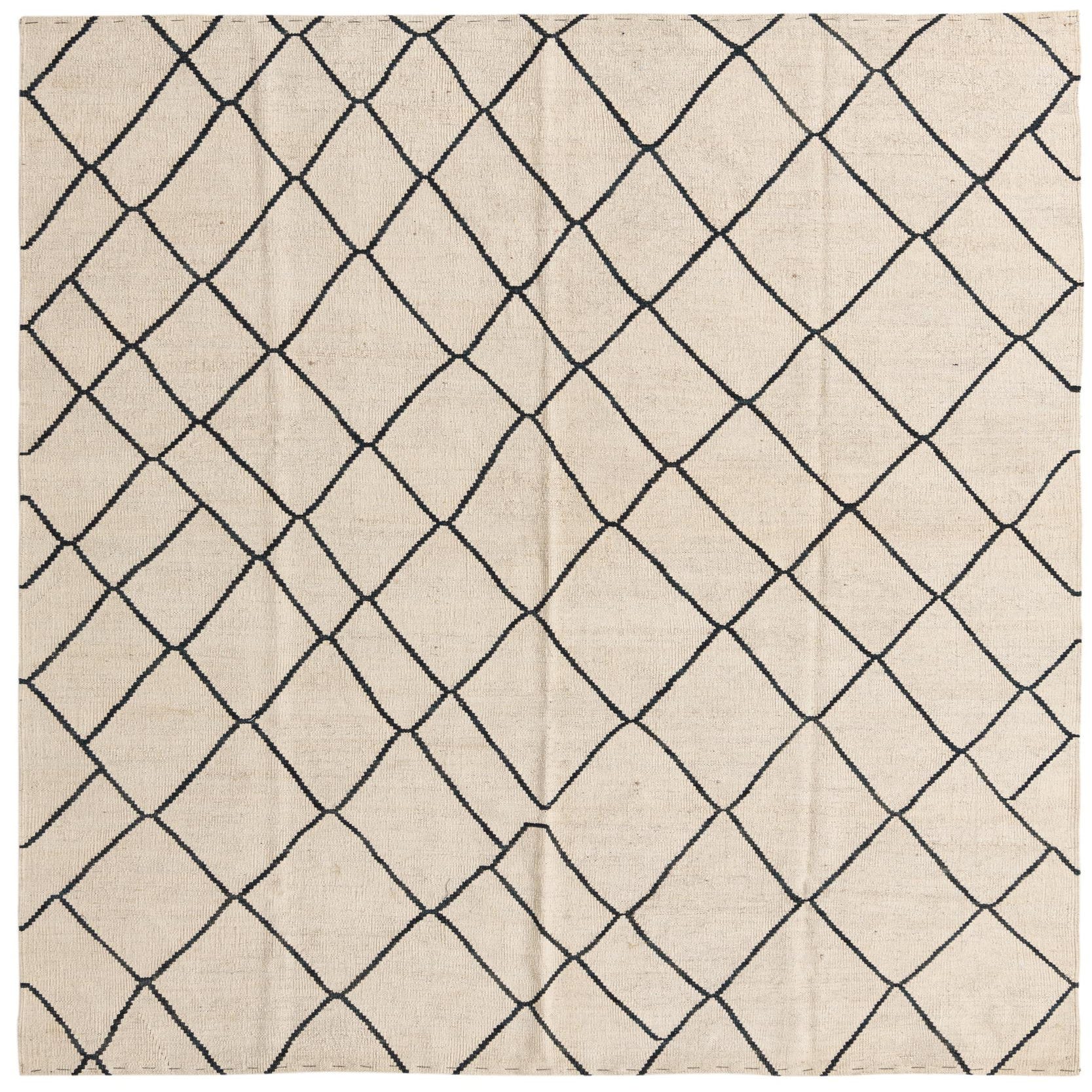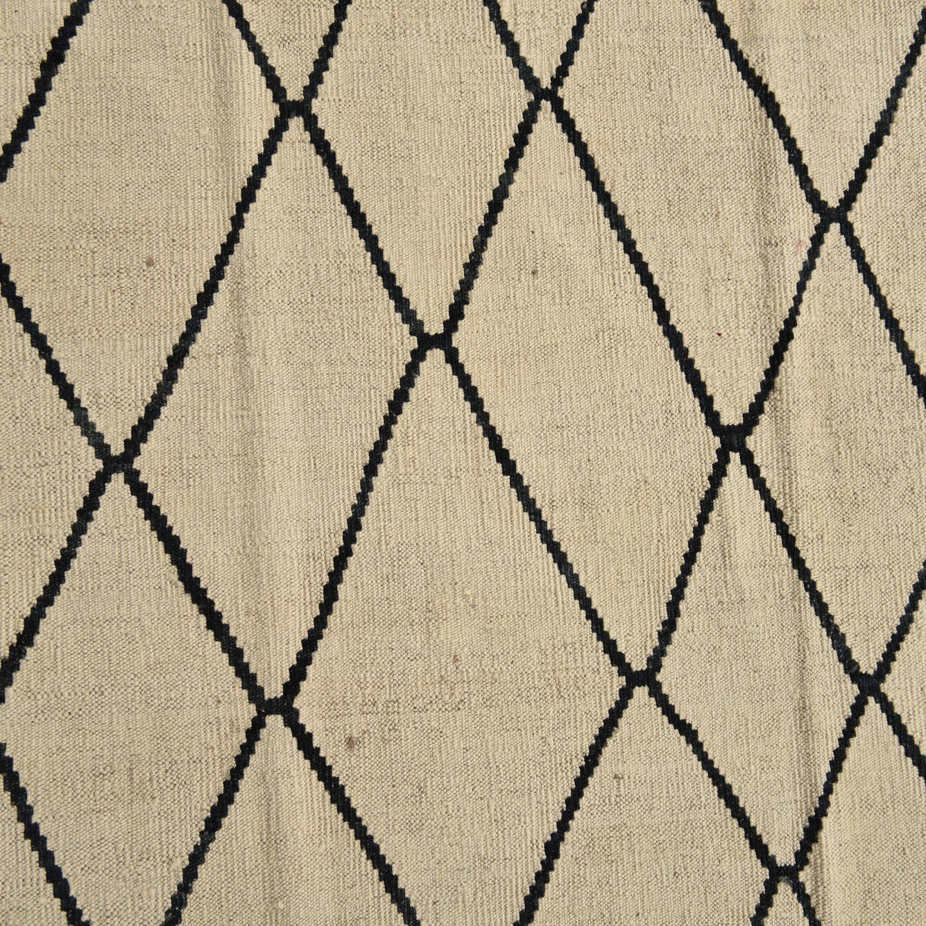 Hand-woven from 100% wool, this flatweave rug pairs an ivory field with a strong black lattice of irregular diamond lines for a relaxed, geometric look. The drawn, slightly uneven lines give the pattern a handcrafted character, while the wool construction produces a matte, tactile surface with subtle variations in texture and visible weave detail. The low, flat profile sits close to the floor and feels grounded beneath furniture without adding bulk.
