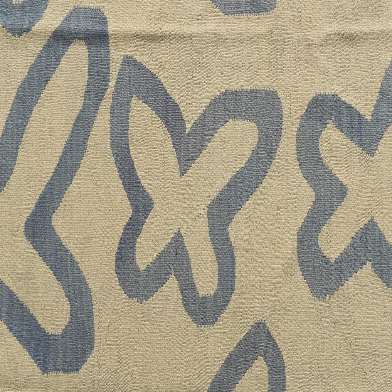 This Kilim Modern 6x9 rug, handwoven of 100% wool, presents a striking pattern with a clean, geometric design that is both timeless and contemporary. The prominent pattern features an array of ivory and blue shapes that take inspiration from traditional kilim motifs, offering visual interest without overwhelming your space. The ivory background serves as a neutral canvas, allowing the blue details to stand out, creating a serene yet playful ambiance.