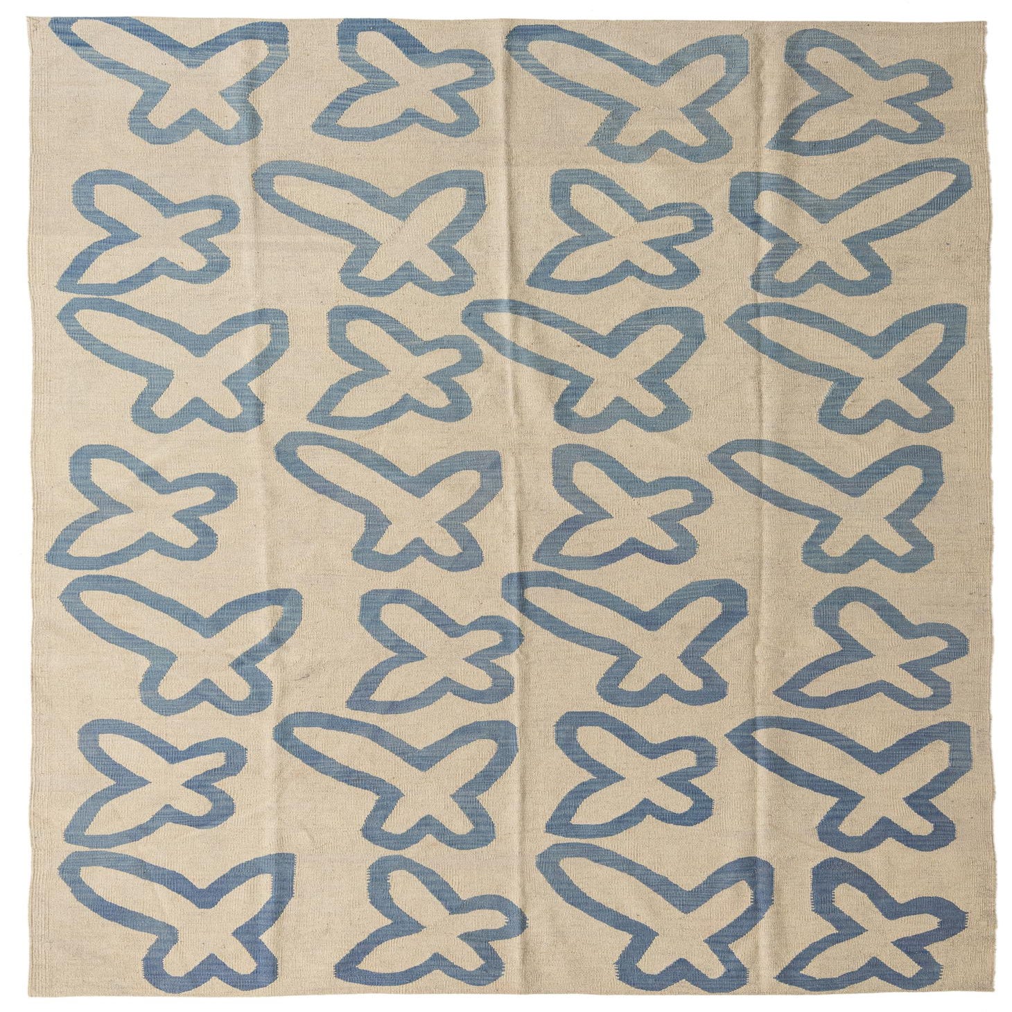 A 6x9 rectangular flatweave rug with a cream background and a repeating pattern of abstract blue butterfly-like shapes.
