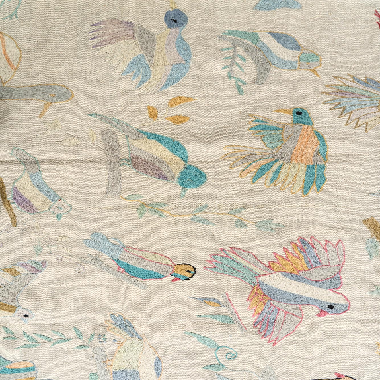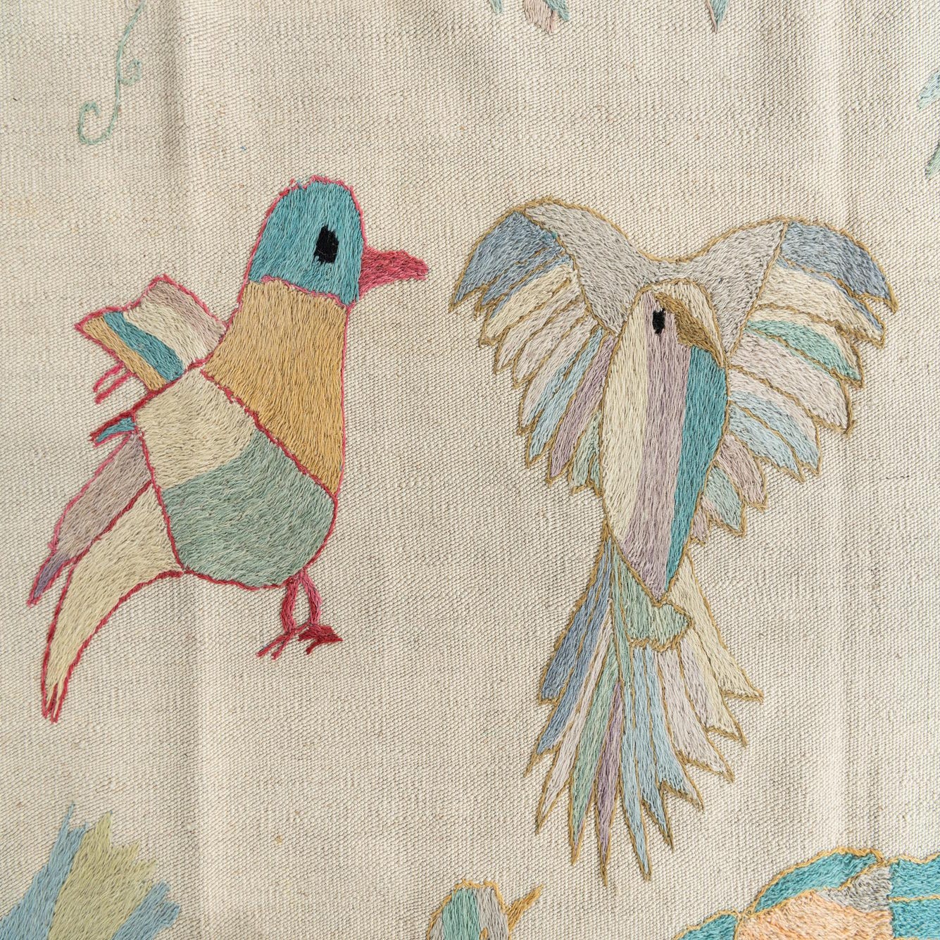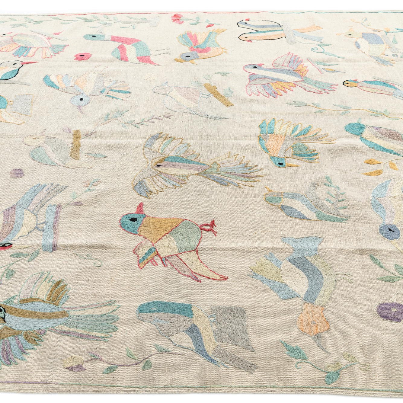 From the Kilim Suzani collection, this hand-woven 6x9 wool rug features a charming array of bird motifs that grace the ivory background with an artful finesse. A harmonious blend of beige, blue, brown, light blue, olive, orange, violet, and green hues brings a vibrant and yet subdued palette that complements its visual narrative. The light woolen texture offers a soft, tactile experience underfoot, indicative of its quality craftsmanship.