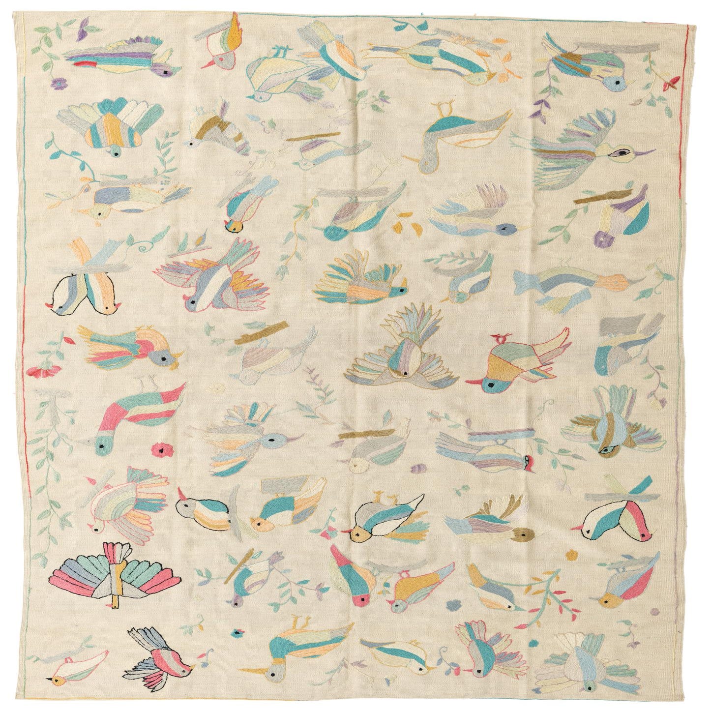 A 6x9 rectangular ivory flatweave rug featuring a vibrant, whimsical pattern of colorful birds and delicate floral vines, perfect for a living room.