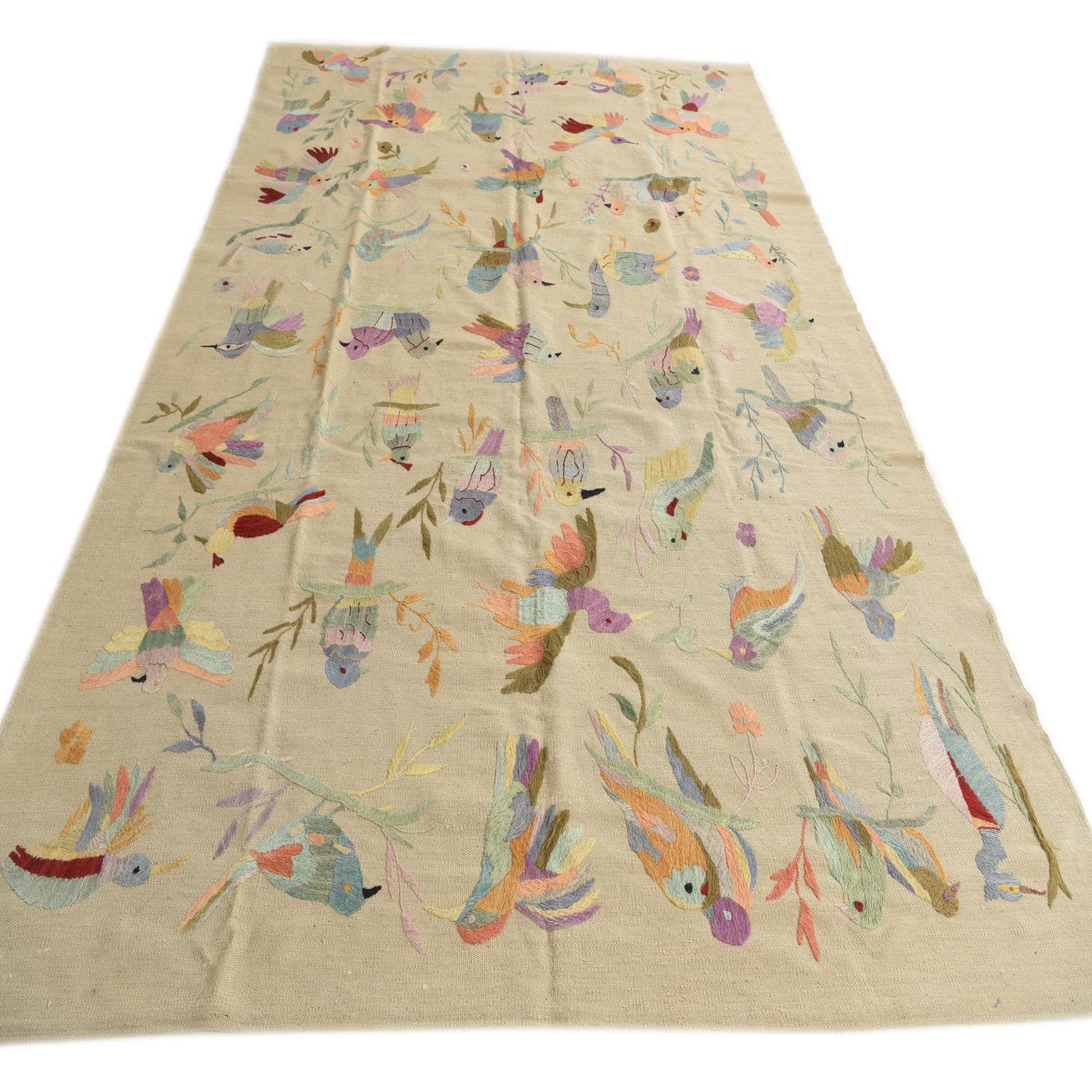 A 6x9 rectangular ivory flatweave rug featuring a vibrant, multicolored tribal bird and floral pattern.