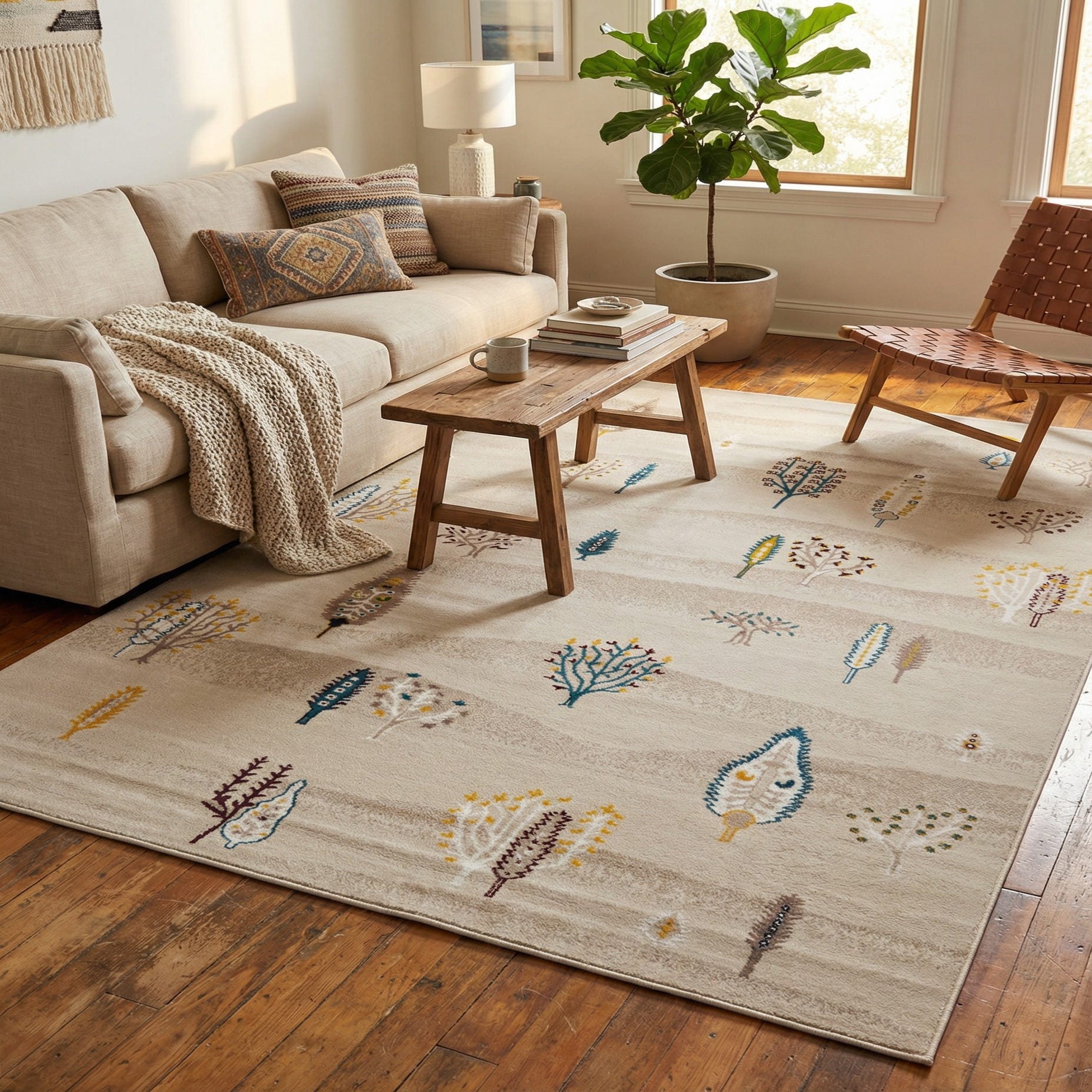 The Laguna collection 6x9 area rug is a versatile addition to any room, crafted from durable polypropylene. Its inviting ivory background sets the stage for a playful yet refined array of colors including gray, blue, burgundy, yellow, and black. The pattern features an assortment of stylized botanical motifs, rendered in a contemporary form with a hint of abstraction, giving the rug an eclectic and modern appeal.