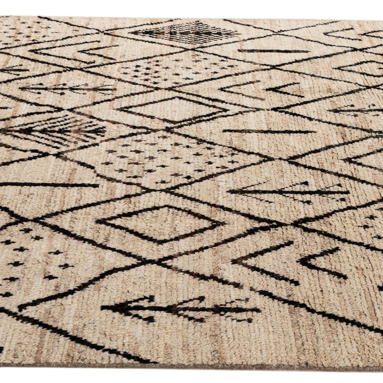 A 6x9 rectangular ivory wool rug with a black tribal geometric pattern, featuring diamonds and abstract symbols.