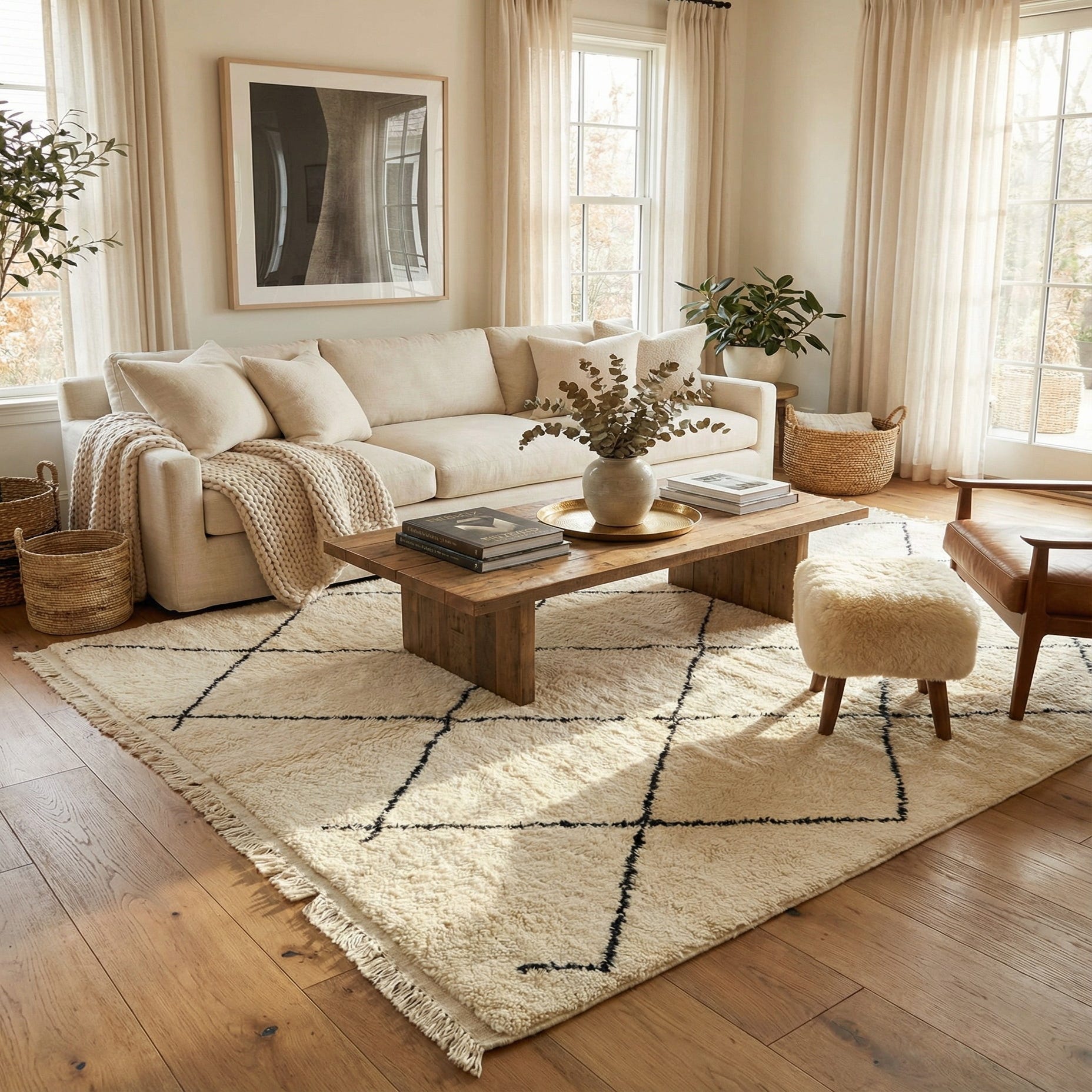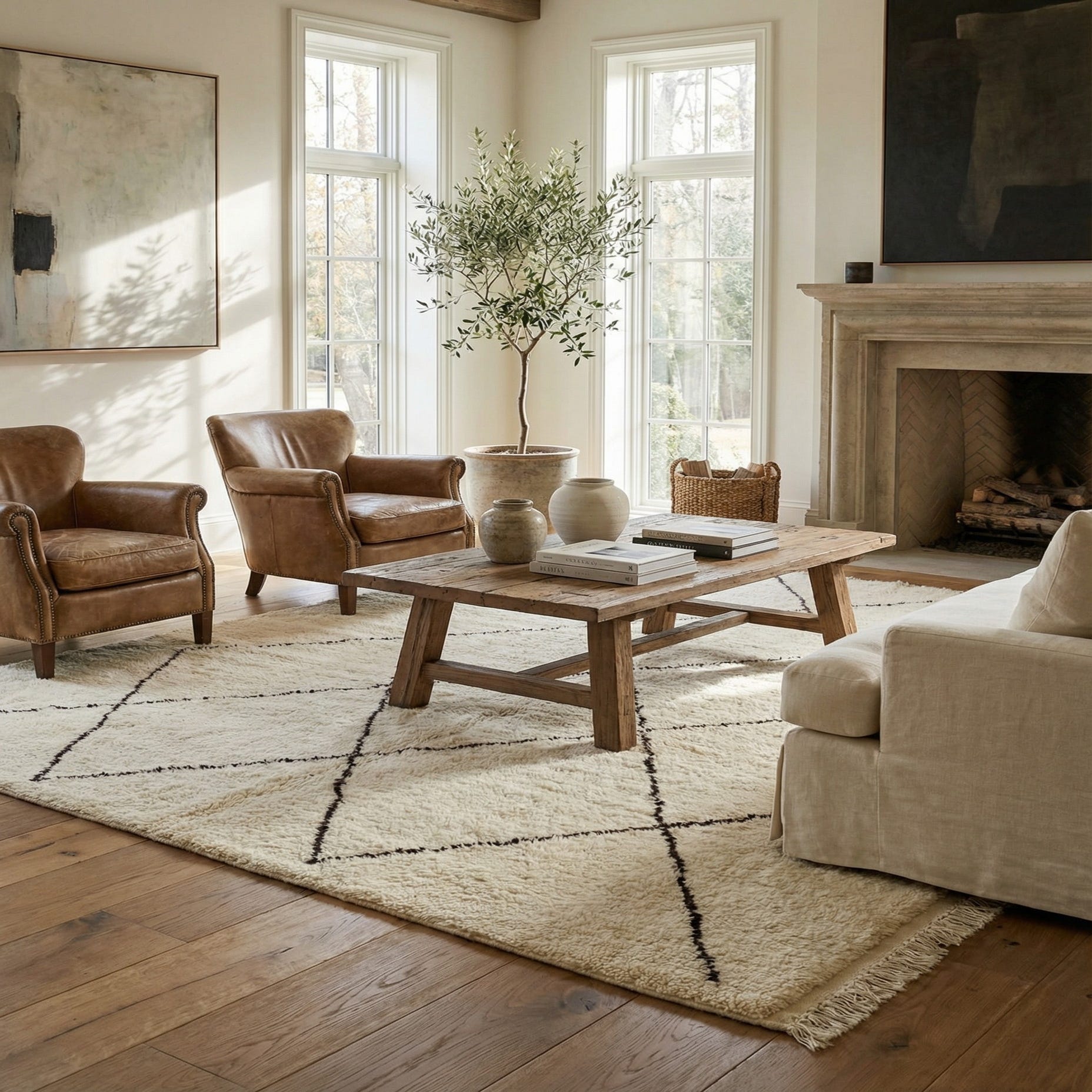 This Moroccan collection rug could be seamlessly integrated into minimalist decor to add texture, or it would be equally at home in a bohemian setting where its artisanal qualities would be celebrated. Additionally, it could enhance a modern farmhouse aesthetic or stand as a statement piece within a Scandinavian-inspired space, where its clean lines and monochromatic palette would blend harmoniously with the design ethos.