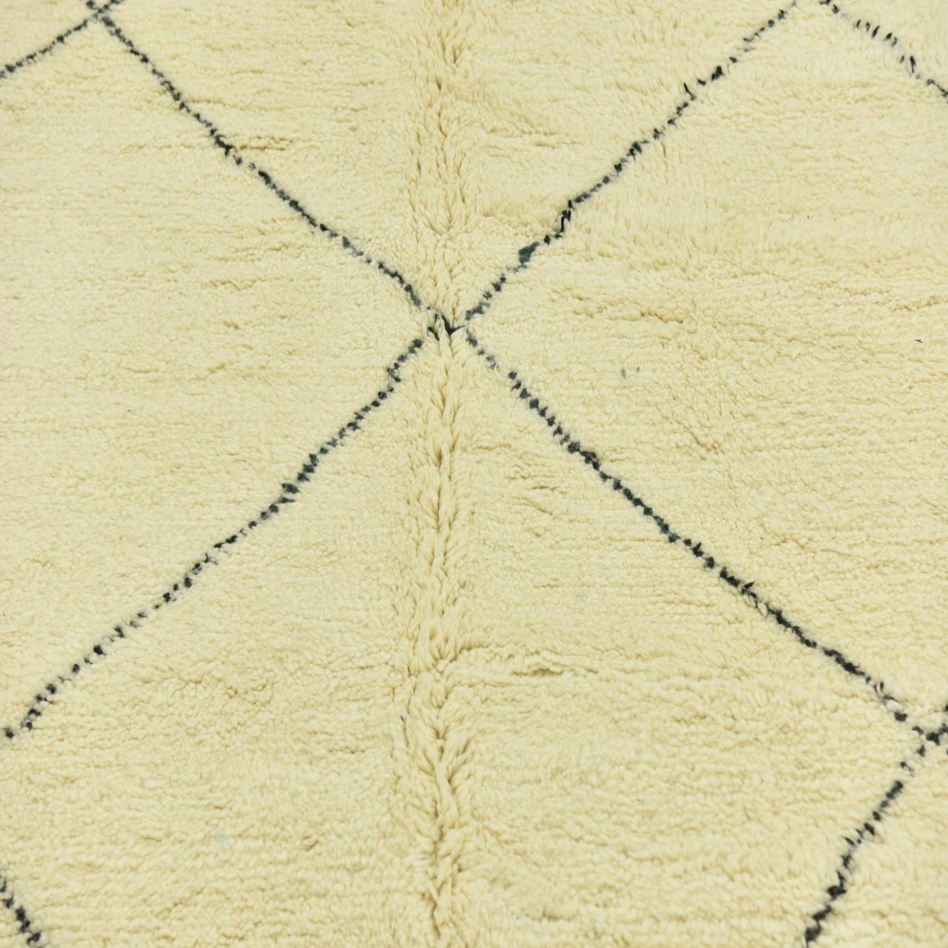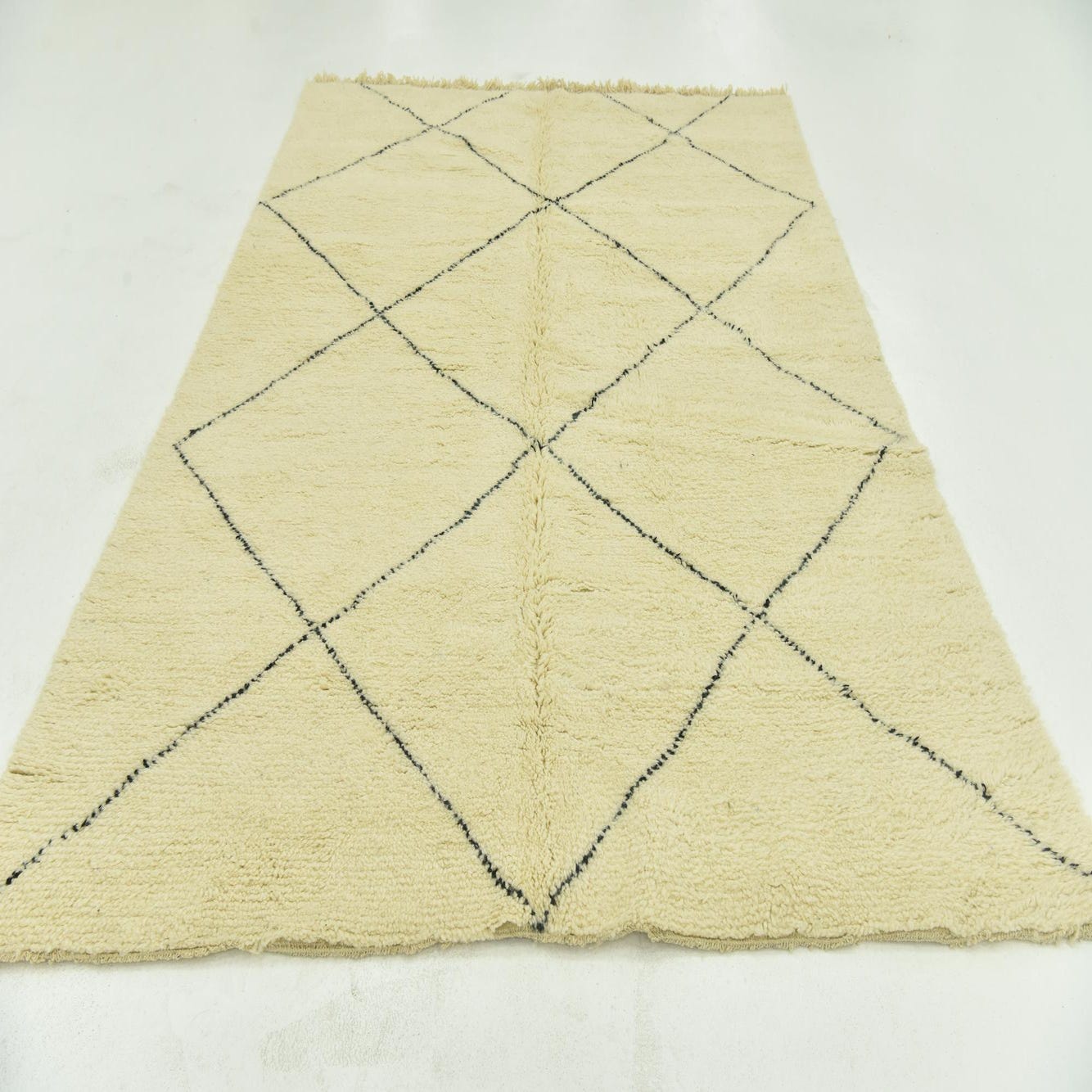 This Moroccan collection hand-knotted rug showcases a simplistic yet bold geometric pattern, characterized by clean lines forming diamond motifs in black against an inviting ivory backdrop. Made from 100% wool, the rug offers a plush texture contributing to its comfortable underfoot feel. The piece measures a versatile 6x9, making it suitable for a variety of room sizes and furniture arrangements.