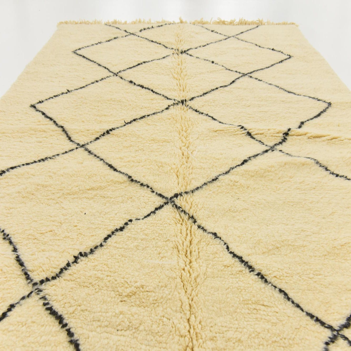 The design features a simple yet bold geometric pattern, with sharp black lines forming a series of diamonds across the ivory background. This striking contrast imbues the rug with a contemporary edge, despite its traditional origins. The addition of fringe on either end adds a classic touch, providing a delightful textural finish and a nod to authenticity.