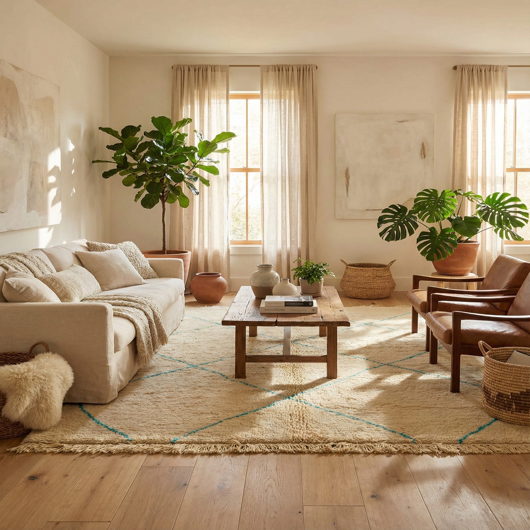 This Moroccan collection 6x9 rug is hand-knotted of 100% wool and showcases a minimalist design that is both timeless and versatile. Its ivory background is paired with light blue geometric lines, forming a classic diamond lattice pattern that is characteristic of Moroccan-inspired decor. The wool construction provides a plush, inviting texture underfoot.