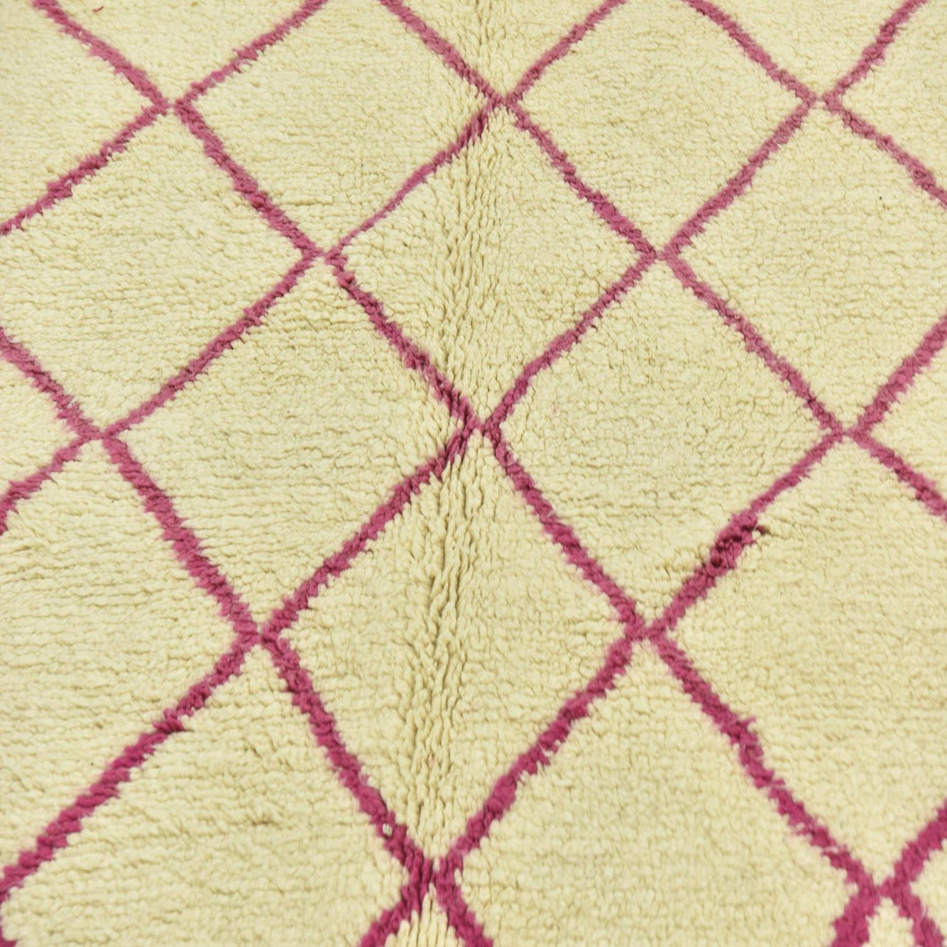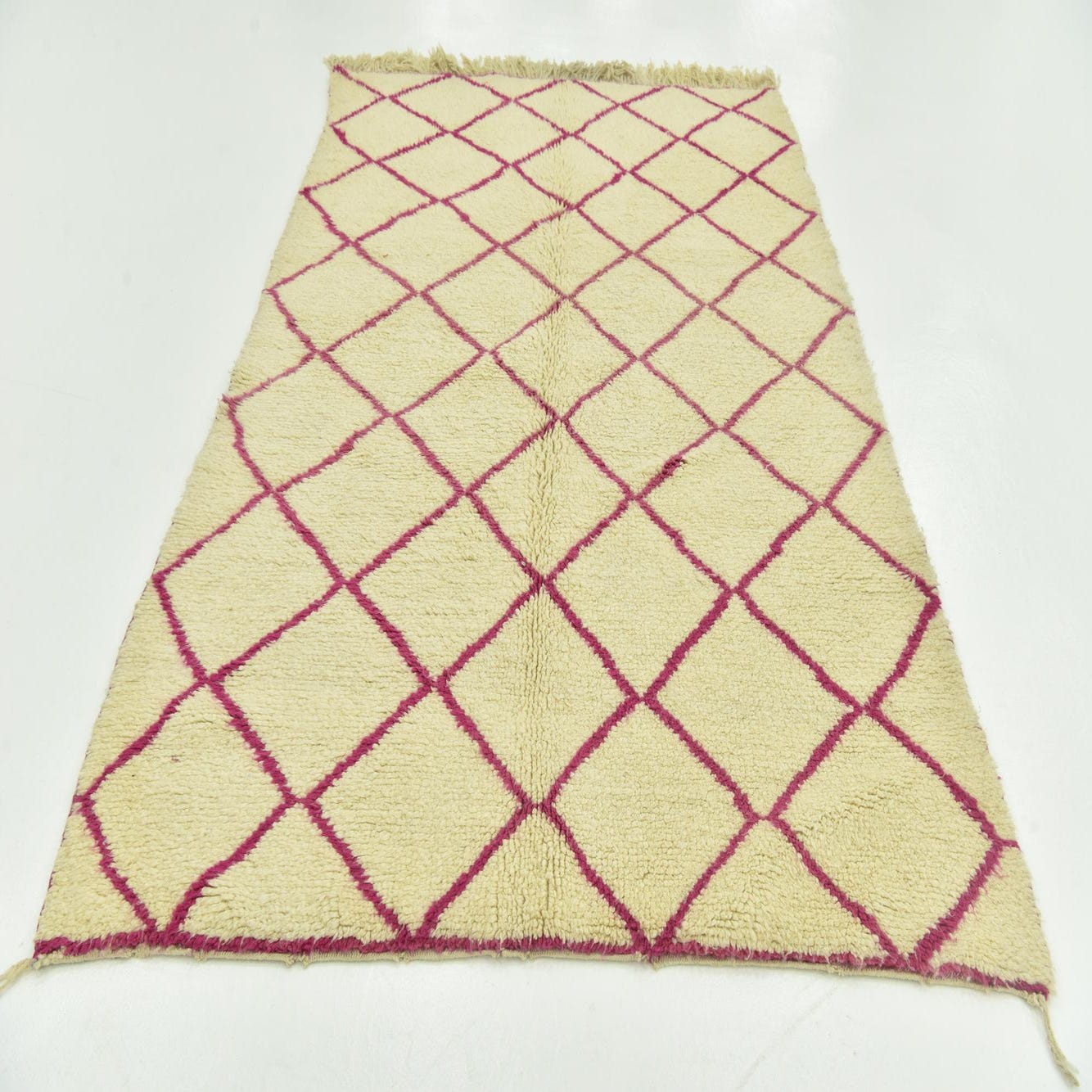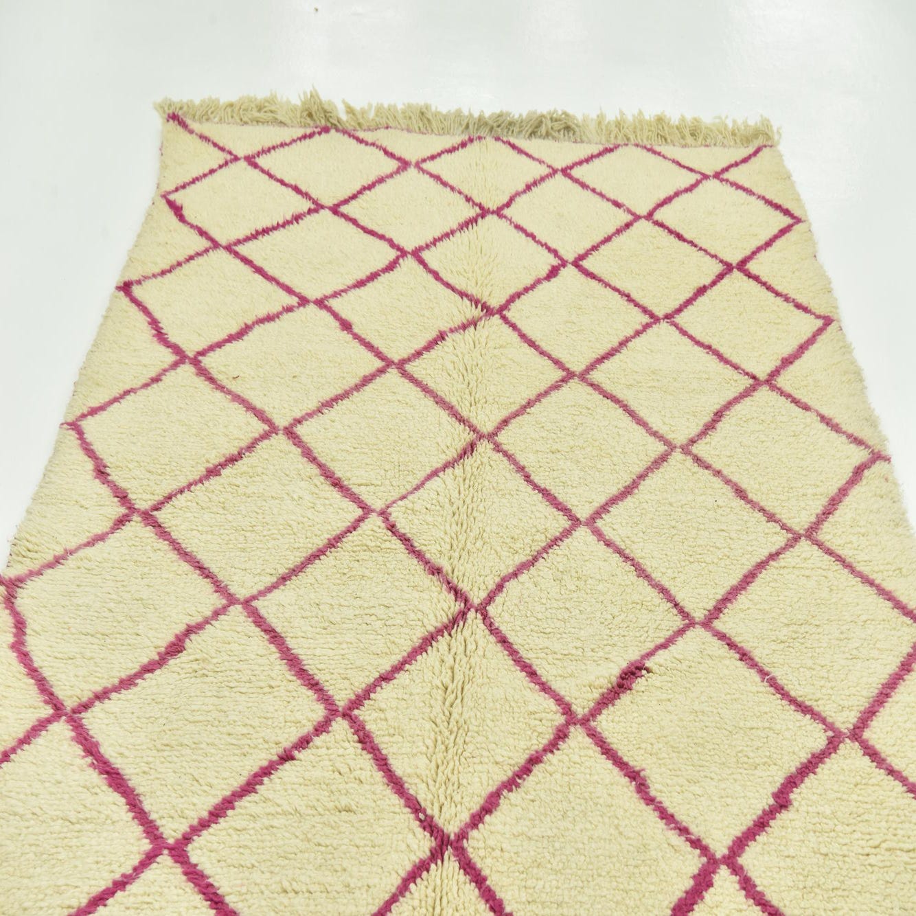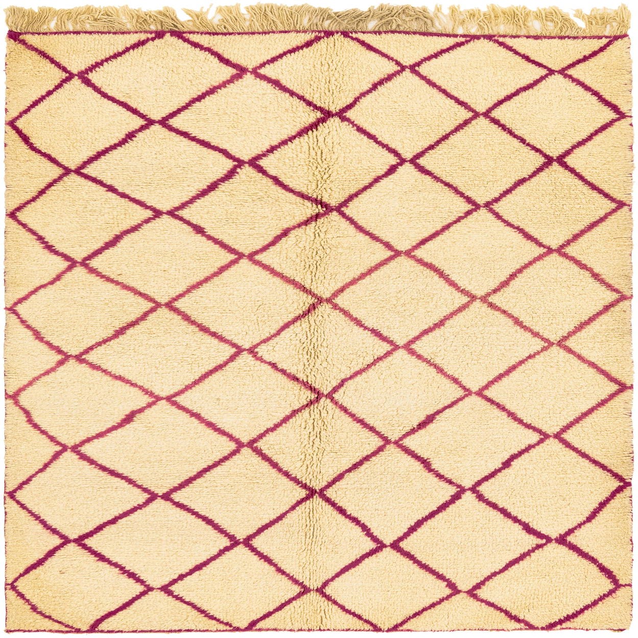 This Moroccan collection rug offers a simplistic yet compelling design that easily serves as the exemplar representation of modern decor. With hand knotted craftsmanship, this 6x9 piece is rendered in 100% wool, providing both durability and a soft texture. The rug showcases a sharp contrast between its ivory background and the pink geometric diamond pattern, bringing a sense of depth and structured aesthetic to any space.