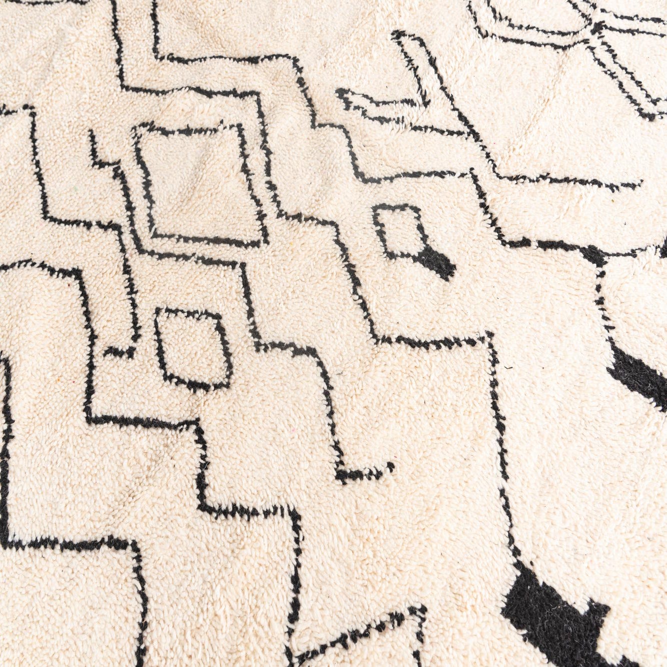 In terms of interior design, the rug's neutral ivory and black color palette lends itself to various decor scenarios. Its bold pattern can serve as the focal point in a minimalist setting or harmonize with eclectic furnishings in a bohemian-inspired space. Additionally, the rug's significant dimensions make it well-suited for defining a living area or anchoring a dining set, providing both visual interest and a comfortable underfoot experience.