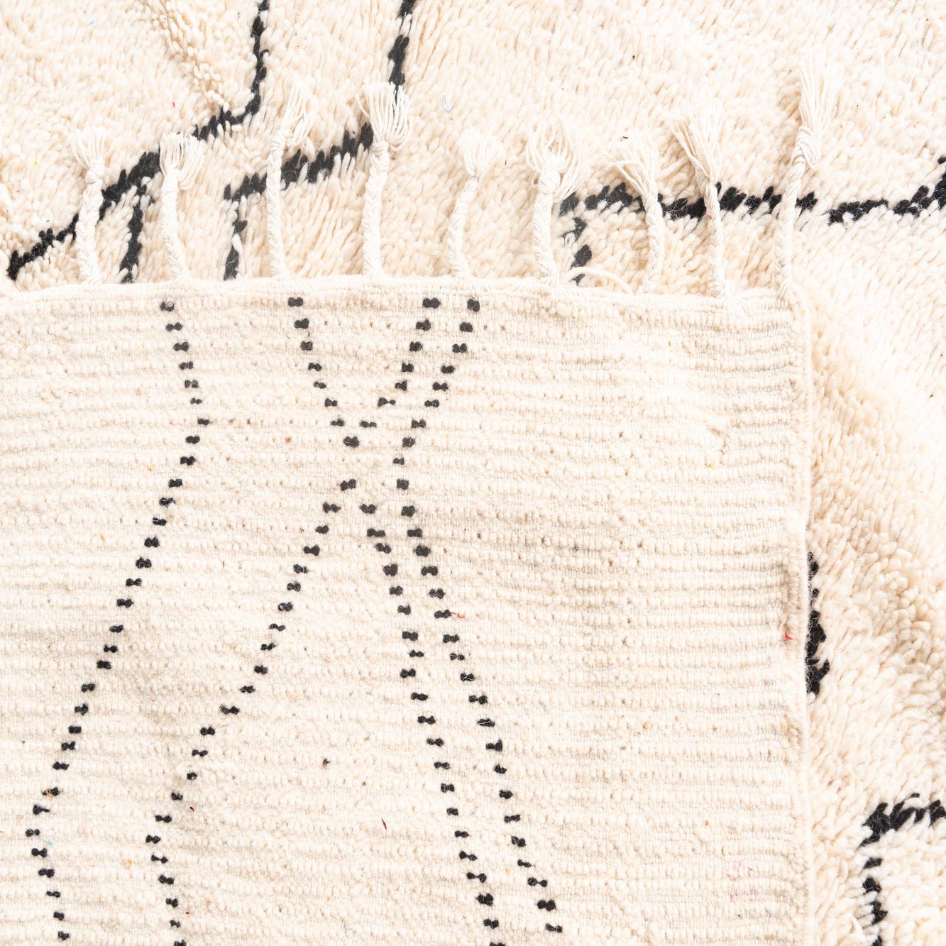 This Moroccan Collection rug boasts a timeless design that showcases a bold geometric pattern set against a plush ivory background. The contrasting black motifs, featuring a mix of linear and diamond shapes, create a sense of movement and depth across the hand-knotted wool surface. The texture is rich and tactile, evoking the traditional craftsmanship that underpins this semi-antique piece. Measuring 6x9, the rug is edged with fringe, adding an authentic, textural finish to its perimeter.
