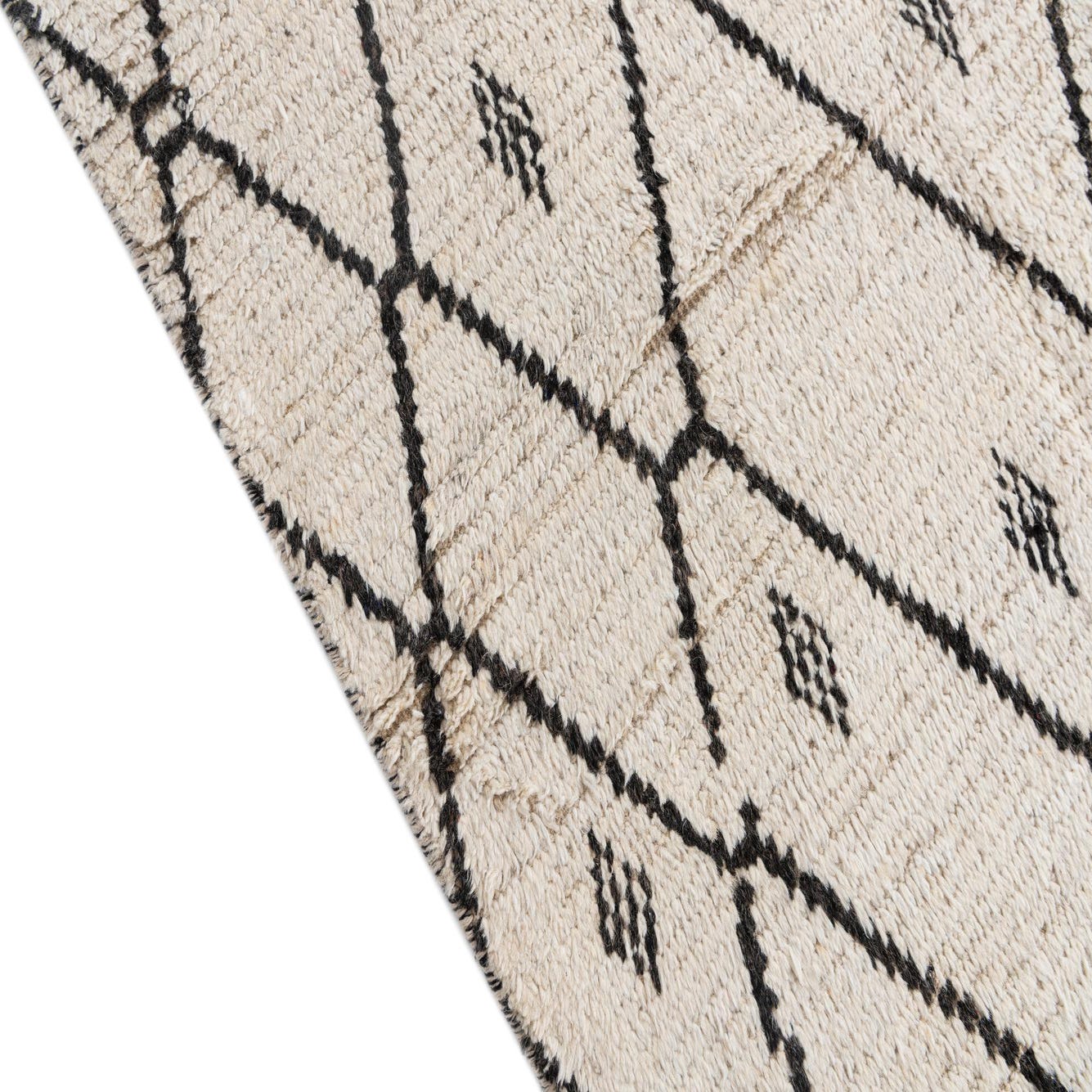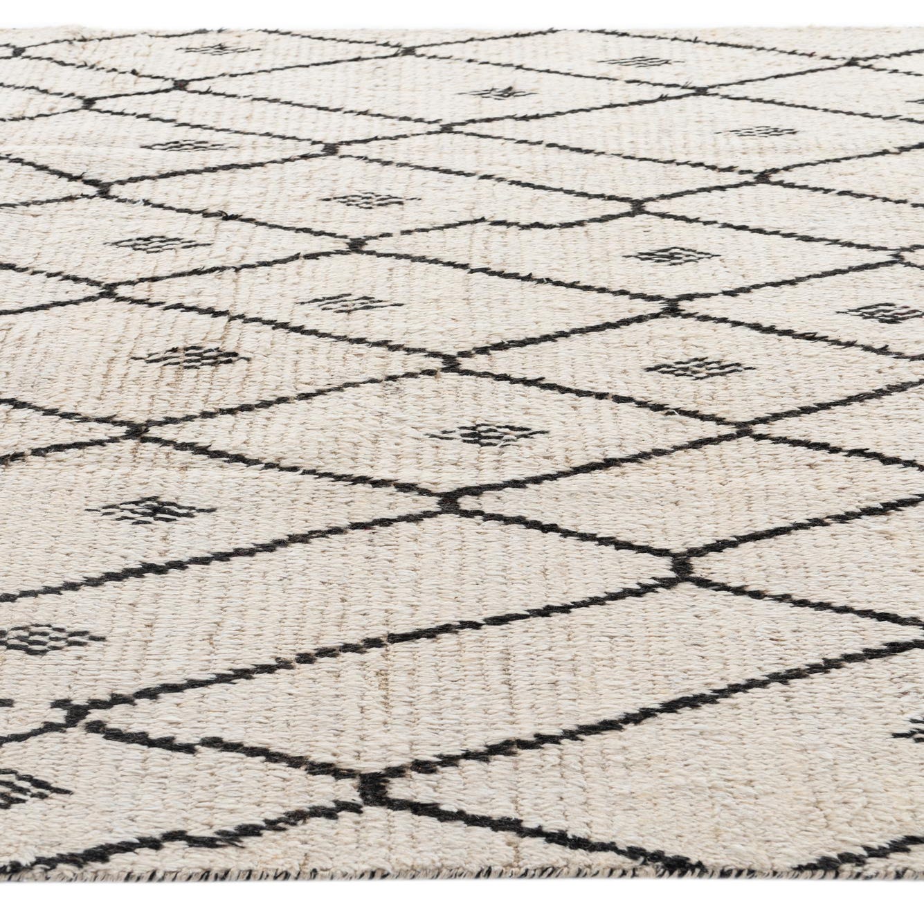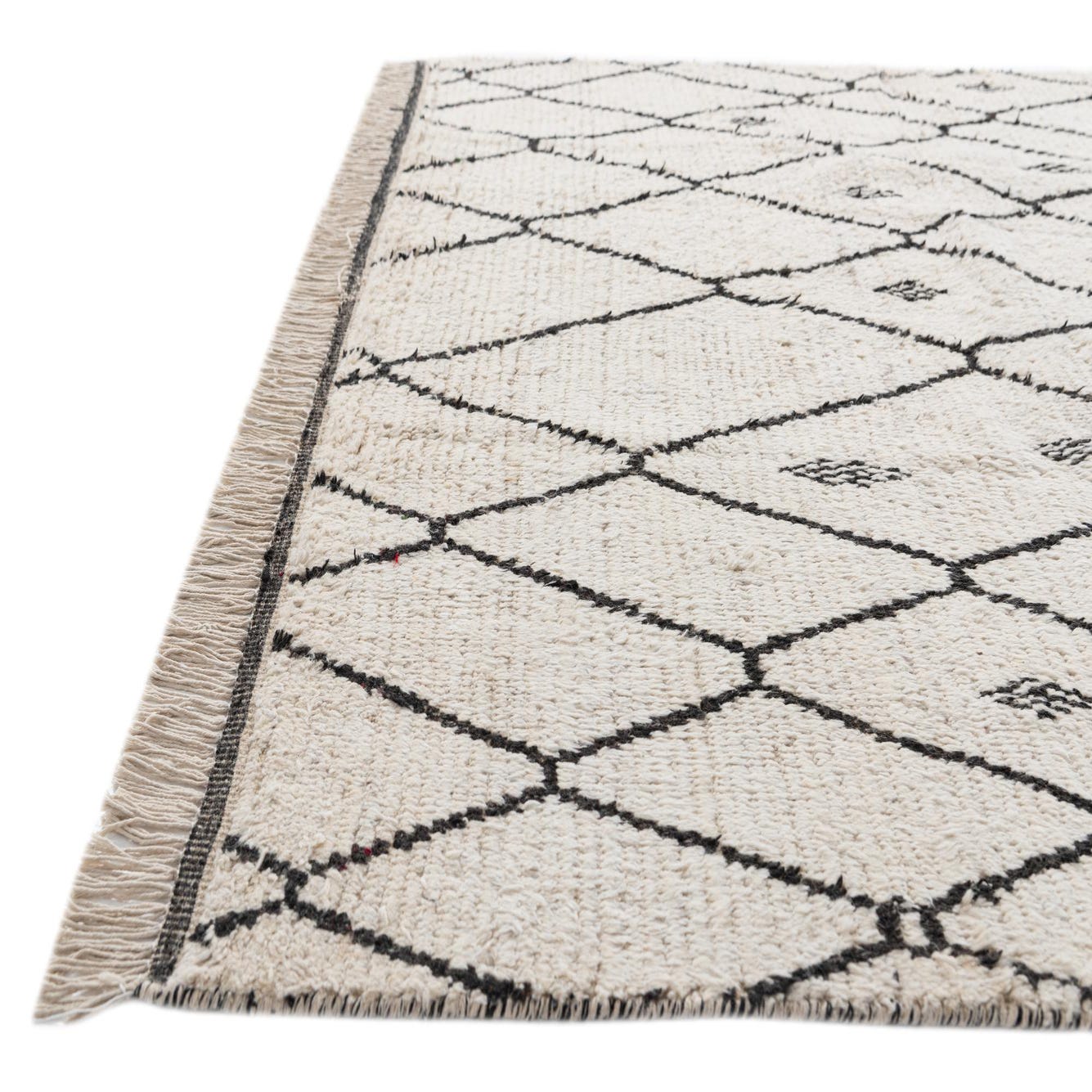 A clean ivory field is woven with a hand-drawn black diamond lattice, punctuated by small internal lozenges that add rhythm and visual interest. The knotted wool surface has a soft, tactile quality—plush underfoot with a subtly uneven, handcrafted texture that gives depth to the neutral palette. Finished with short fringed ends, the rug balances a relaxed, lived-in feel with crisp, geometric patterning.