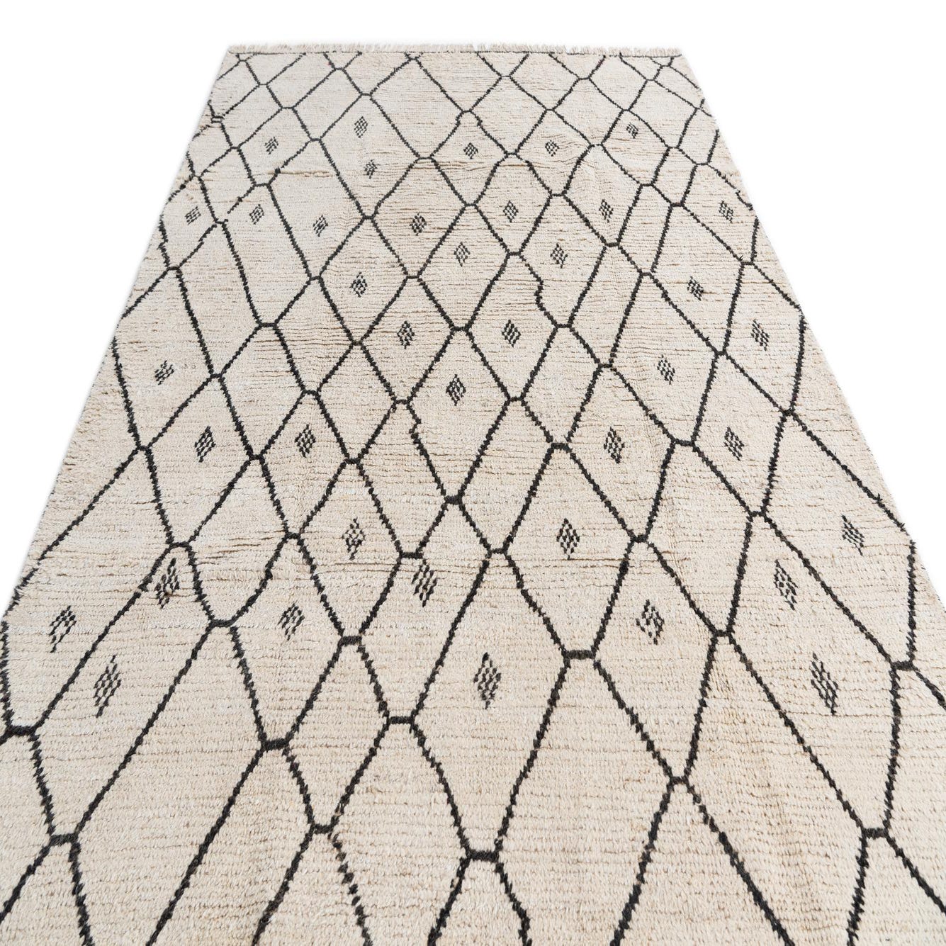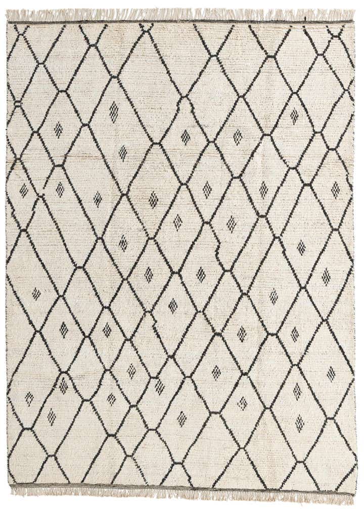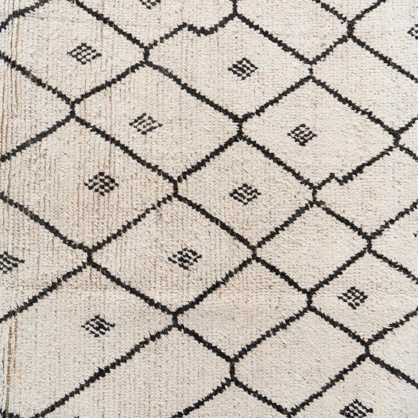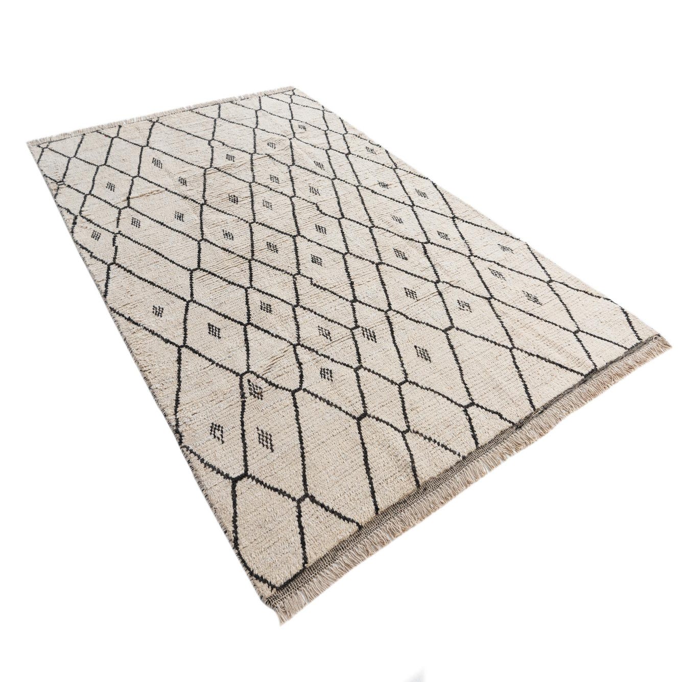 A clean ivory field is woven with a hand-drawn black diamond lattice, punctuated by small internal lozenges that add rhythm and visual interest. The knotted wool surface has a soft, tactile quality—plush underfoot with a subtly uneven, handcrafted texture that gives depth to the neutral palette. Finished with short fringed ends, the rug balances a relaxed, lived-in feel with crisp, geometric patterning.