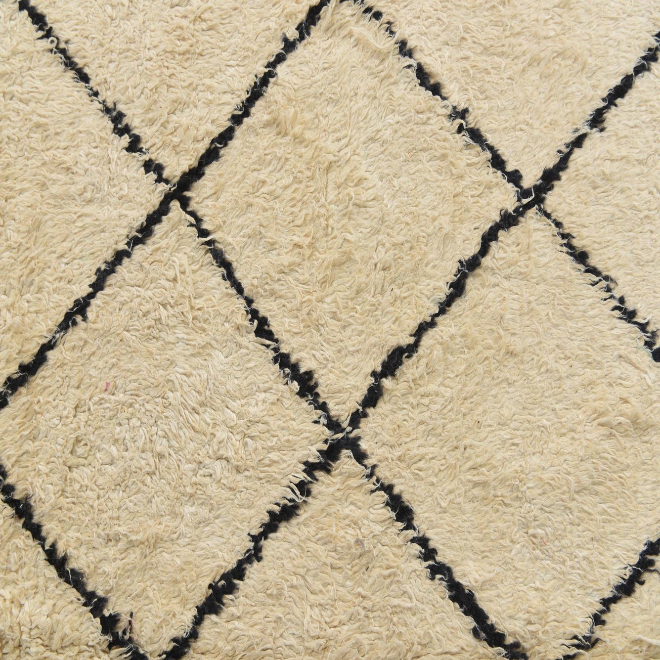 This Moroccan collection rug features hand-knotted construction and is crafted from 100% wool, providing a plush and comfortable foundation for any room. The design showcases a series of black diamond motifs arrayed across an ivory background, creating a bold, geometric pattern. The use of high contrasting colors emphasizes the rug's crisp, clean lines, while the fringe on either end adds a traditional touch.