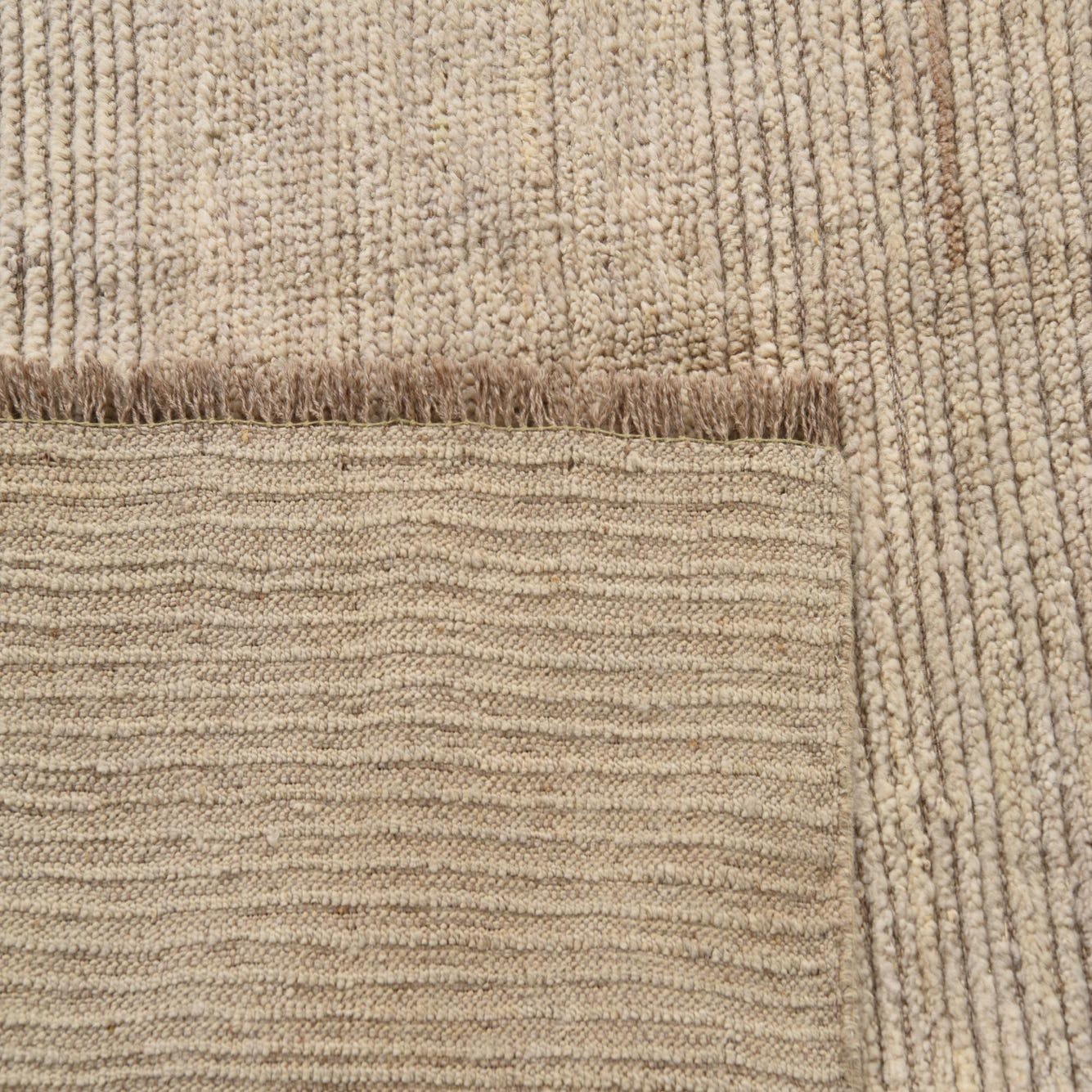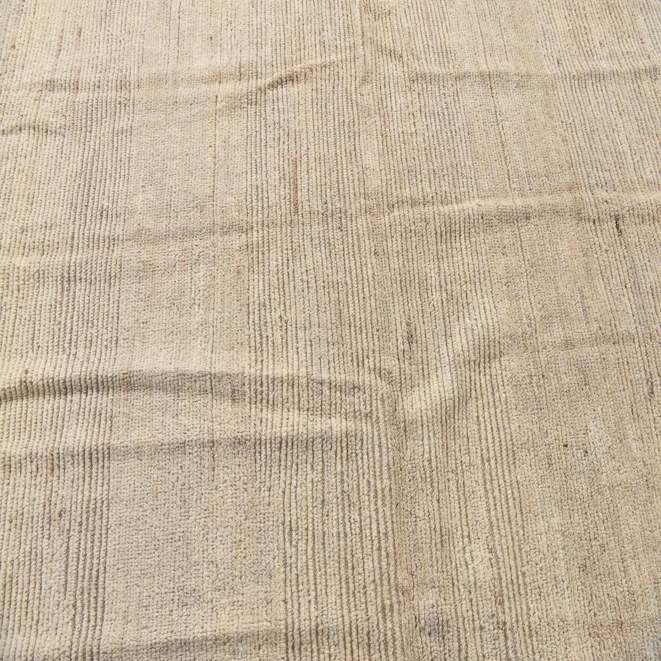 A 6x9 rectangular ivory shag rug with subtle horizontal tribal patterns, handmade from wool.